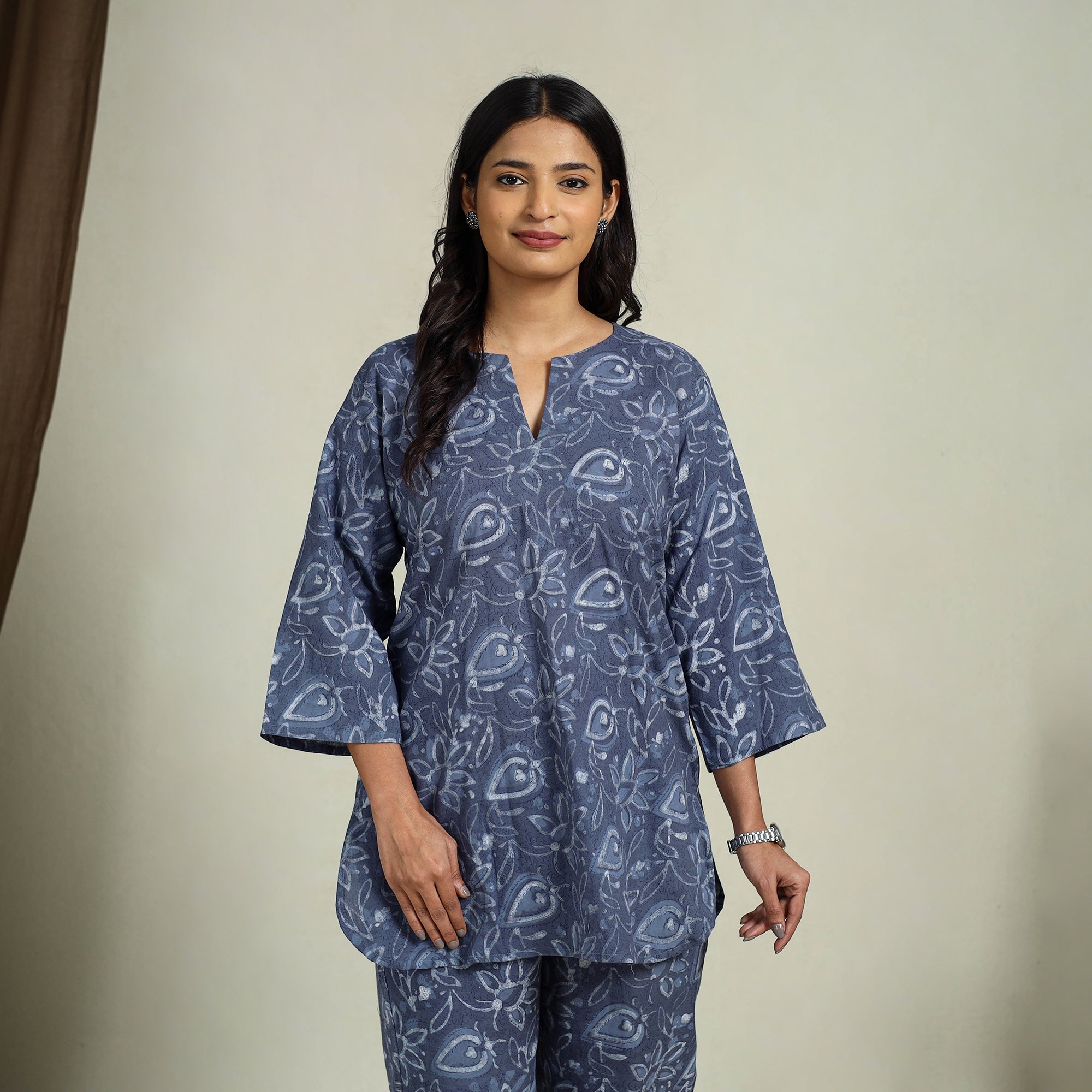 Experience relaxed comfort with this blue bagru cotton night suit set, featuring a hand-block printed top and matching pants with an elasticated waist and convenient side pockets. Crafted from cotton naturally dyed using traditional methods, the fabric offers lasting softness and breathability for a restful night's sleep.