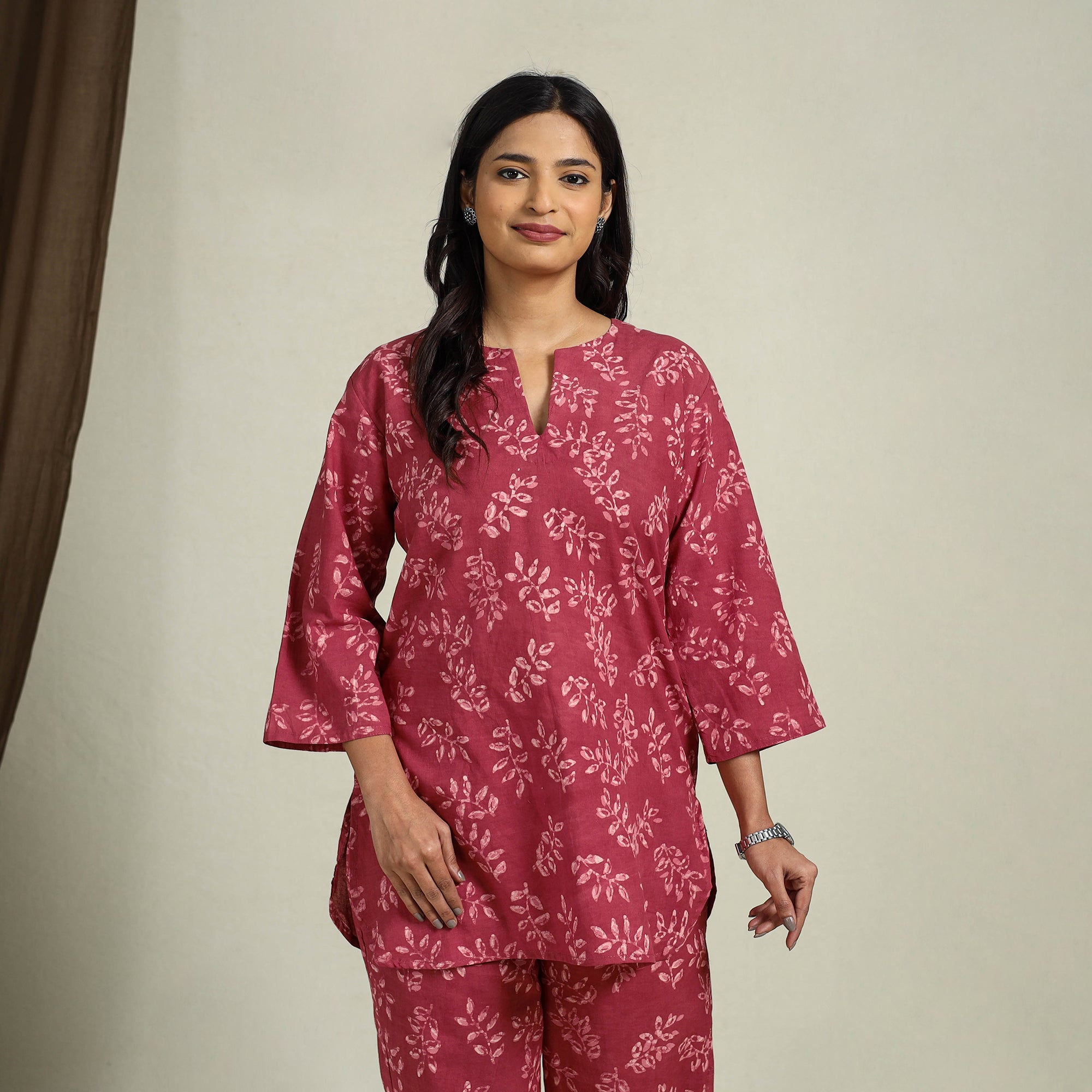 Experience relaxed comfort with this red bagru cotton night suit set, featuring a hand-block printed top and matching pants with an elasticated waist and convenient side pockets. Crafted from cotton naturally dyed using traditional methods, the fabric offers lasting softness and breathability for a restful night's sleep.