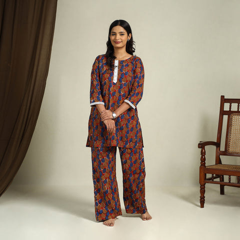Slip into pure comfort with this multicolor bagru cotton night suit set, showcasing an elegant hand-block printed top paired with a palazzo featuring an elasticated waist and handy side pockets. Made from naturally dyed cotton, the fabric offers unmatched softness and breathability, perfect for a peaceful night’s rest.