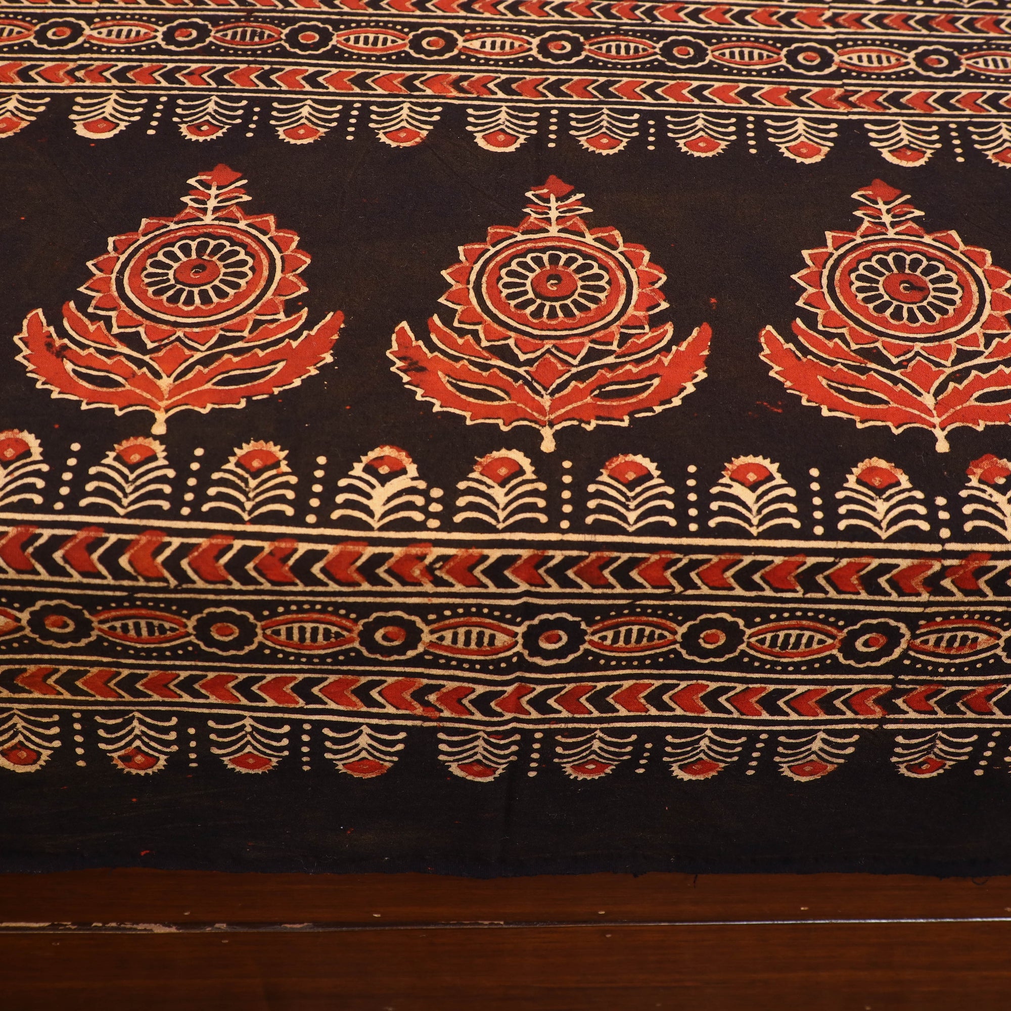 Ajrakh is a well-known traditional vegetable dyeing that resists block-printing techniques on cloth. Originated in Kutch, It is nearly around 4,500 years old practised by Khatri community of Kutch and Sikh.