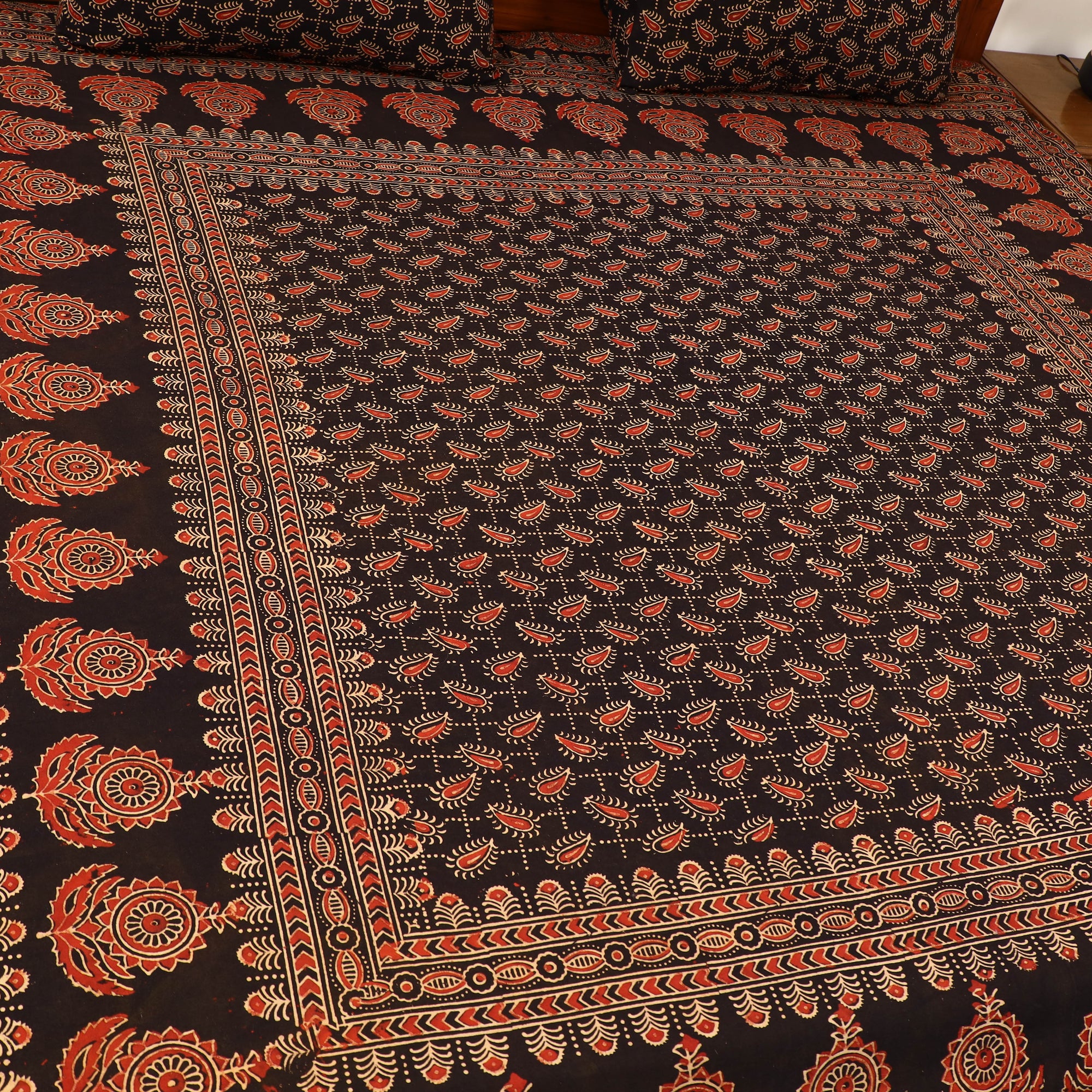 Add a touch of heritage to your home with this black block print cotton double ajrakh bed sheet set, Made by skilled artisans in the Kutch region of Gujarat. The vibrant patterns are created using traditional natural dyes and a resist block-printing technique. It comes with matching pillow covers, making it the perfect addition to any room.