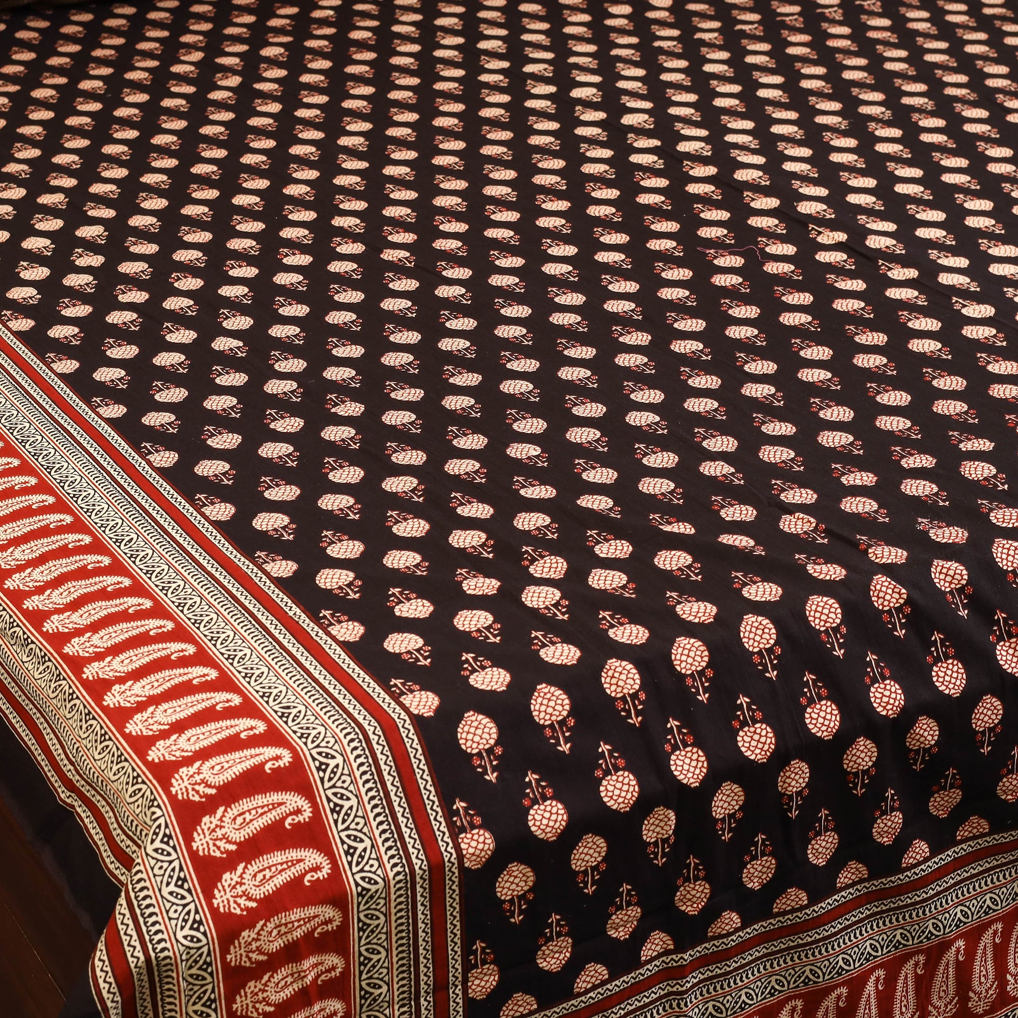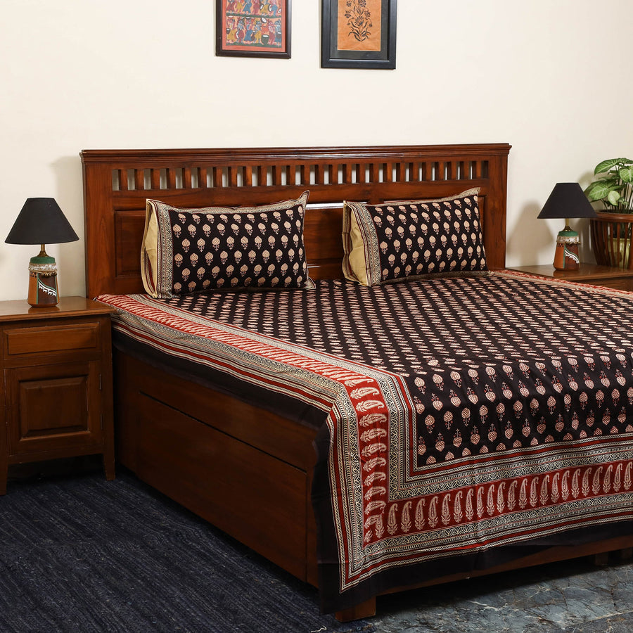 This black cotton double bagru print bedsheet set is crafted by skilled artisans from Rajasthan. The traditional bagru hand block printing technique gives this double bed cover its unique charm, adding a touch of elegance to your space. The set includes two matching pillow covers.
