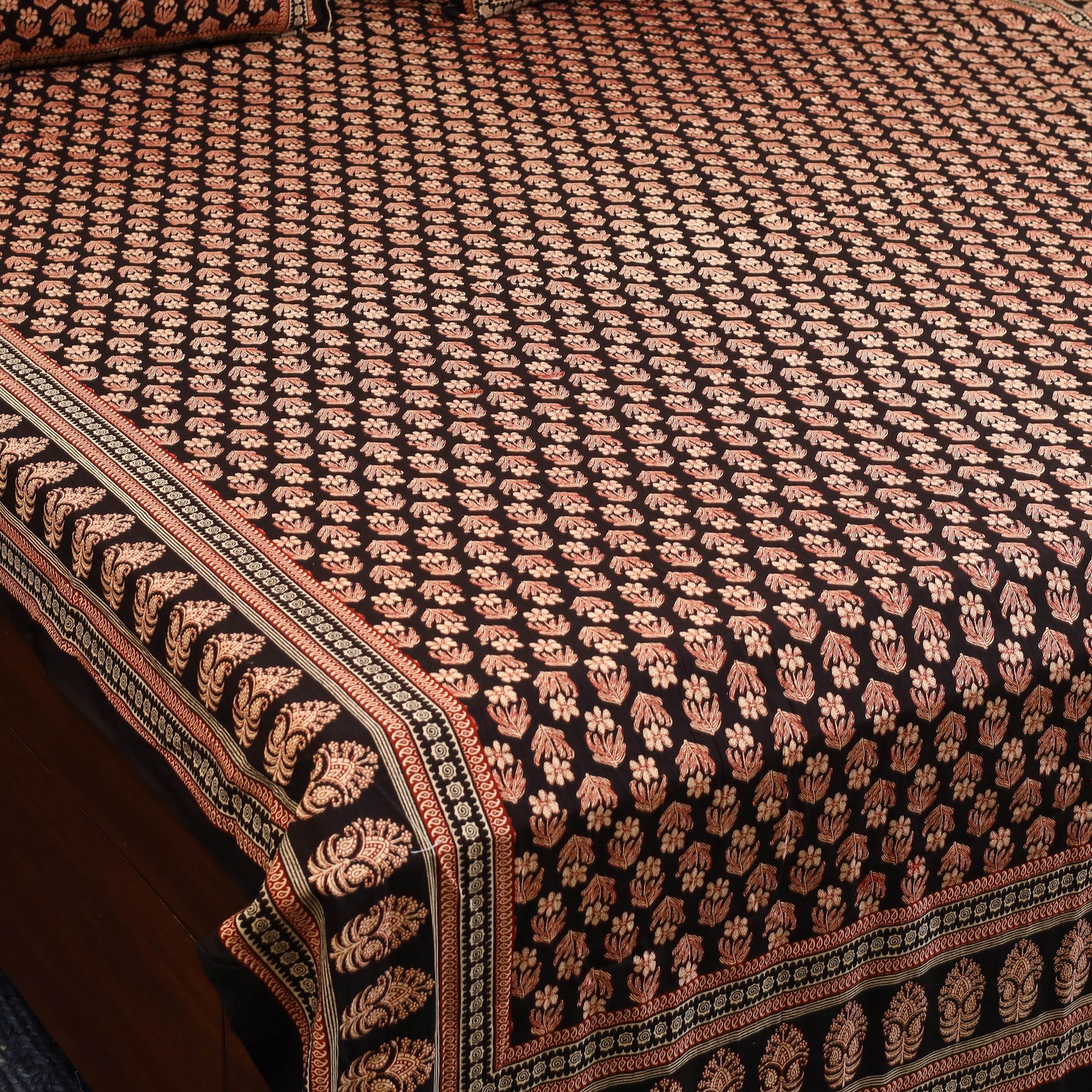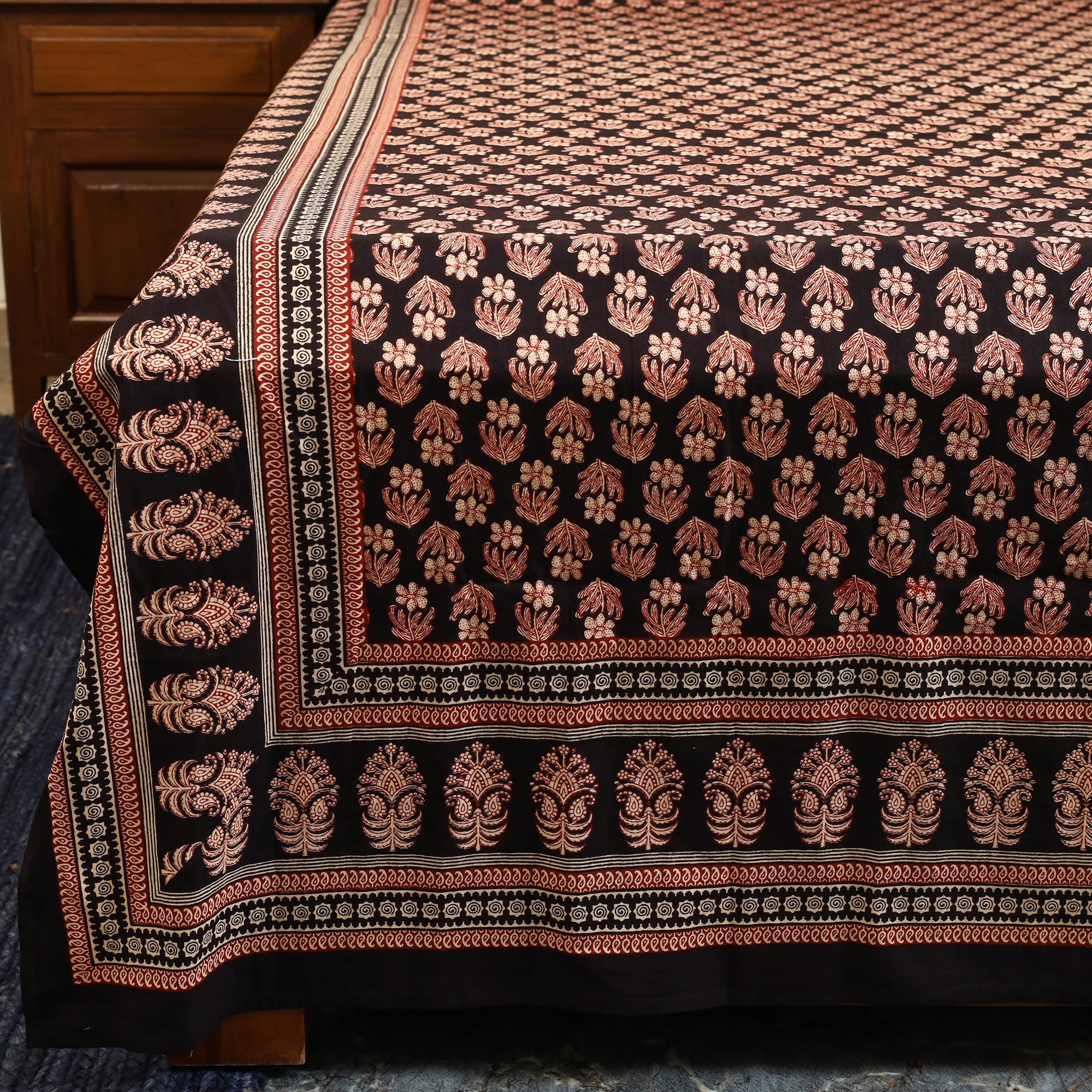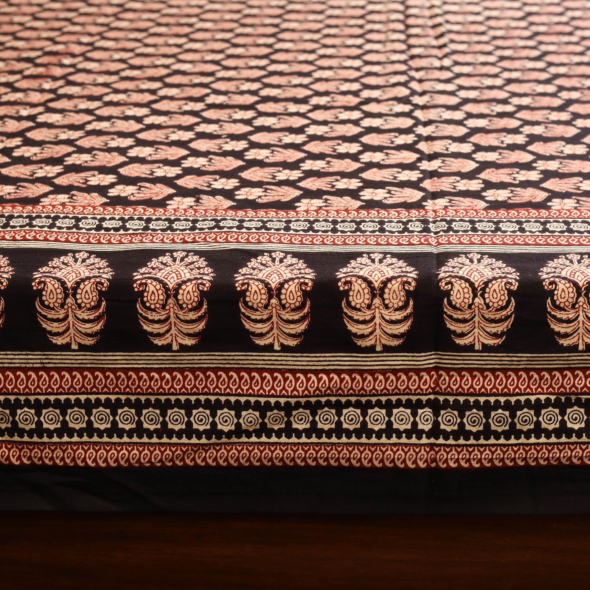 This black cotton double bagru print bedsheet set is crafted by skilled artisans from Rajasthan. The traditional bagru hand block printing technique gives this double bed cover its unique charm, adding a touch of elegance to your space. The set includes two matching pillow covers.