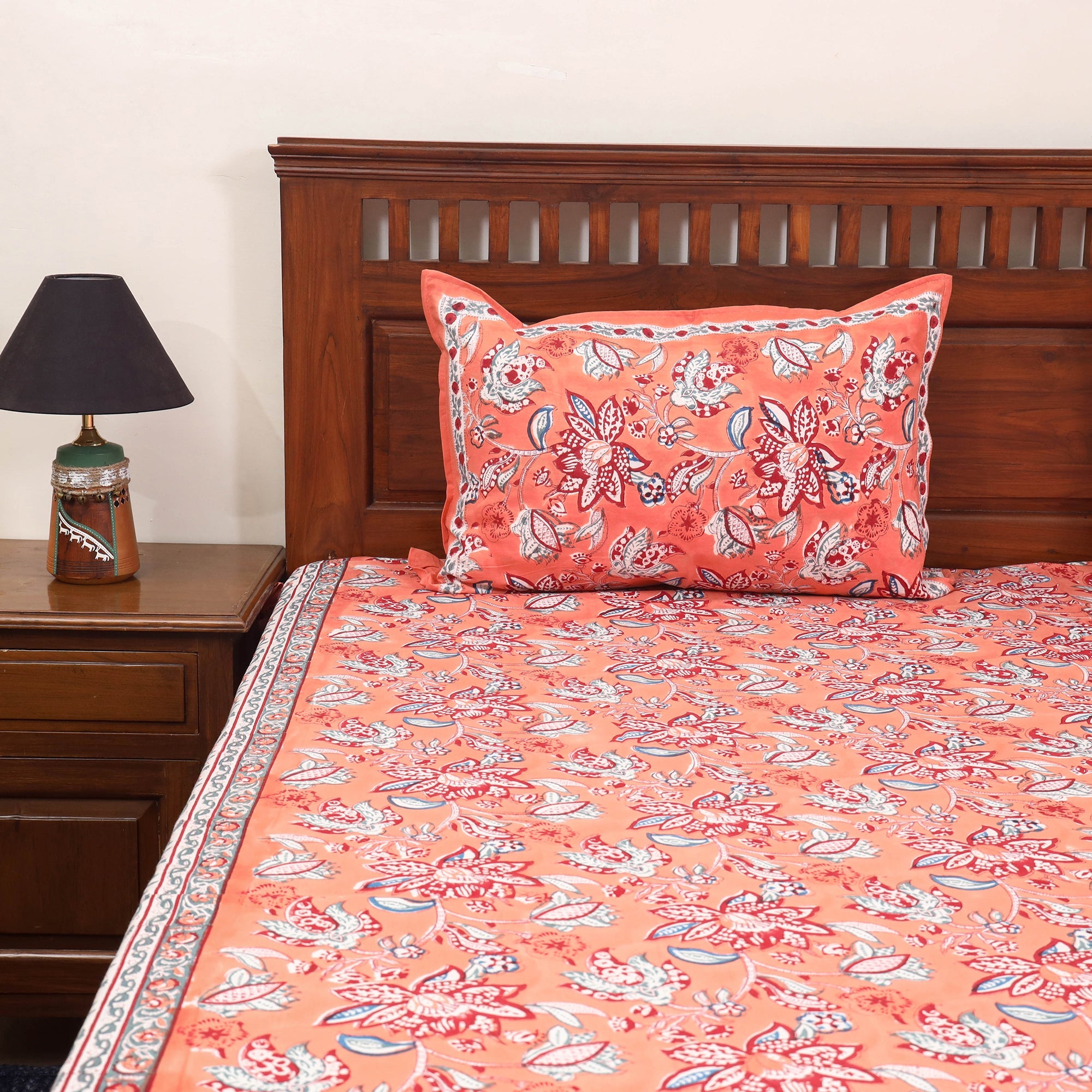 Sanganeri block print cotton bed sheet set, crafted by artisans of Rajasthan. Made using hand block printing techniques with bleed-free VAT dyes it ensures long-lasting vibrancy. Adorned with floral motifs this double bed sheet set includes matching pillow covers for a coordinated and complete look.