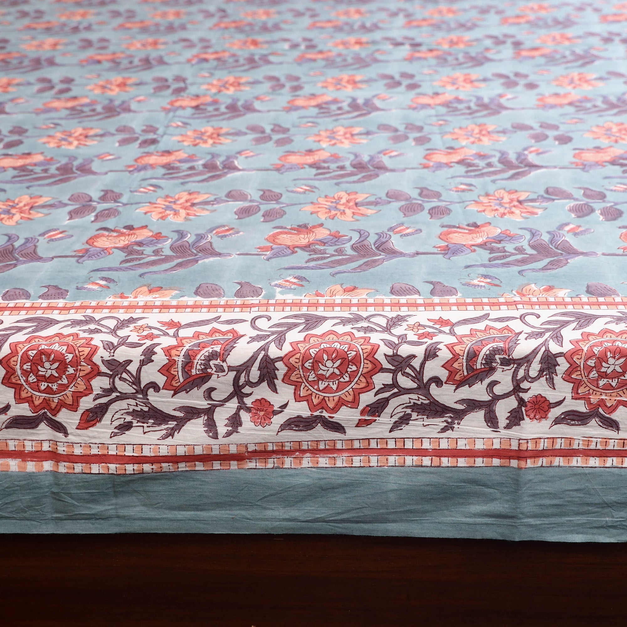 Sanganeri block print cotton bed sheet set, crafted by artisans of Rajasthan. Made using hand block printing techniques with bleed-free VAT dyes it ensures long-lasting vibrancy. Adorned with floral motifs this double bed sheet set includes matching pillow covers for a coordinated and complete look.