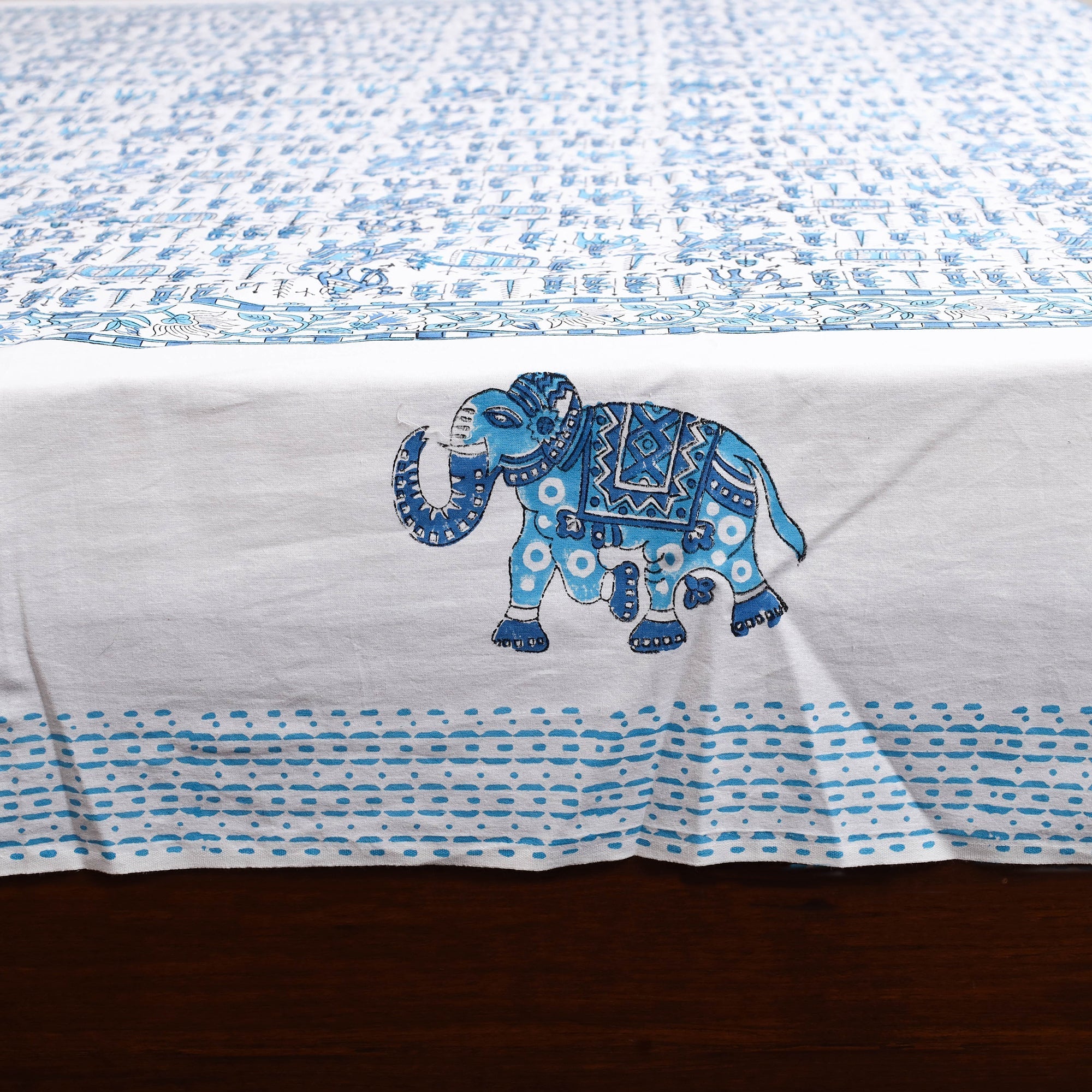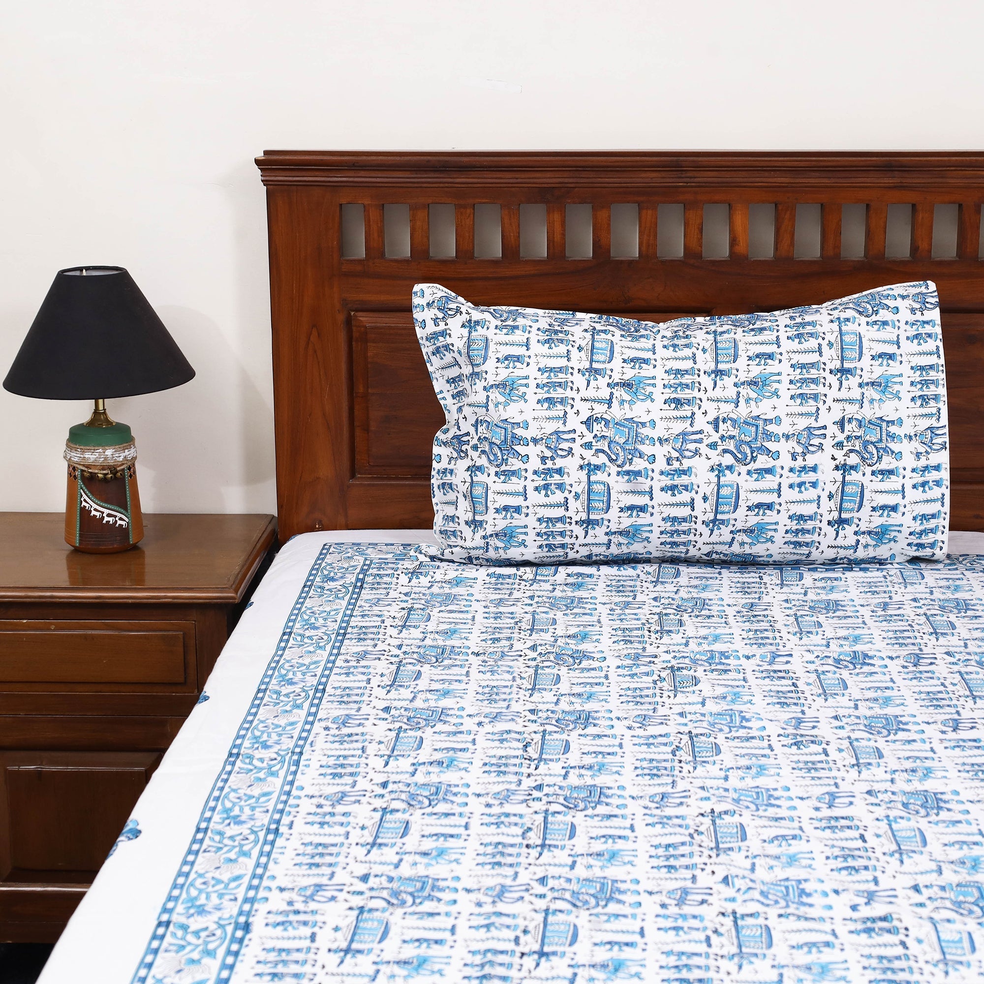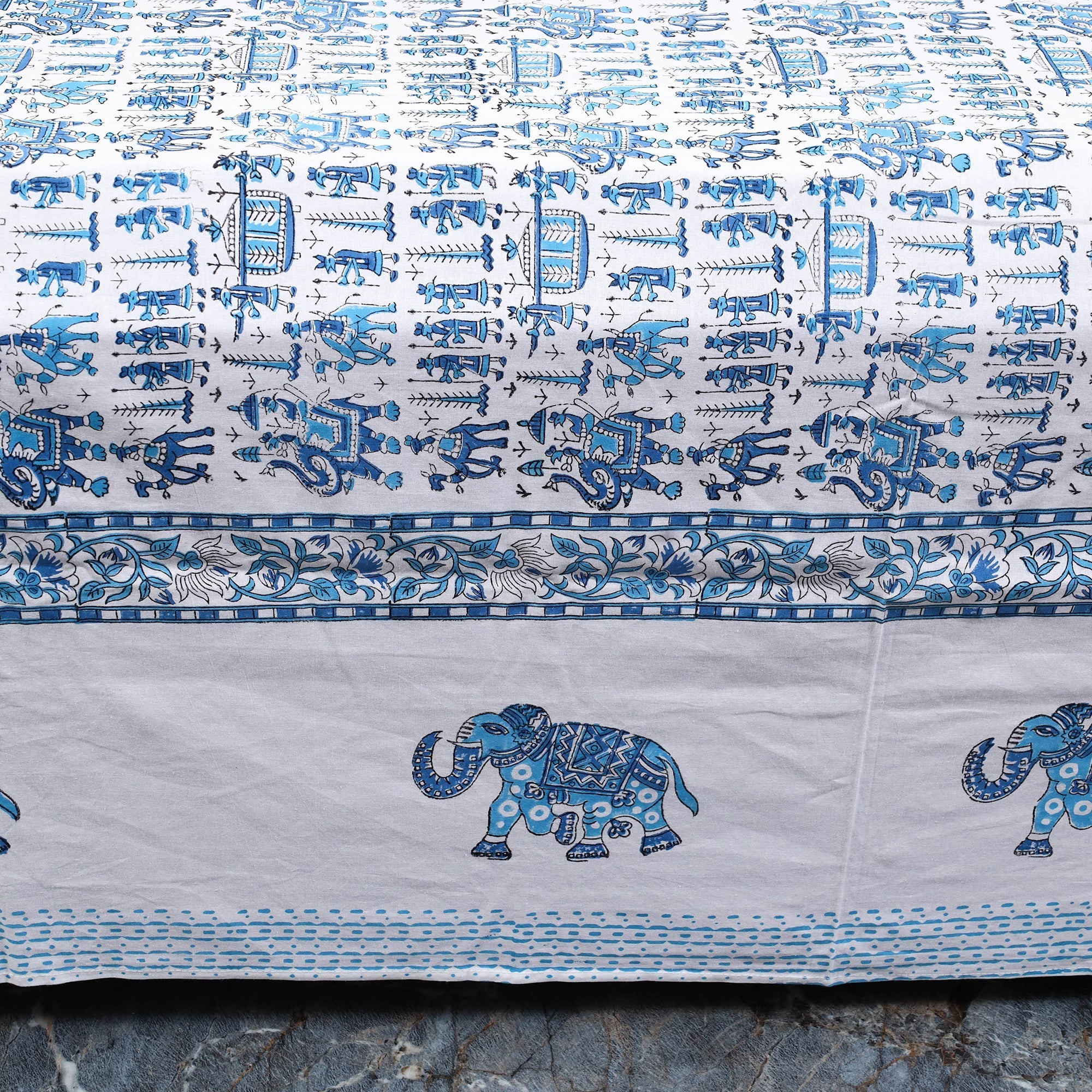 Enhance your bedroom with this blue cotton sanganeri bedsheet, crafted by skilled artisans from Rajasthan. It is made using traditional block printing techniques with bleed-free VAT dyes, ensuring long-lasting vibrancy. Featuring lively floral motifs, this double bedsheet set comes with matching pillow covers for a coordinated and stylish look.