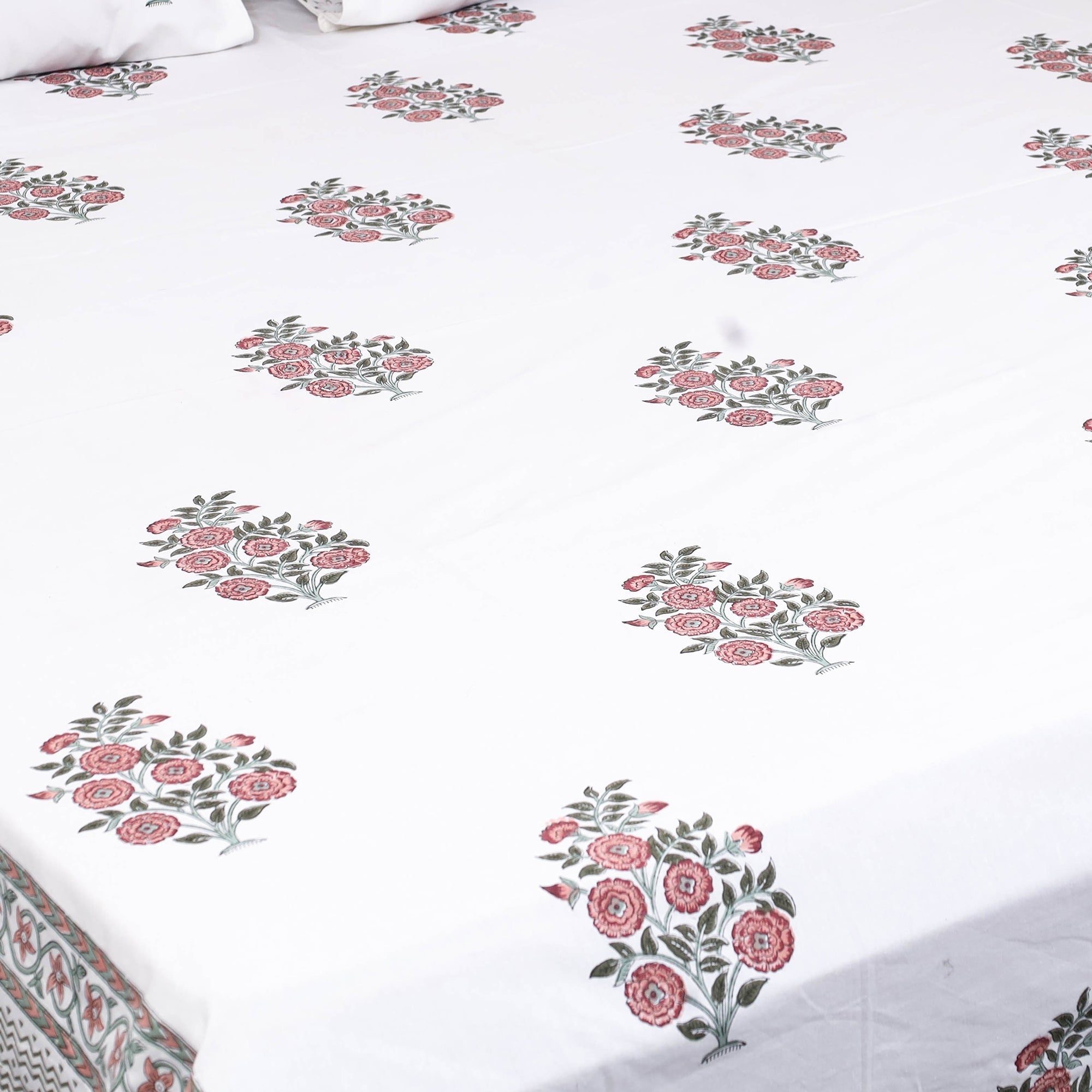 Enhance your bedroom with this white cotton sanganeri bedsheet, crafted by skilled artisans from Rajasthan. It is made using traditional block printing techniques with bleed-free VAT dyes, ensuring long-lasting vibrancy. Featuring lively floral motifs, this double bedsheet set comes with matching pillow covers for a coordinated and stylish look.