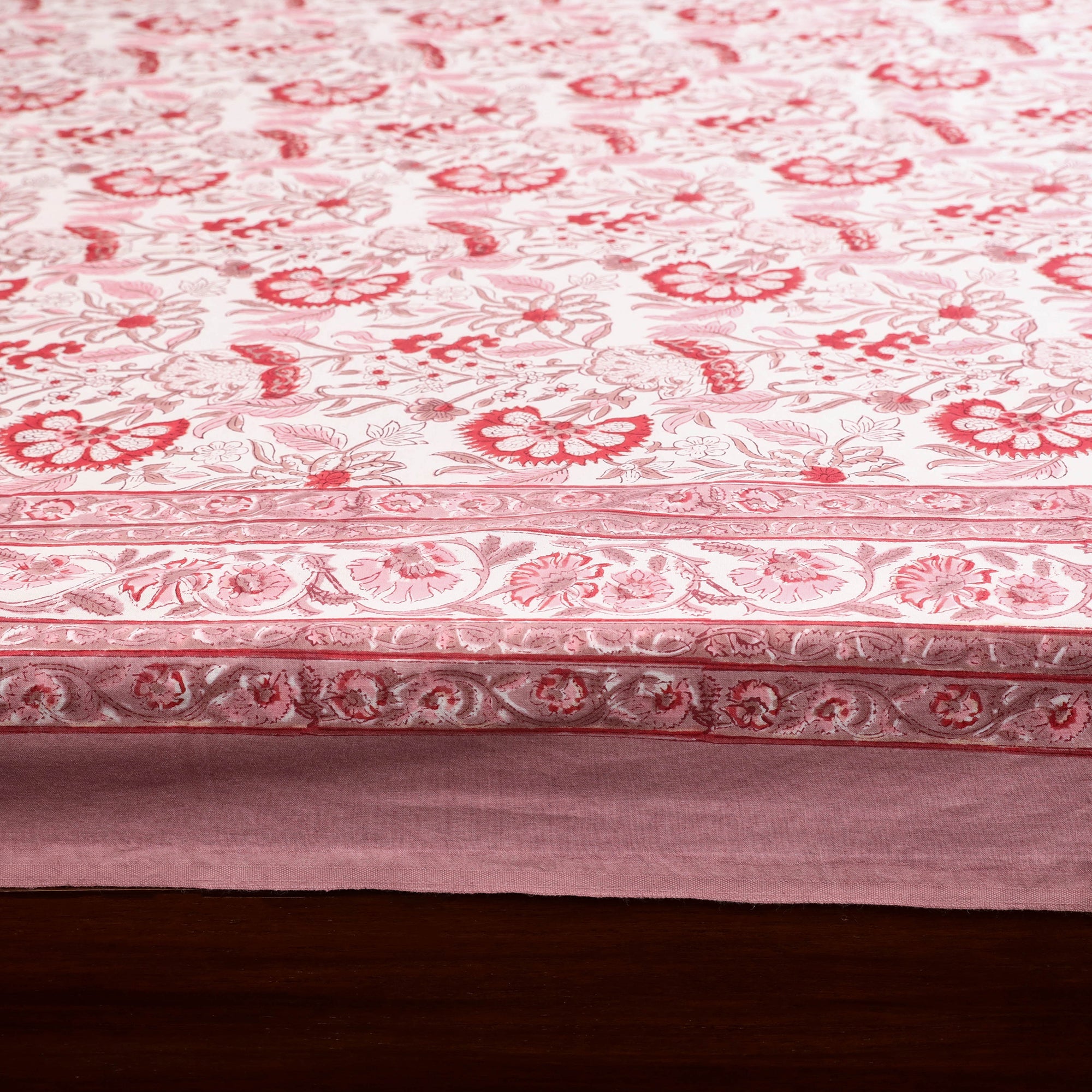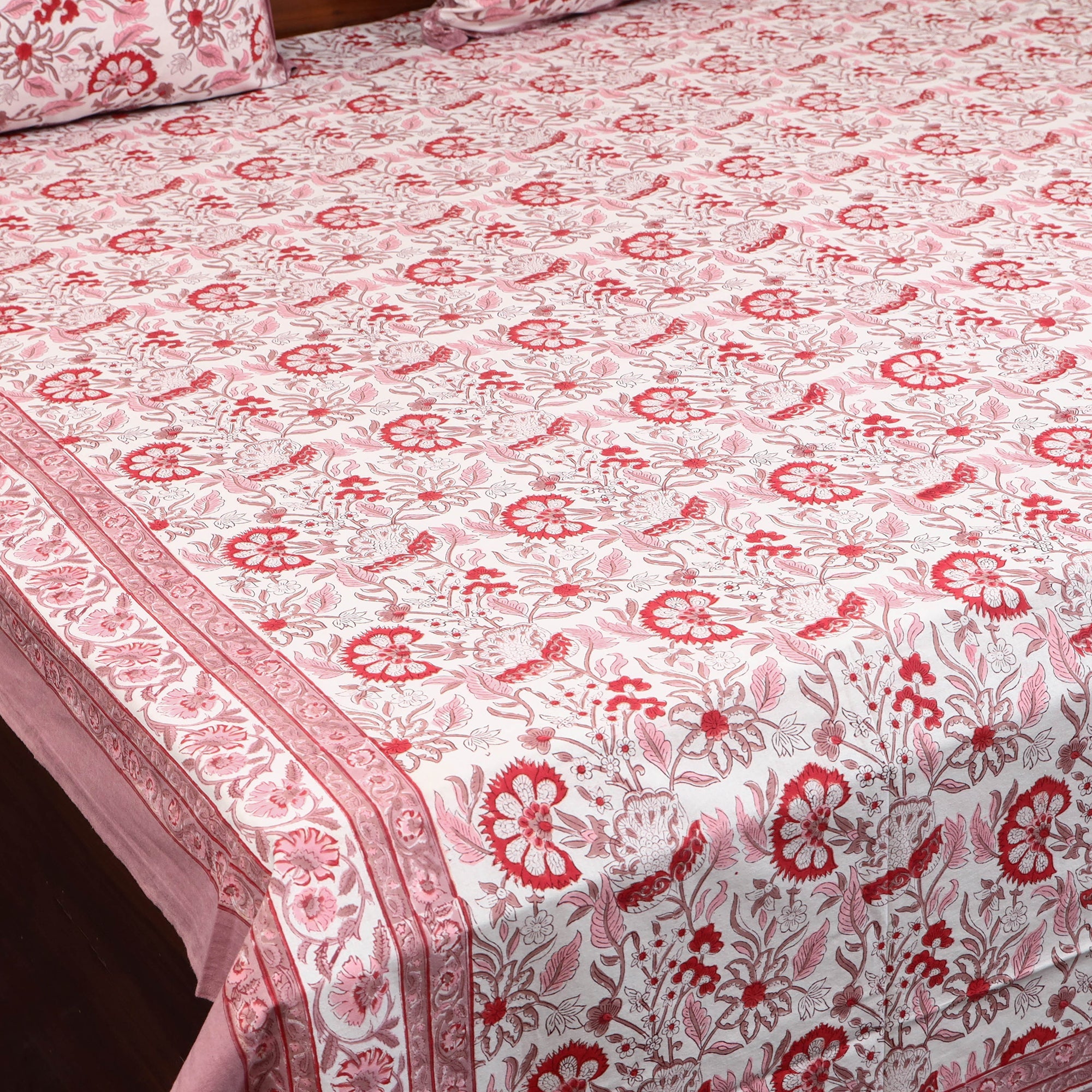 Sanganeri block print cotton bed sheet set, crafted by artisans of Rajasthan. Made using hand block printing techniques with bleed-free VAT dyes it ensures long-lasting vibrancy. Adorned with floral motifs this double bed sheet set includes matching pillow covers for a coordinated and complete look.