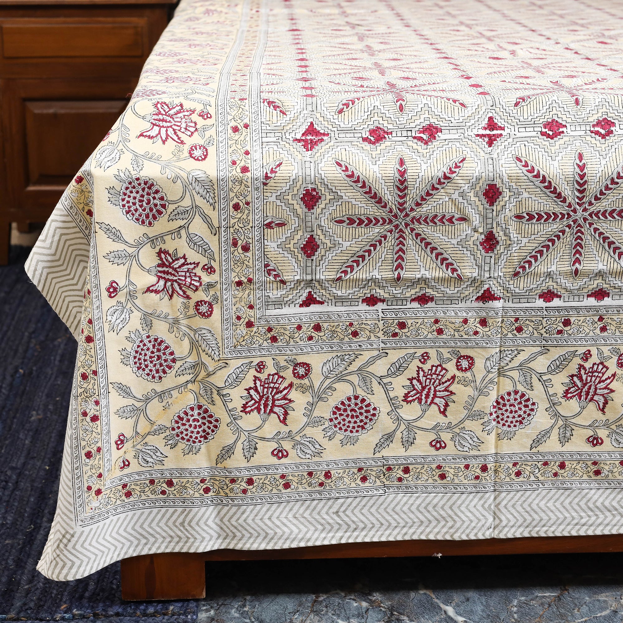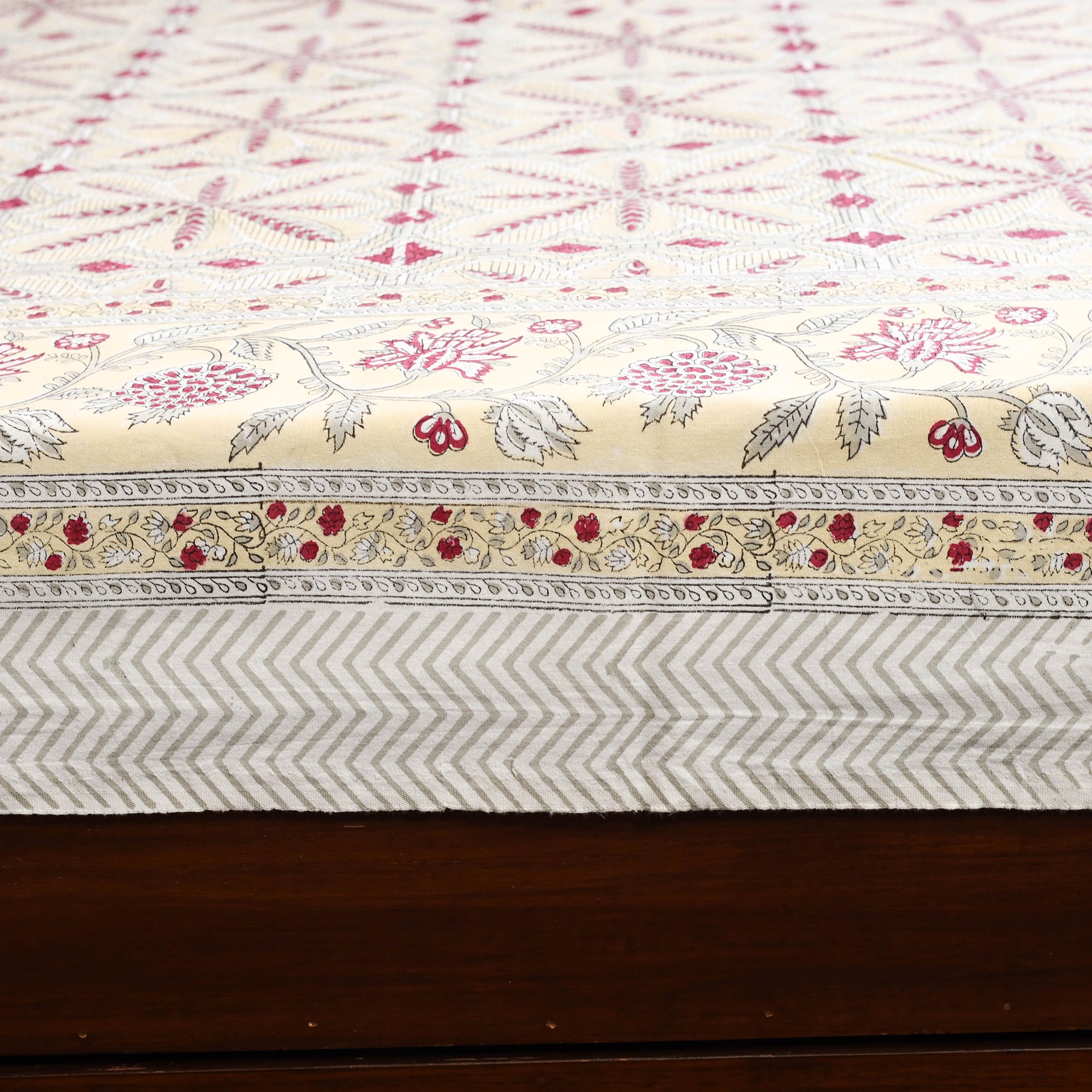 Enhance your bedroom with this beige cotton sanganeri print bedsheet, crafted by artisans of Rajasthan. Made using traditional block-printing techniques with bleed-free VAT dyes, it ensures long-lasting vibrancy. Adorned with lively floral motifs, this double bedsheet set includes matching pillow covers for a coordinated and elegant look.