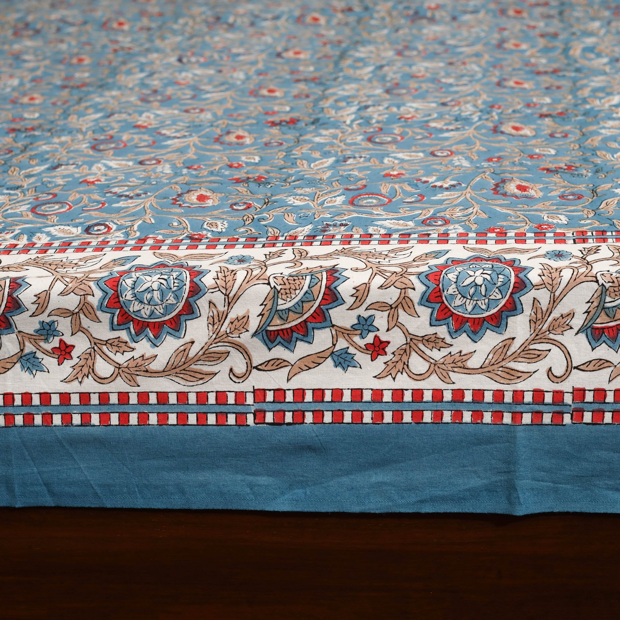 Enhance your bedroom with this blue cotton sanganeri print bedsheet, crafted by artisans of Rajasthan. Made using traditional block-printing techniques with bleed-free VAT dyes, it ensures long-lasting vibrancy. Adorned with lively floral motifs, this double bedsheet set includes matching pillow covers for a coordinated and elegant look.