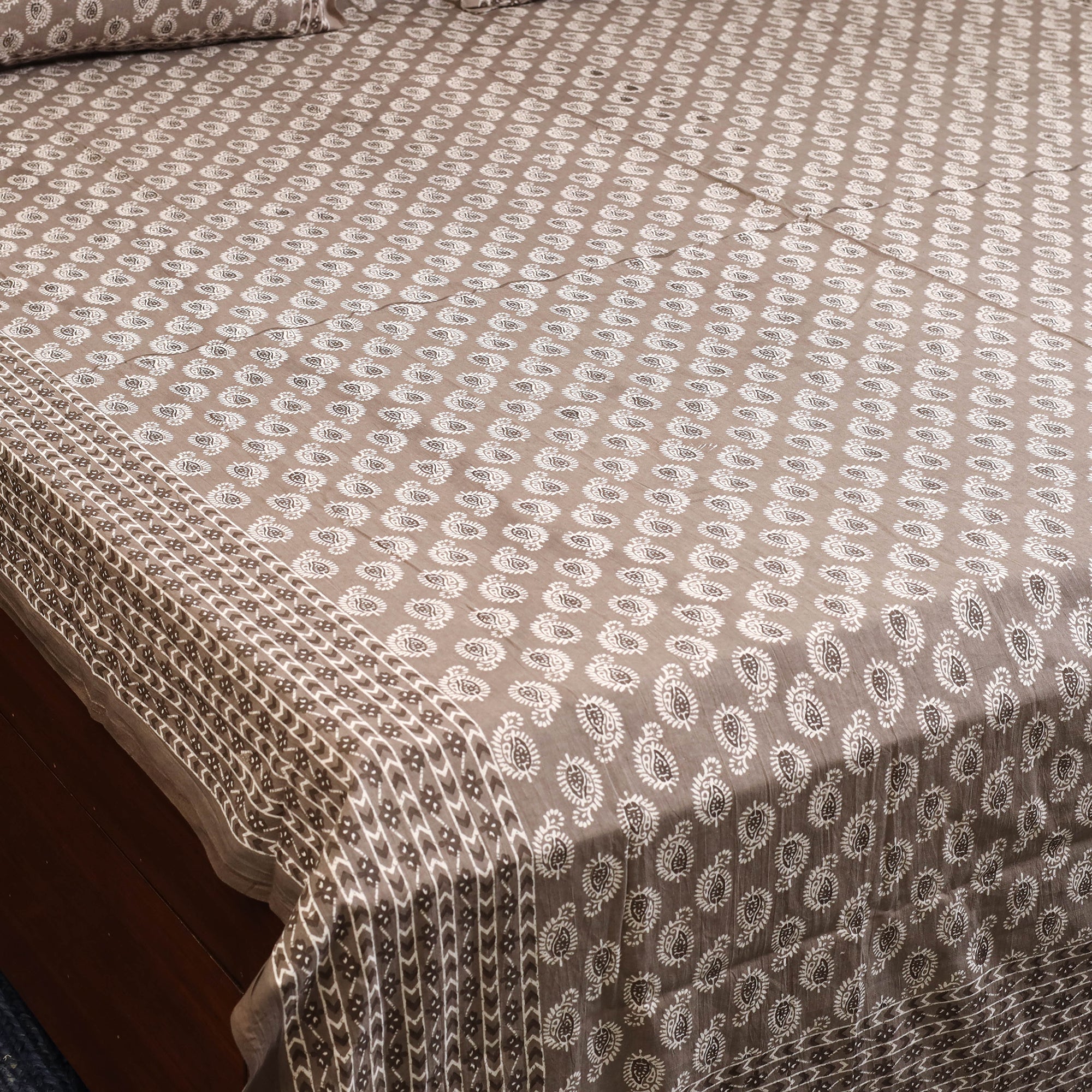 Enhance your bedroom with this brown cotton sanganeri print bedsheet, crafted by skilled artisans from Rajasthan. It is made using traditional block printing techniques with bleed-free VAT dyes, ensuring long-lasting vibrancy. Featuring lively floral motifs, this double bedsheet set comes with matching pillow covers for a coordinated and stylish look.