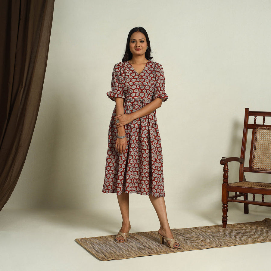 Traditional red bagru block printing flared dress. Made from naturally dyed cotton fabric, it’s soft, breathable, and designed to keep you comfortable while enhancing your ethnic style.
