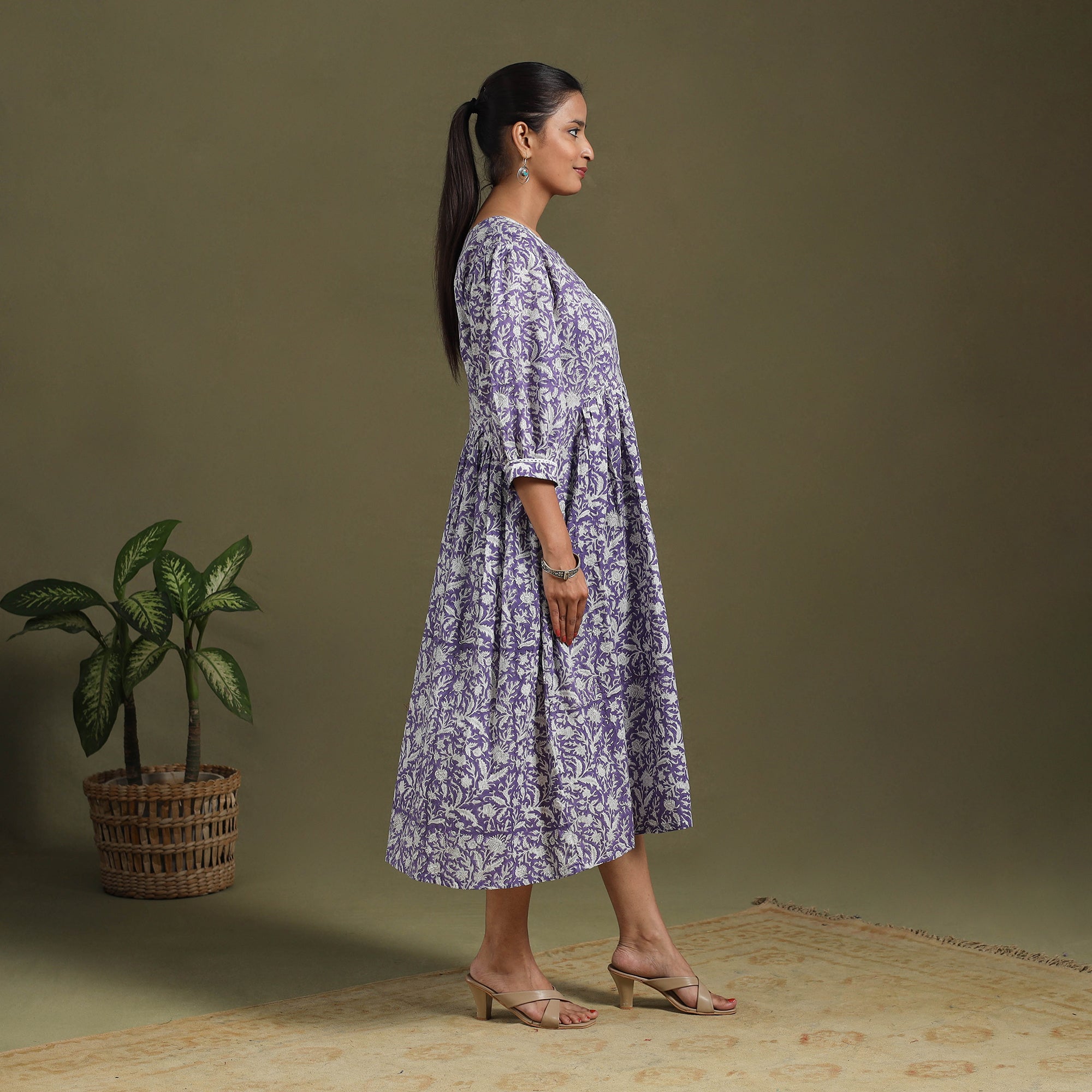 This purple sanganeri cotton dress blends traditional block printing with everyday comfort. Featuring vibrant floral motifs from Rajasthan, it is light, breathable, and perfect for all-day wear. The flared silhouette and delicate lacework add an elegant touch, making it ideal for casual outings, office wear, or relaxed gatherings.