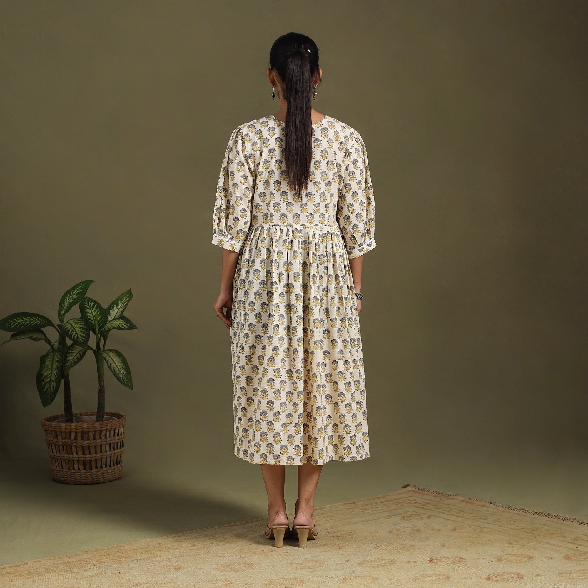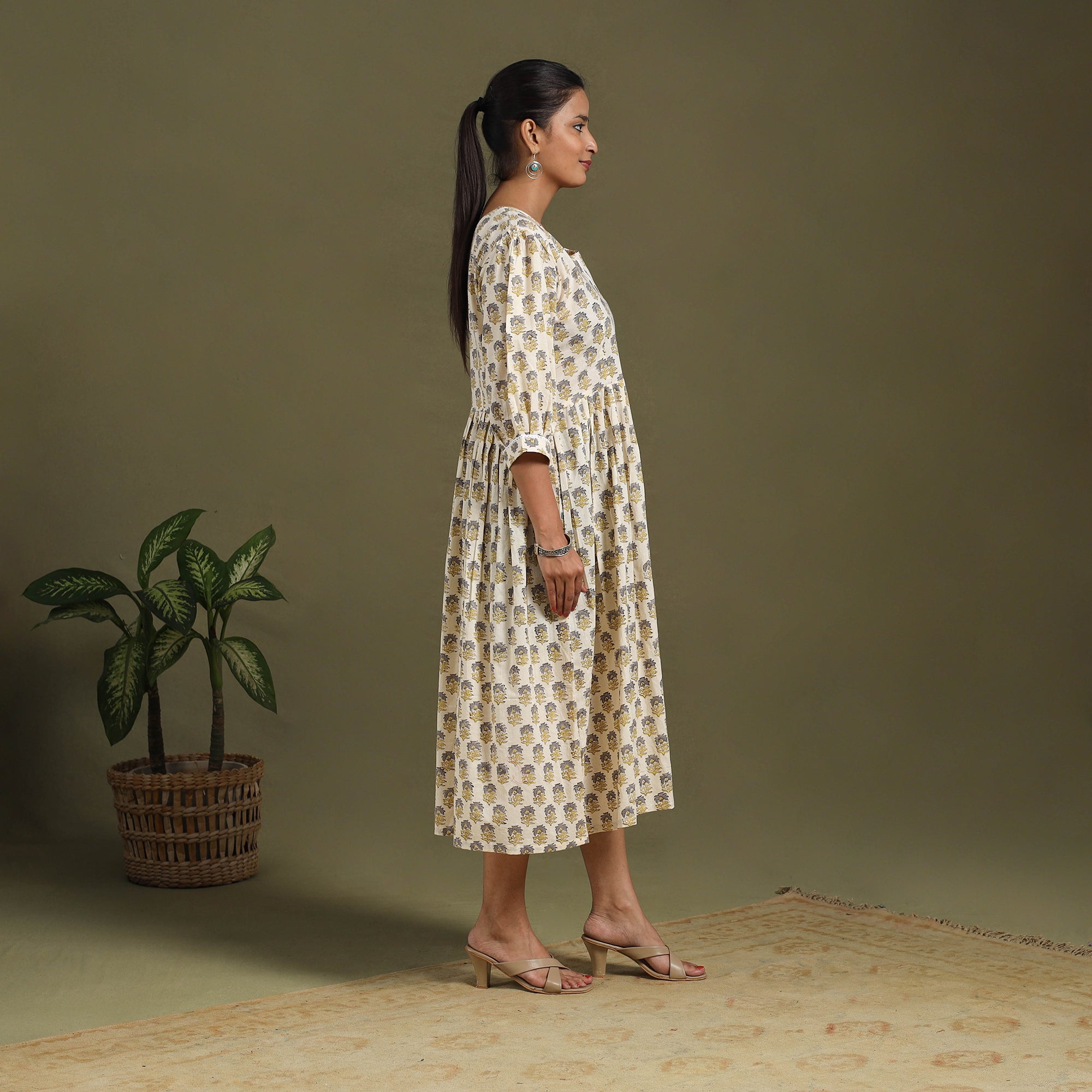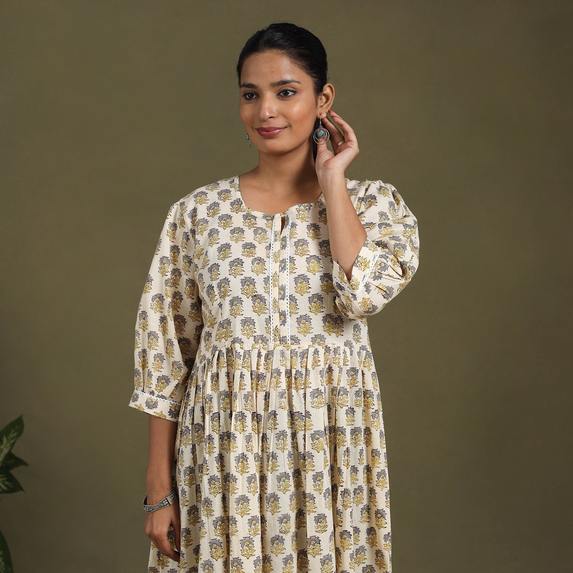 This beige sanganeri cotton dress blends traditional block printing with everyday comfort. Featuring vibrant floral motifs from Rajasthan, it is light, breathable, and perfect for all-day wear. The flared silhouette and delicate lacework add an elegant touch, making it ideal for casual outings, office wear, or relaxed gatherings.