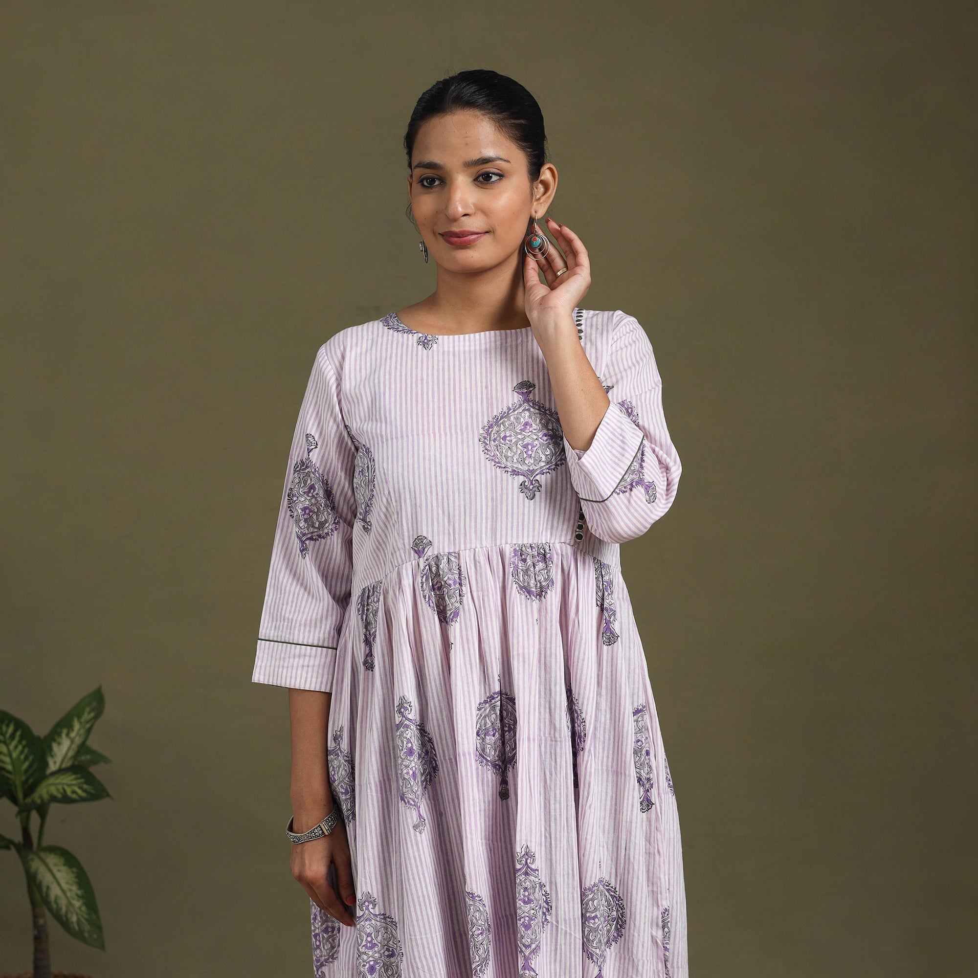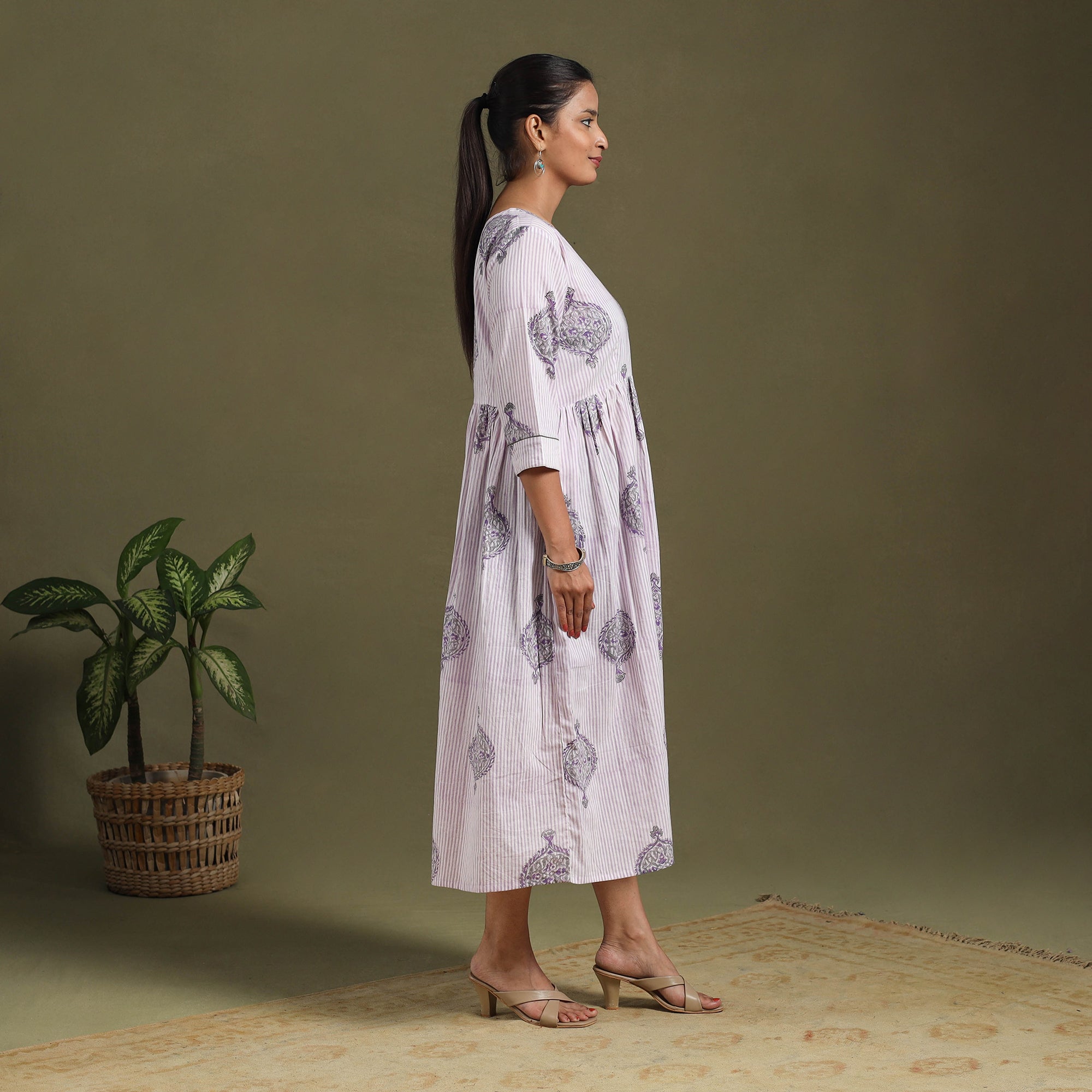 This white sanganeri cotton dress blends traditional block printing with everyday ease. Adorned with vibrant floral motifs from Rajasthan, it is light, breezy, and comfortable for all-day wear, while the graceful flared design adds charm. Perfect for casual outings, office wear, or relaxed gatherings.