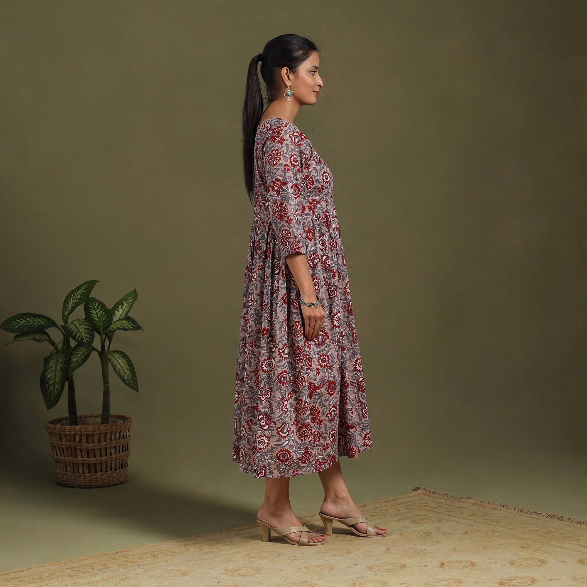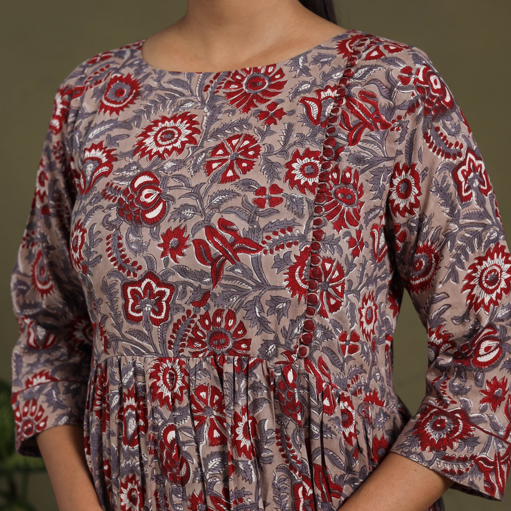 This brown sanganeri cotton dress blends traditional block printing with everyday ease. Adorned with vibrant floral motifs from Rajasthan, it is light, breezy, and comfortable for all-day wear, while the graceful flared design adds charm. Perfect for casual outings, office wear, or relaxed gatherings.