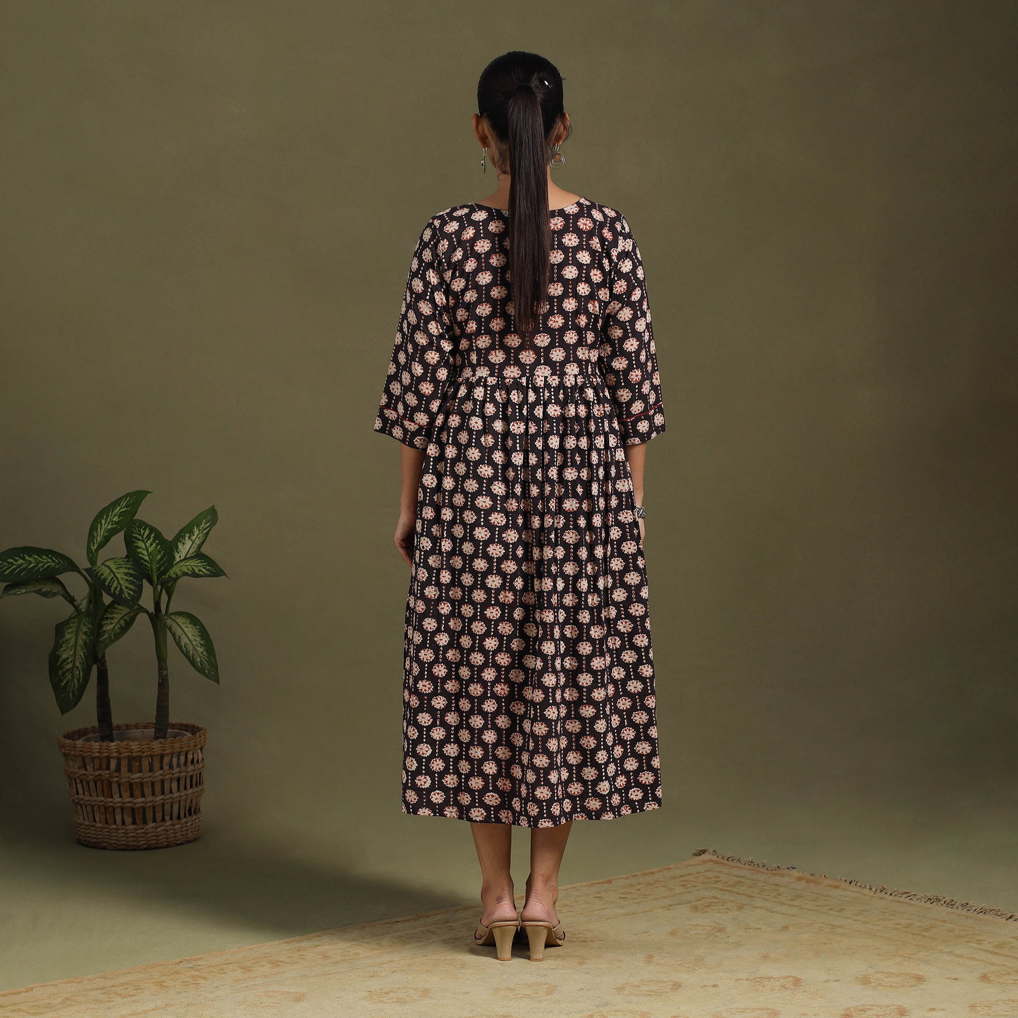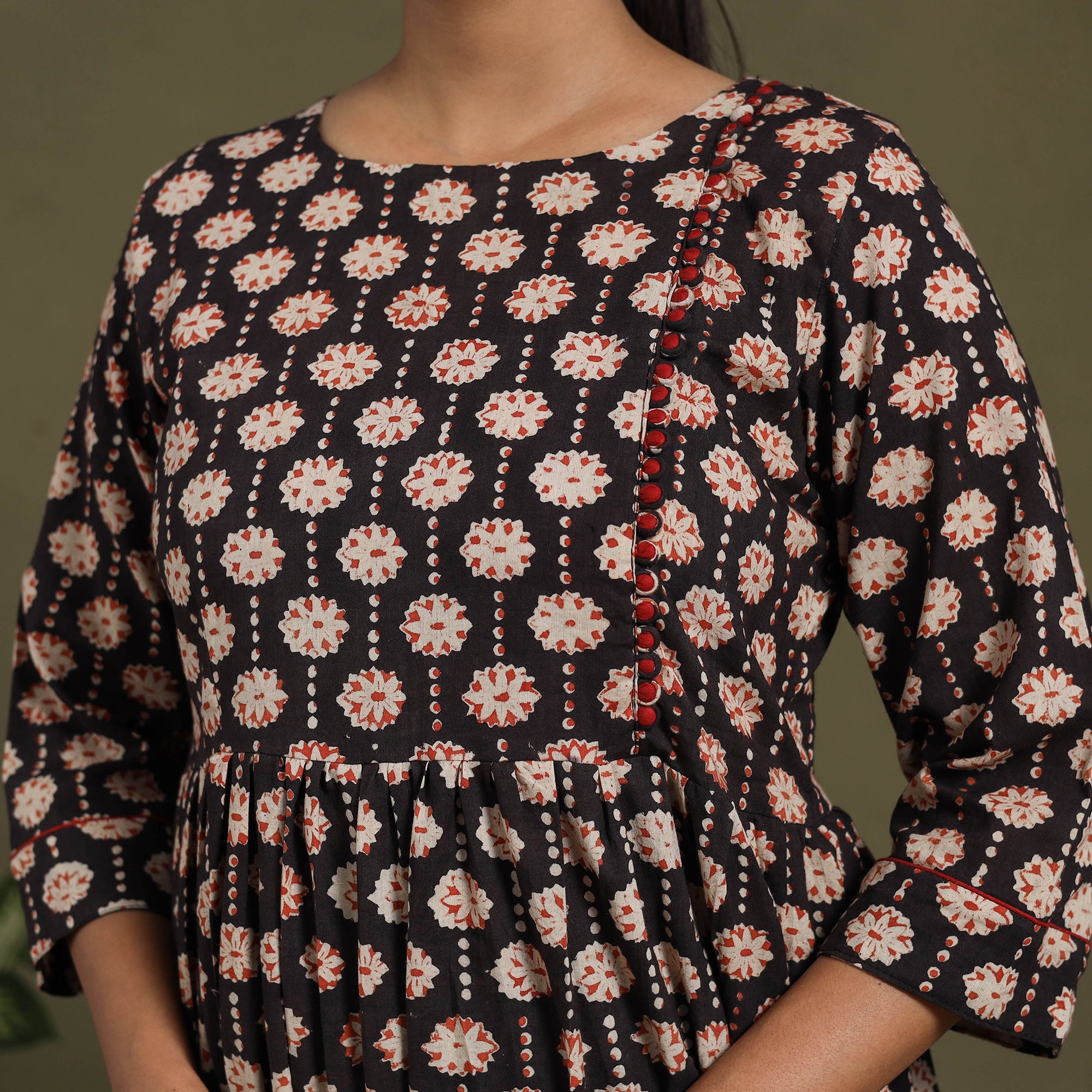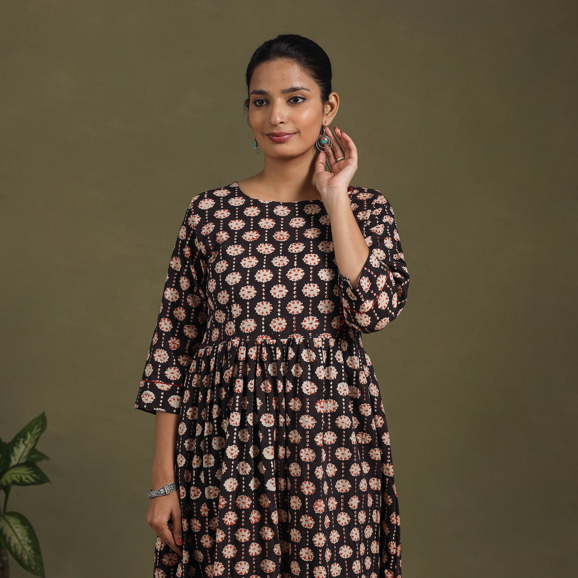 This black sanganeri cotton dress blends traditional block printing with everyday ease. Adorned with vibrant floral motifs from Rajasthan, it is light, breezy, and comfortable for all-day wear, while the graceful flared design adds charm. Perfect for casual outings, office wear, or relaxed gatherings.