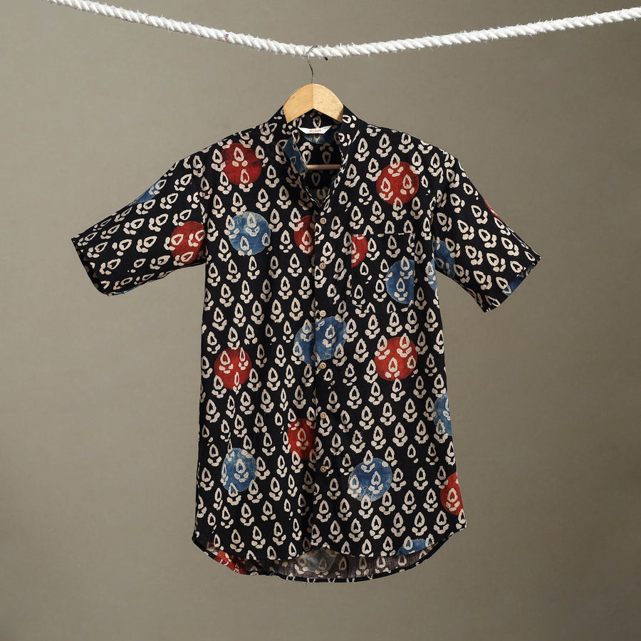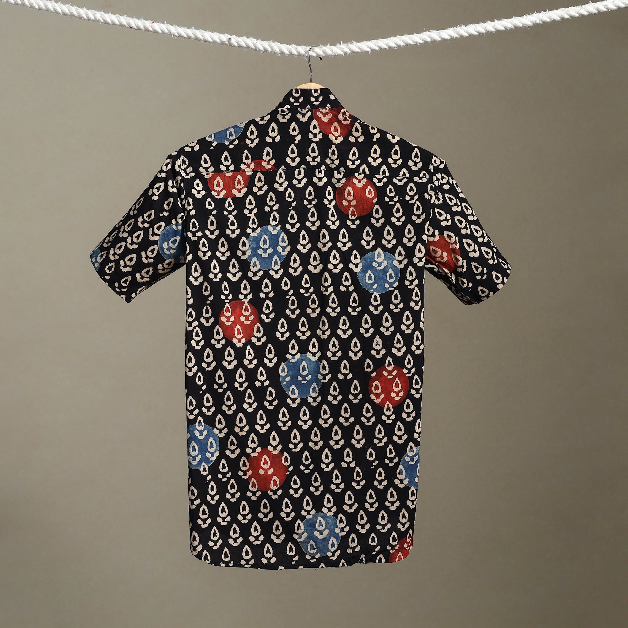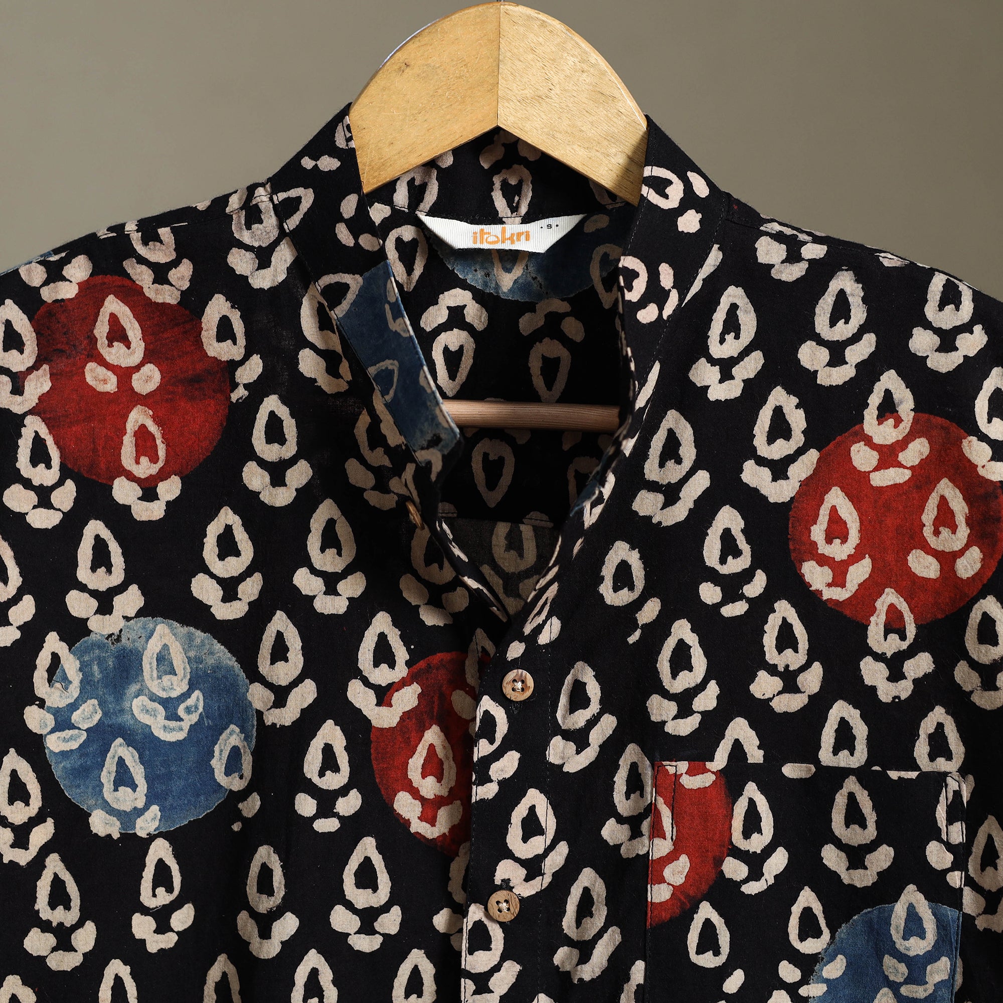 This black ajrakh printed men’s shirt is made from soft, pure cotton and natural dyed using traditional methods. The earthy wooden buttons and front patch pocket elevate the design with rustic appeal. Whether you're headed to a casual brunch or a casual hangouts, it brings heritage and comfort together effortlessly.