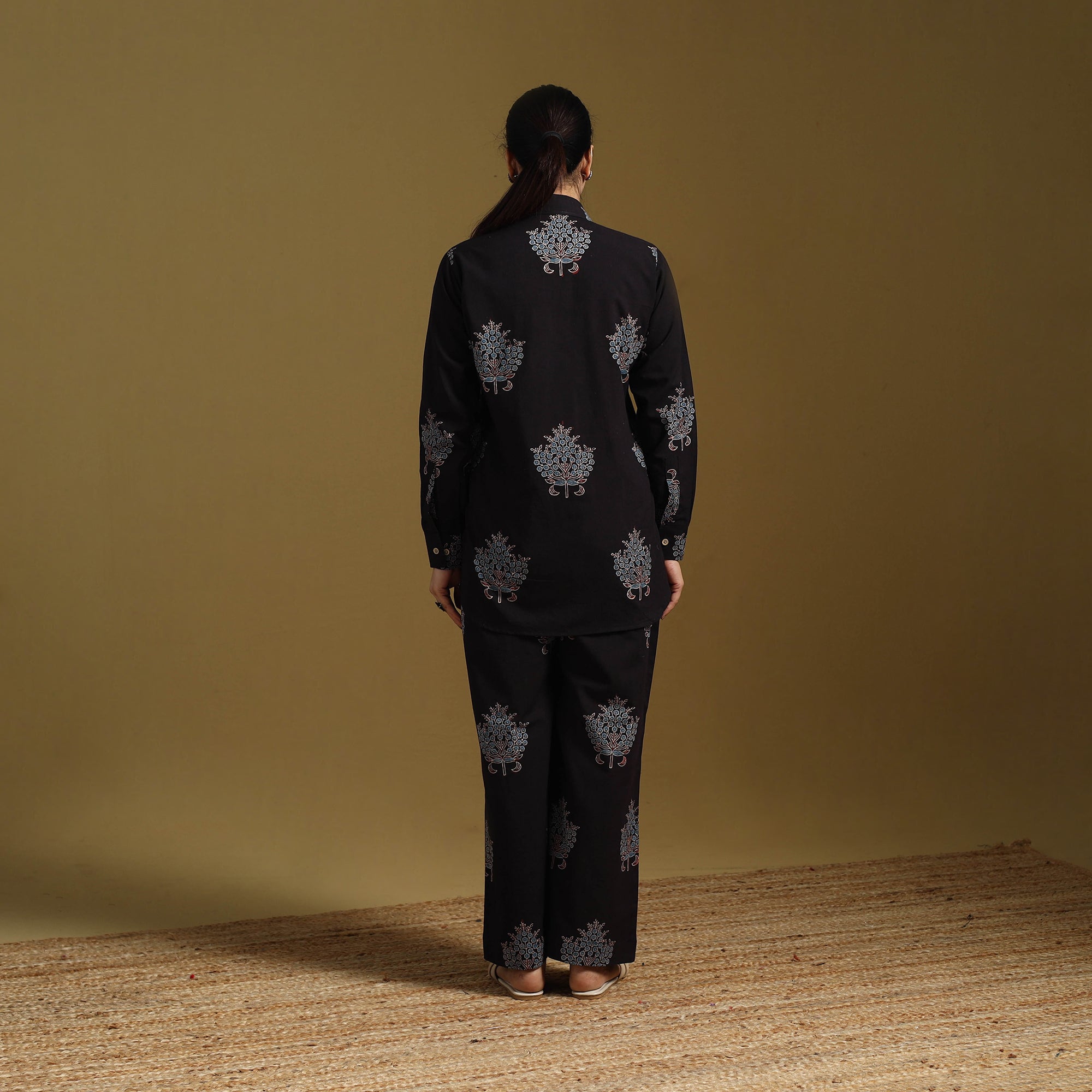 Stay stylish in this black ajrakh co-ord set featuring traditional Kutch block printing. Crafted from breathable, naturally dyed cotton, the set includes a relaxed-fit top with a front button placket and palazzo with an elasticated waistband and convenient side pockets. Perfect for brunches or cultural gatherings, this ensemble exudes effortless charm for every occasion.