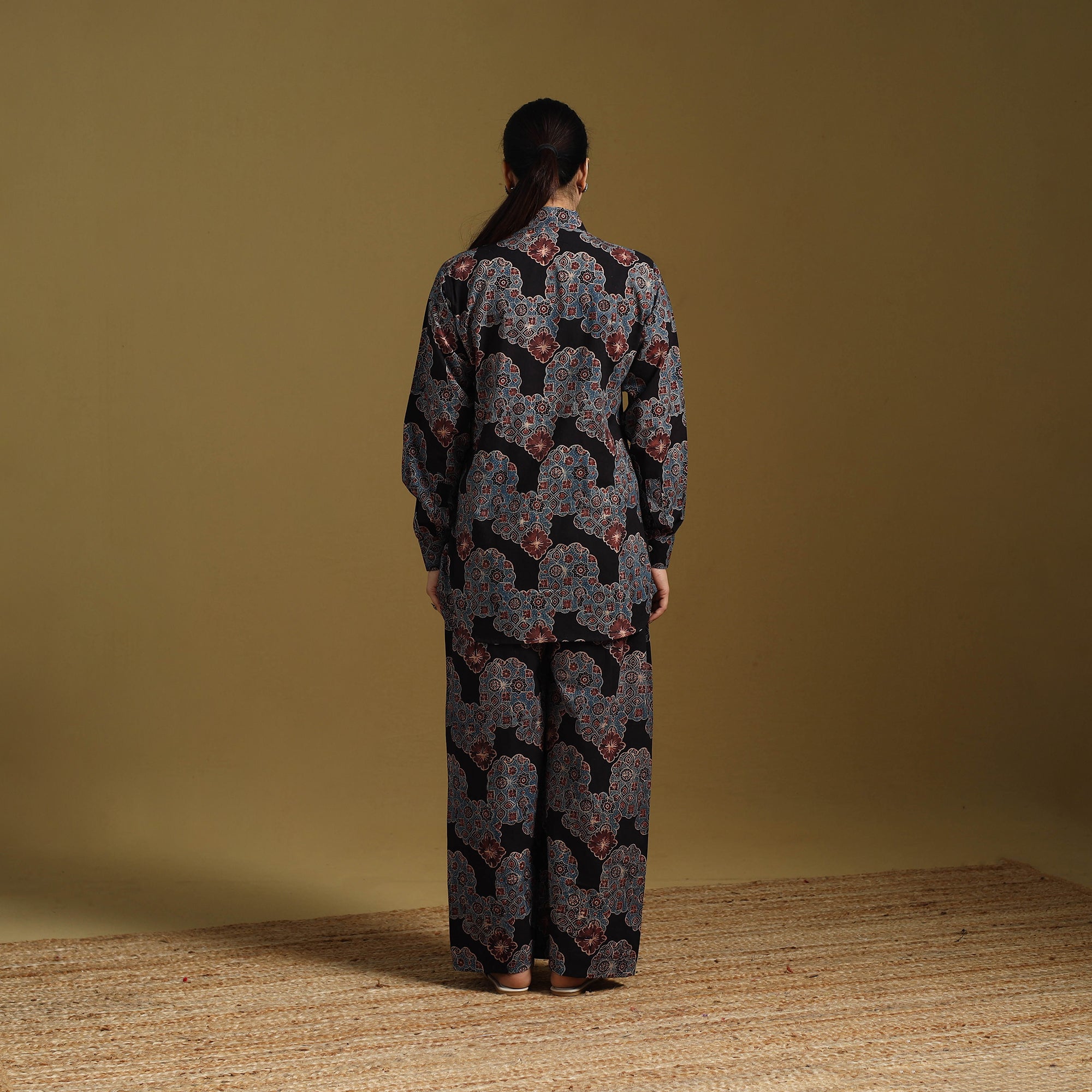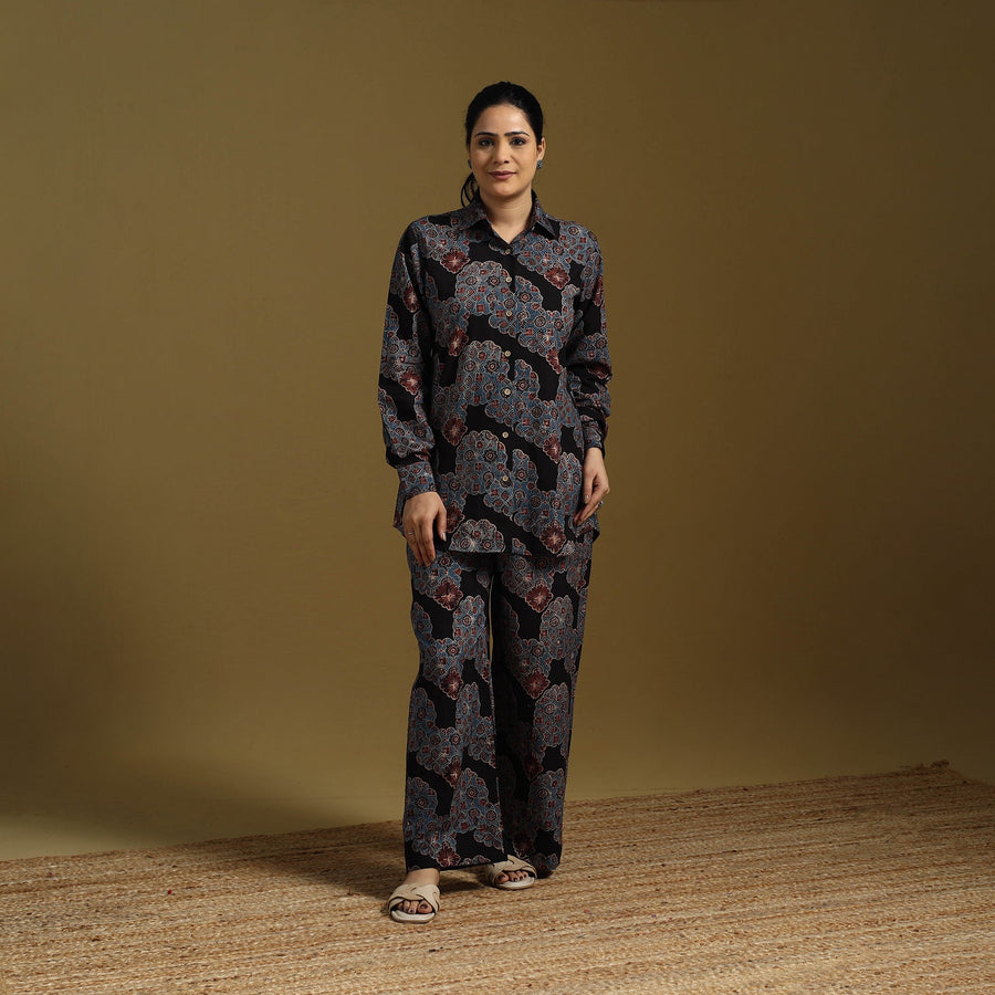 Stay stylish in this black ajrakh co-ord set featuring traditional Kutch block printing. Crafted from breathable, naturally dyed cotton, the set includes a relaxed-fit top with a front button placket and palazzo with an elasticated waistband and convenient side pockets. Perfect for brunches or cultural gatherings, this ensemble exudes effortless charm for every occasion.