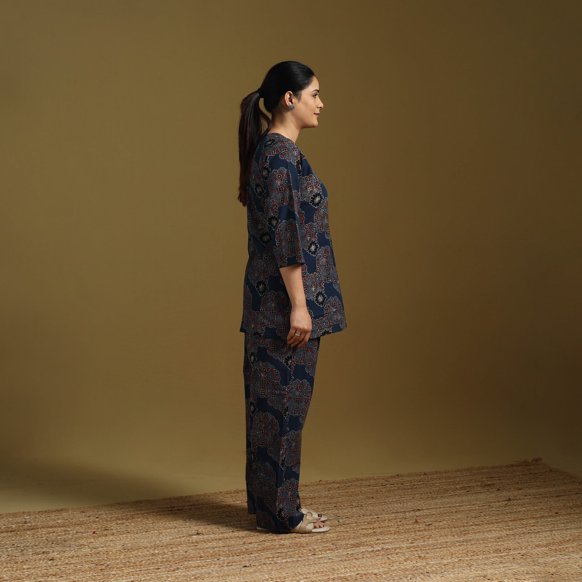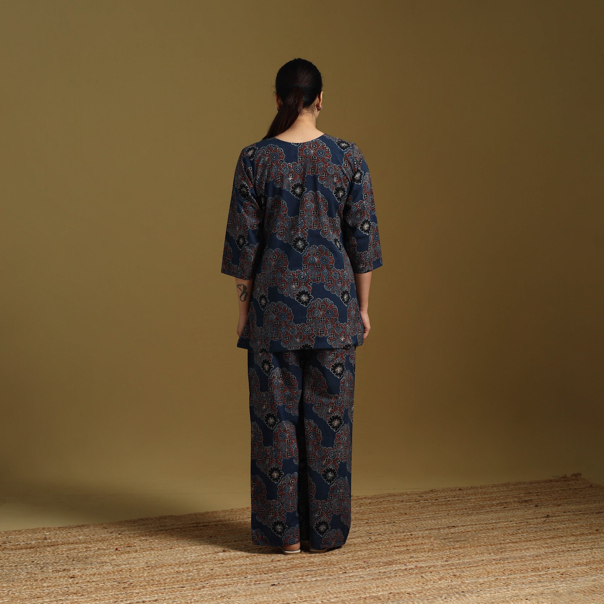 Stay stylish in this blue ajrakh co-ord set featuring traditional Kutch block printing. Crafted from breathable, naturally dyed cotton, the set includes a relaxed-fit top and palazzos with an elasticated waistband and convenient side pockets. Perfect for brunches or cultural gatherings, this ensemble exudes effortless charm for every occasion.