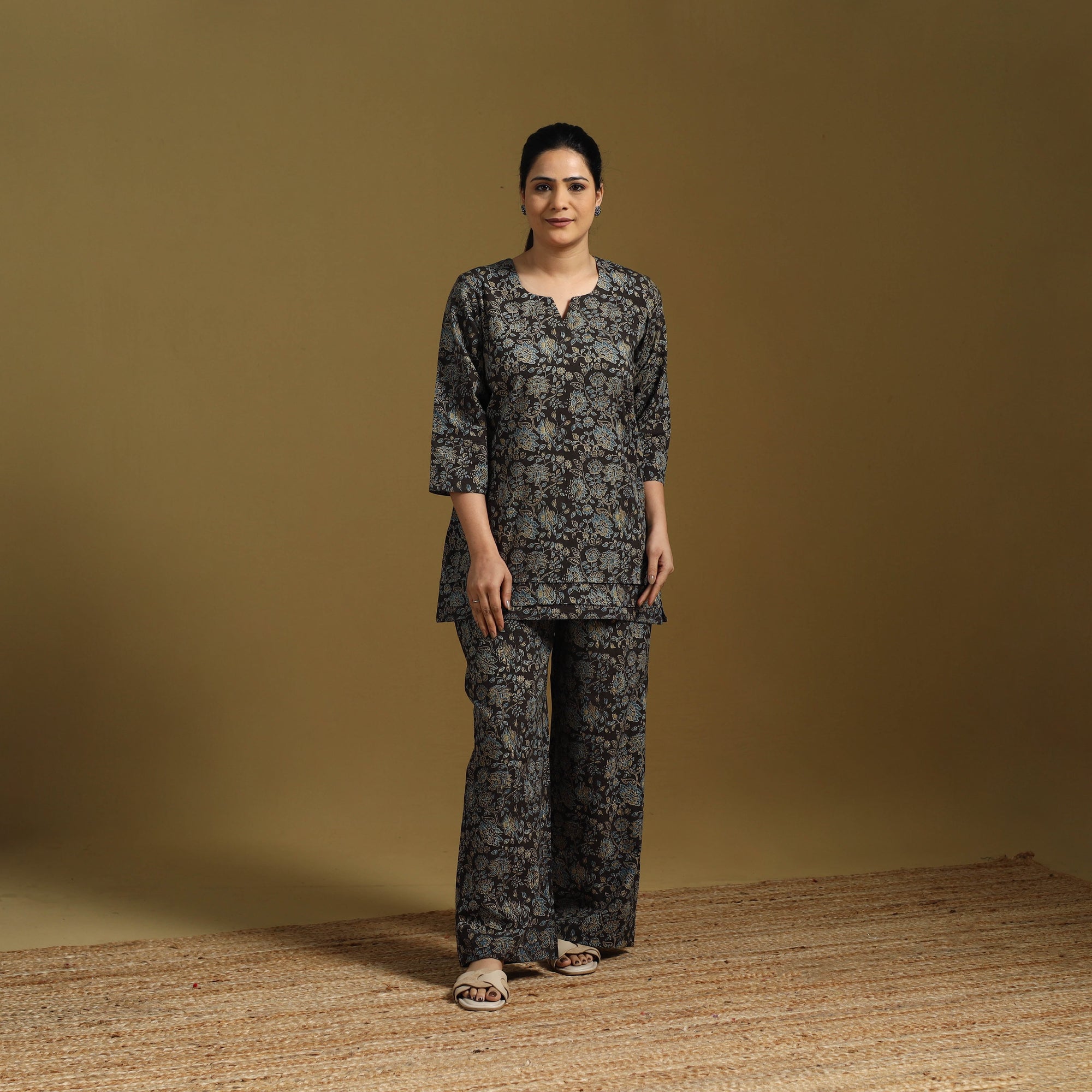 Stay stylish in this black ajrakh co-ord set featuring traditional Kutch block printing. Crafted from breathable, naturally dyed cotton, the set includes a relaxed-fit top and palazzos with an elasticated waistband and convenient side pockets. Perfect for brunches or cultural gatherings, this ensemble exudes effortless charm for every occasion.