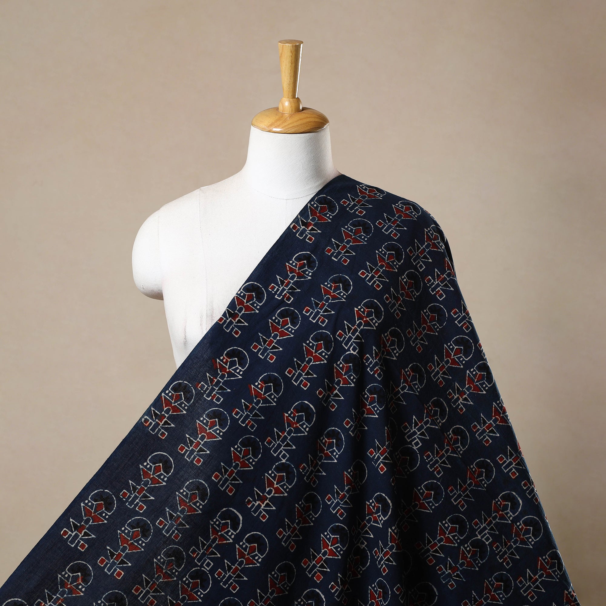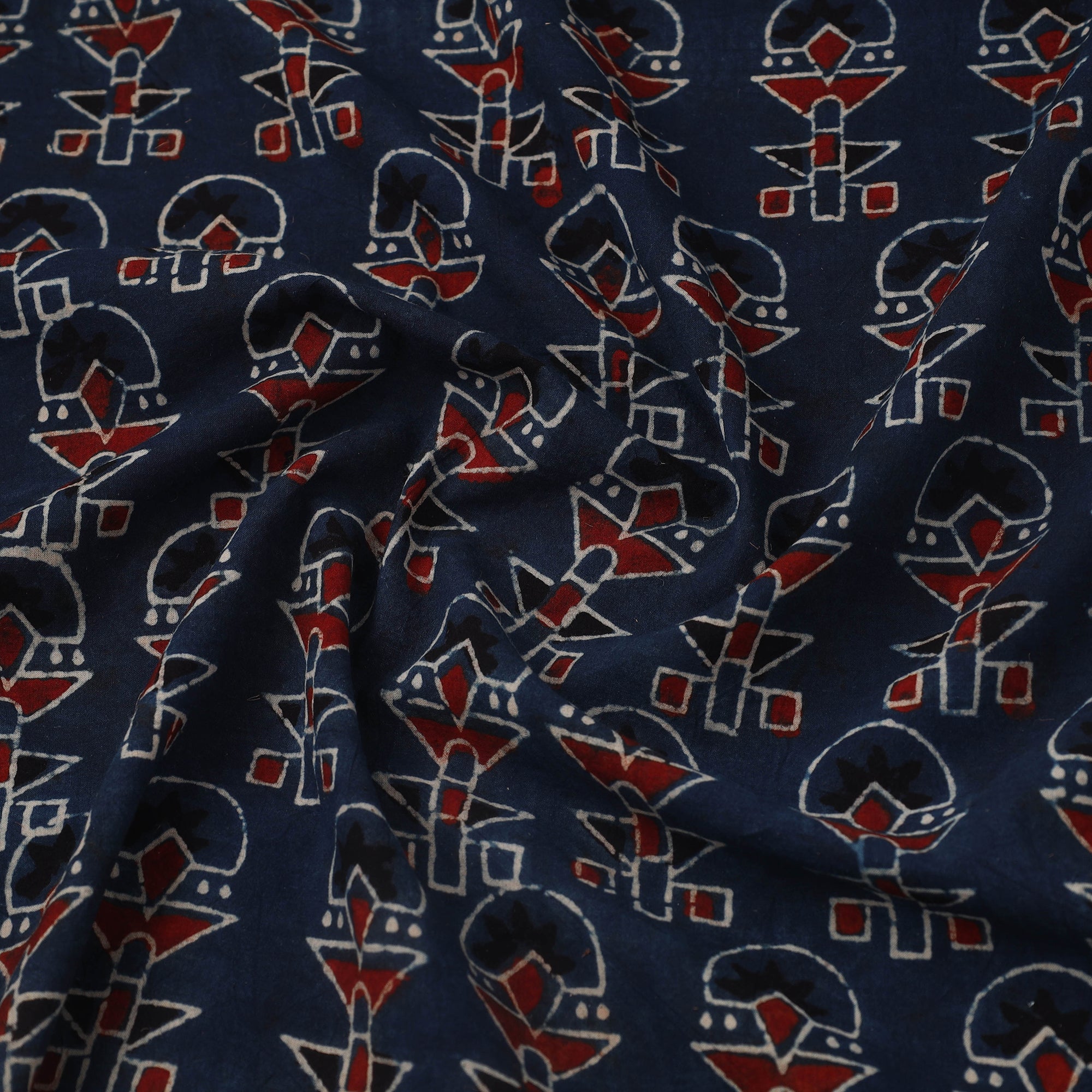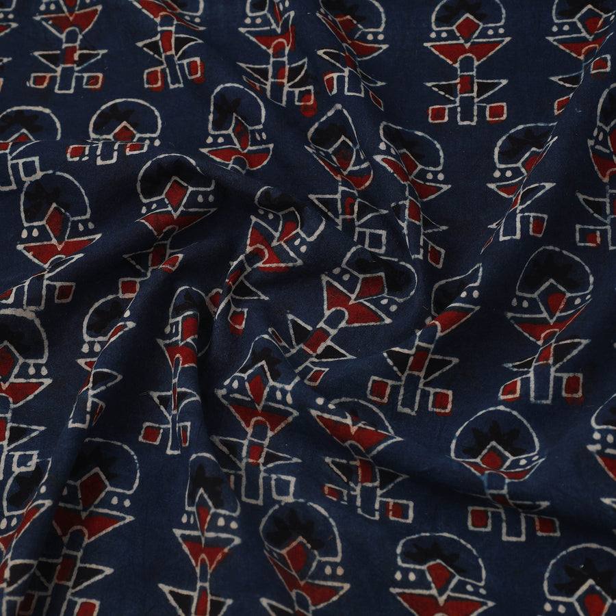 Blue block print cotton ajrakh fabric, meticulously crafted by master artisans in the Kutch region of Gujarat. Made using natural dyes, this eco-friendly fabric preserves a 4,500-year-old tradition of resist block printing, this exquisite fabric is perfect for custom outfits, upholstery, and creative projects, combining cultural richness with sustainability.