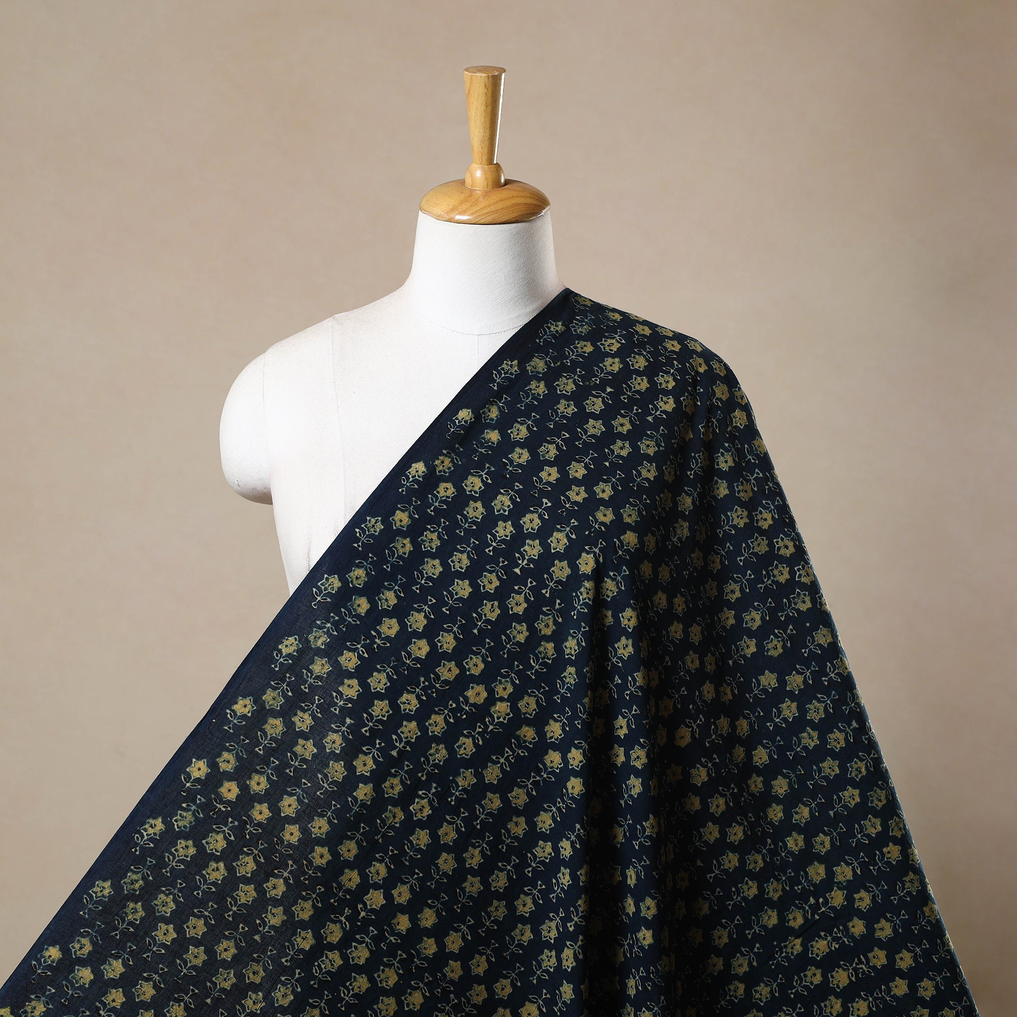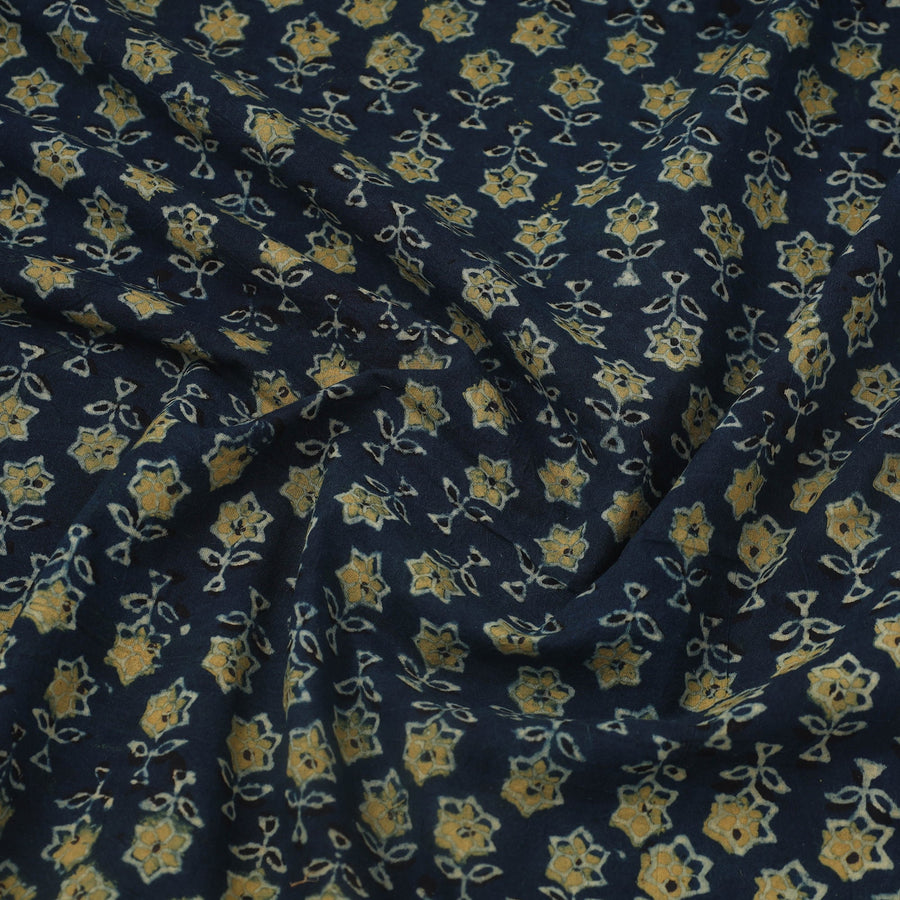 Blue block print cotton ajrakh fabric, meticulously crafted by master artisans in the Kutch region of Gujarat. Made using natural dyes, this eco-friendly fabric preserves a 4,500-year-old tradition of resist block printing, this exquisite fabric is perfect for custom outfits, upholstery, and creative projects, combining cultural richness with sustainability.