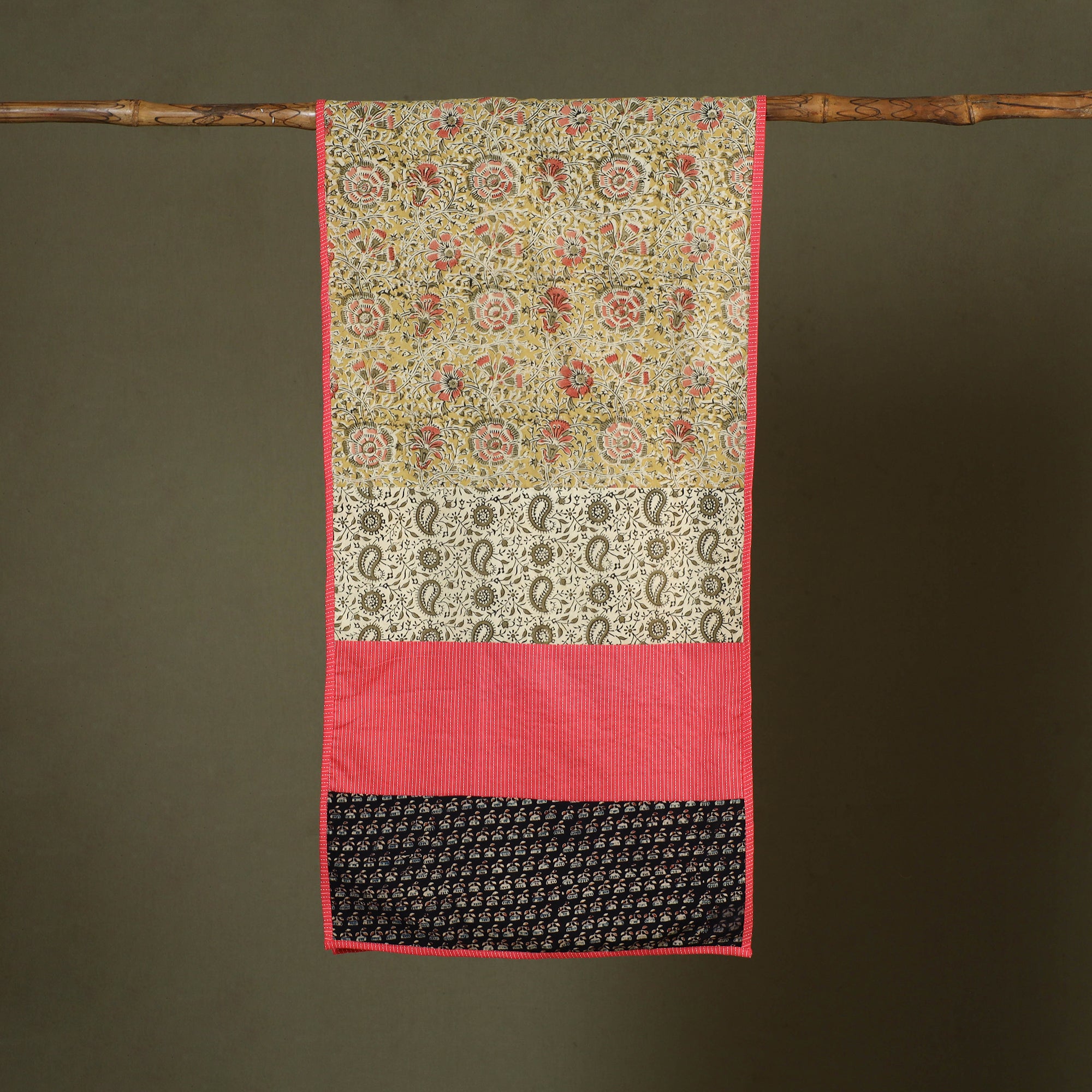 This multicolor cotton patchwork kalamkari stole features motifs inspired by nature and mythology. Crafted using the kalamkari technique, it showcases intricate designs with vibrant patchwork accents. A versatile accessory, it adds charm and elegance to any outfit, making it suitable for office wear, casual outings, or cultural gatherings, while reflecting the richness of Indian textile traditions.