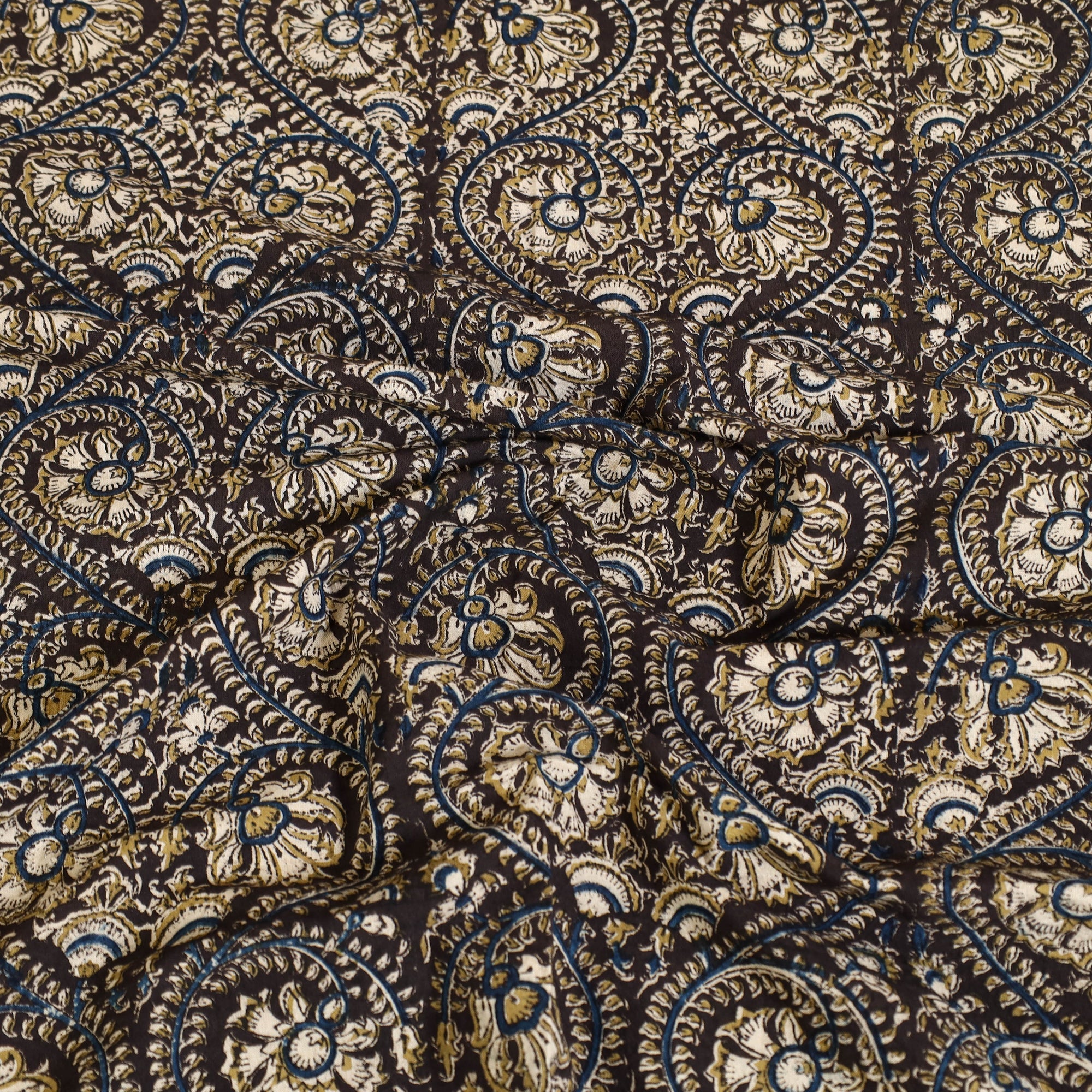 Add a touch of tradition to your bedroom with our black block print cotton pedana kalamkari bed sheet, skillfully handcrafted by artisans in Pedana, Andhra Pradesh. Made from eco-friendly cotton and natural dyed, this bed sheet showcases intricate block-printed motifs inspired by Kalamkari art. Breathable and versatile, it reflects India’s rich cultural heritage.