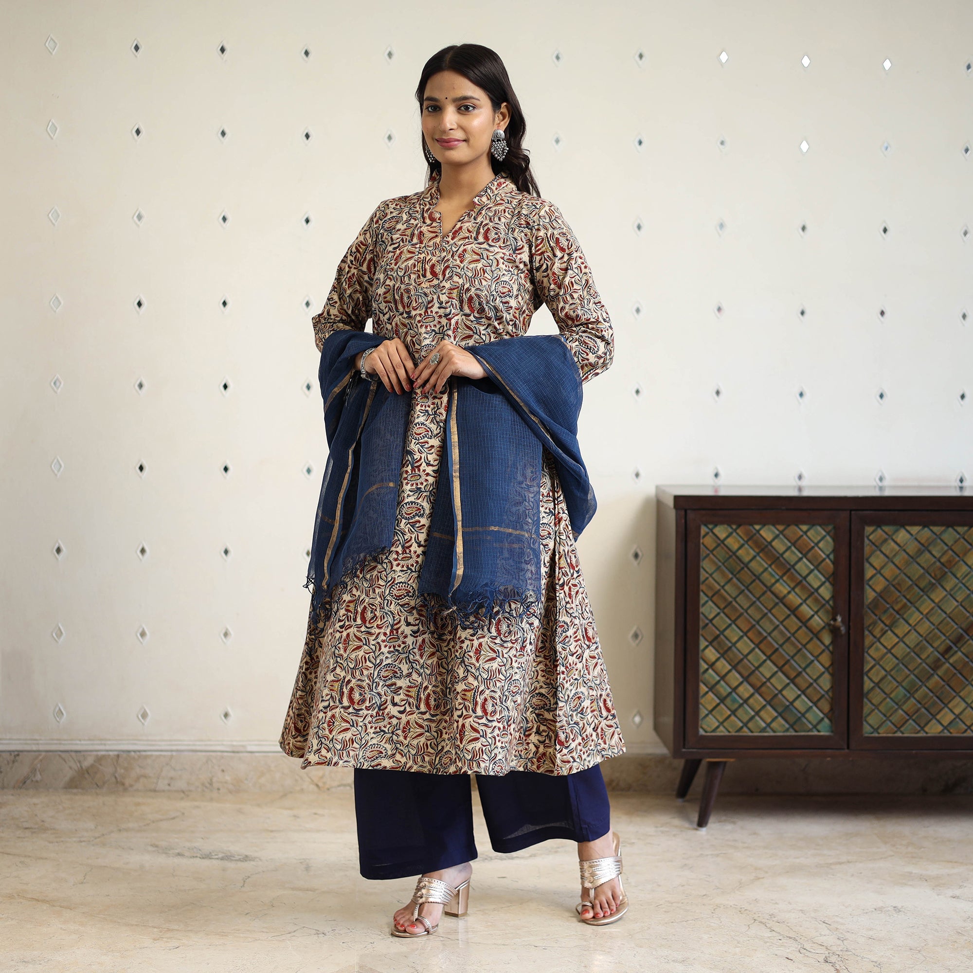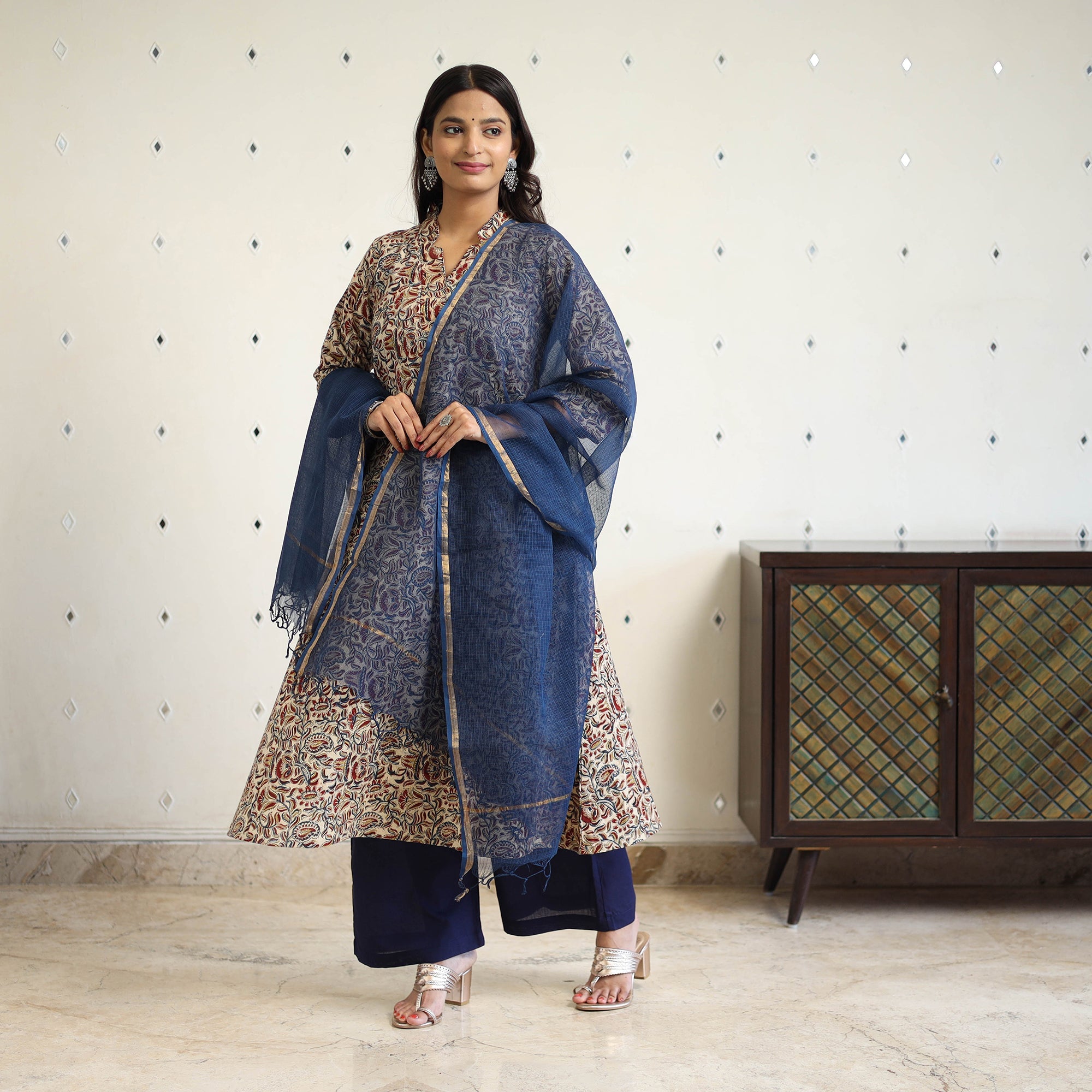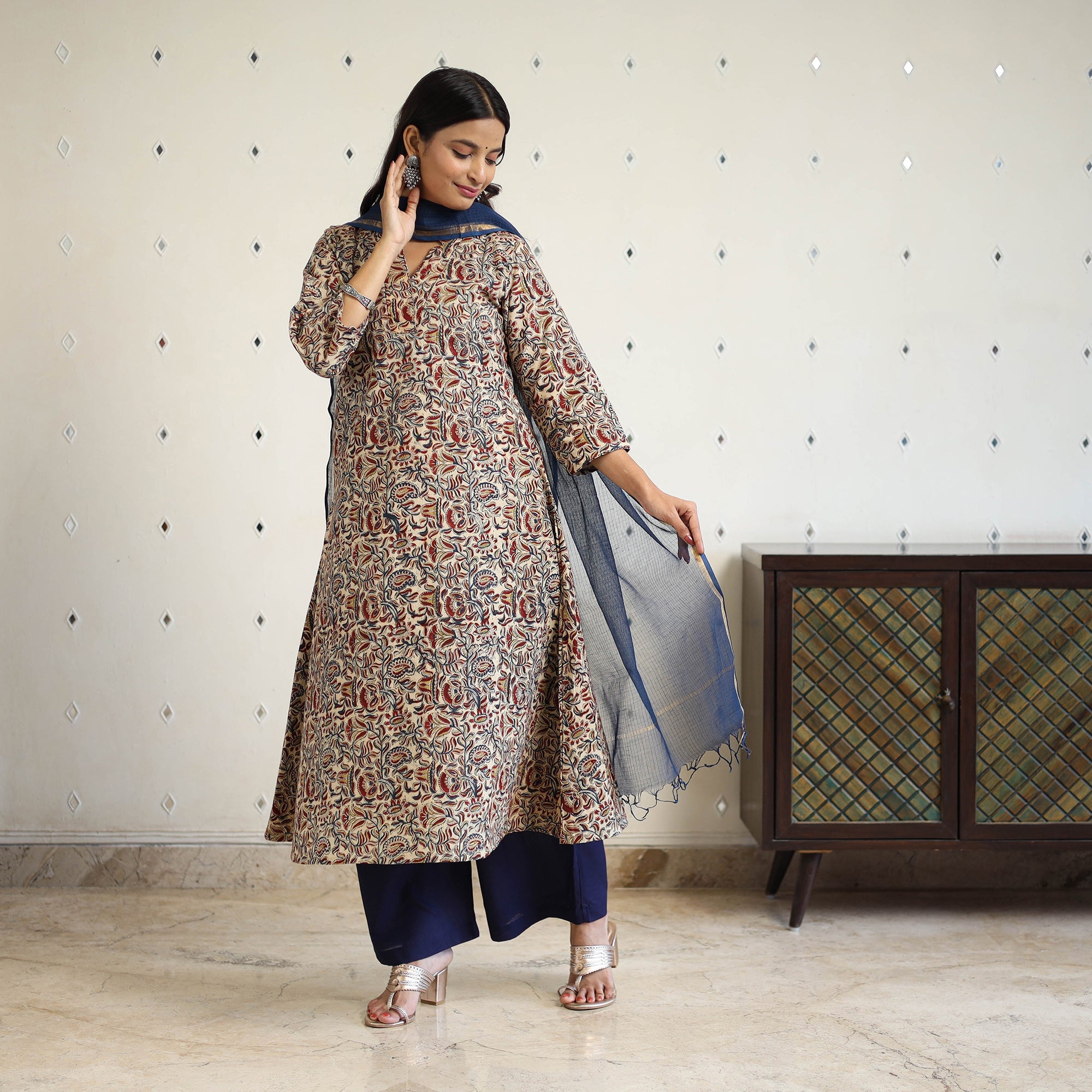 This cotton kalamkari kurta set is hand block-printed in Pedana using natural dyes and traditional techniques. The kurta features a handy side pocket and is paired with a plain elasticated cotton palazzo that includes two side pockets and a plain kota doria dupatta completes the look with elegance. Ideal for office wear, casual outings, or intimate festive gatherings.