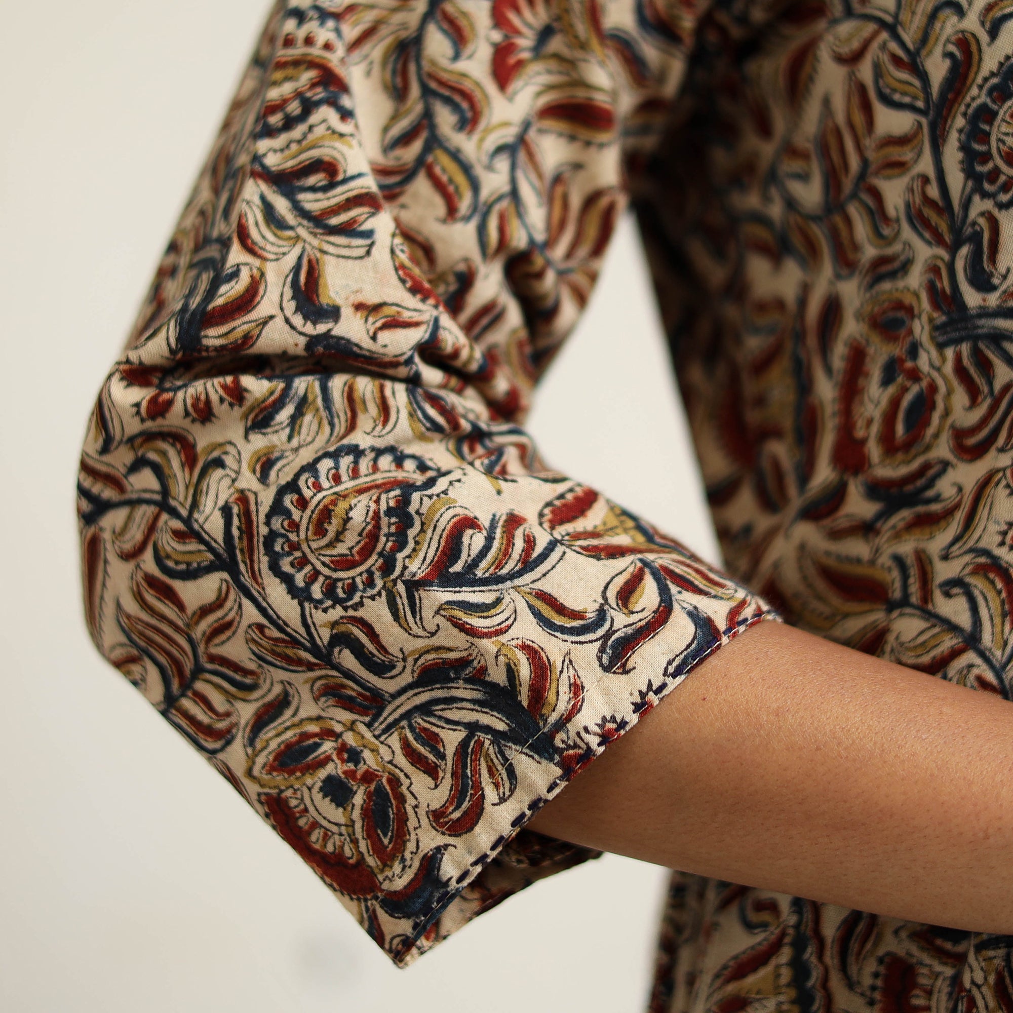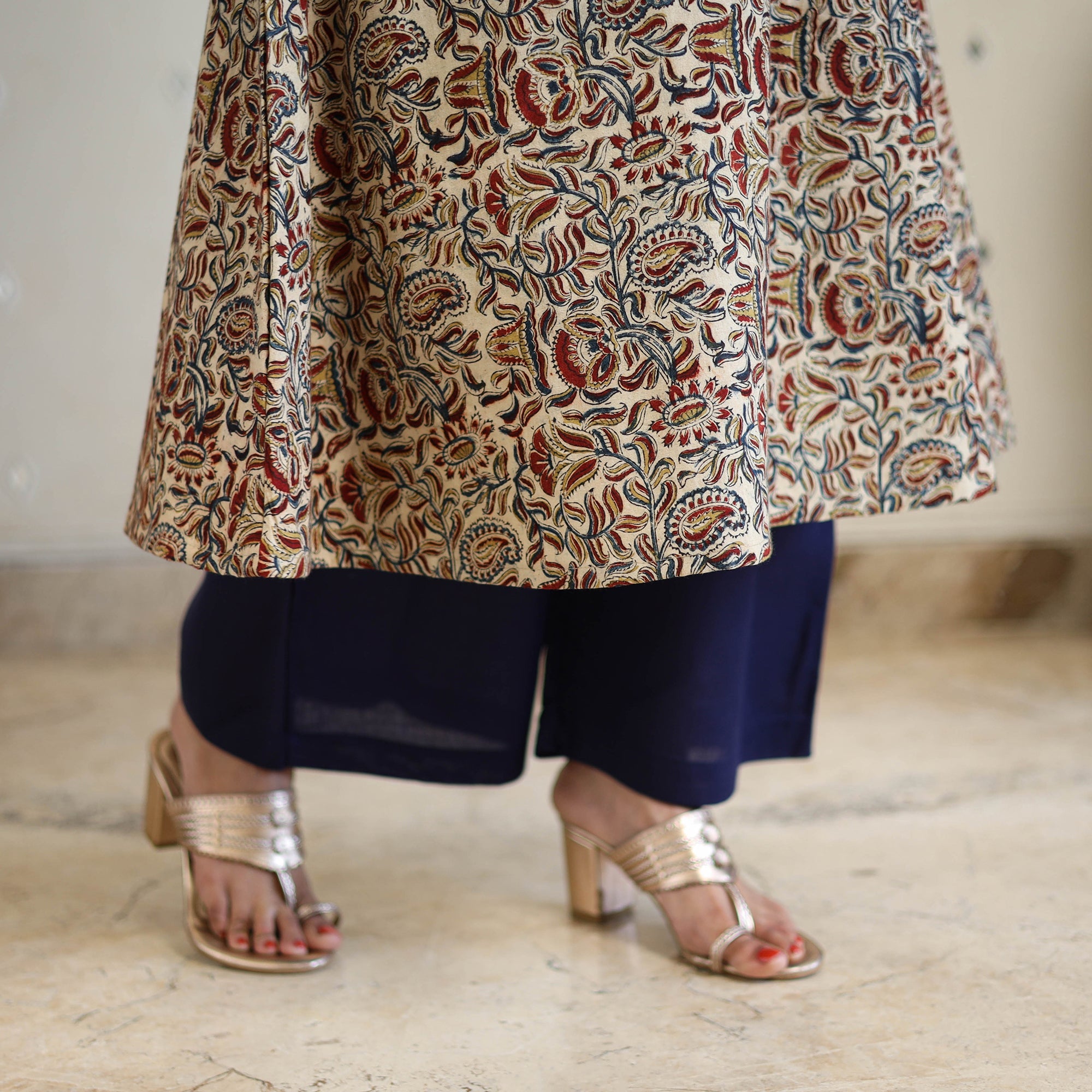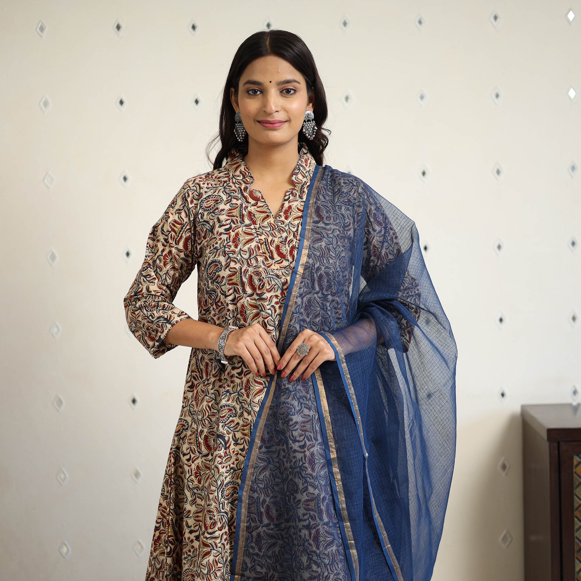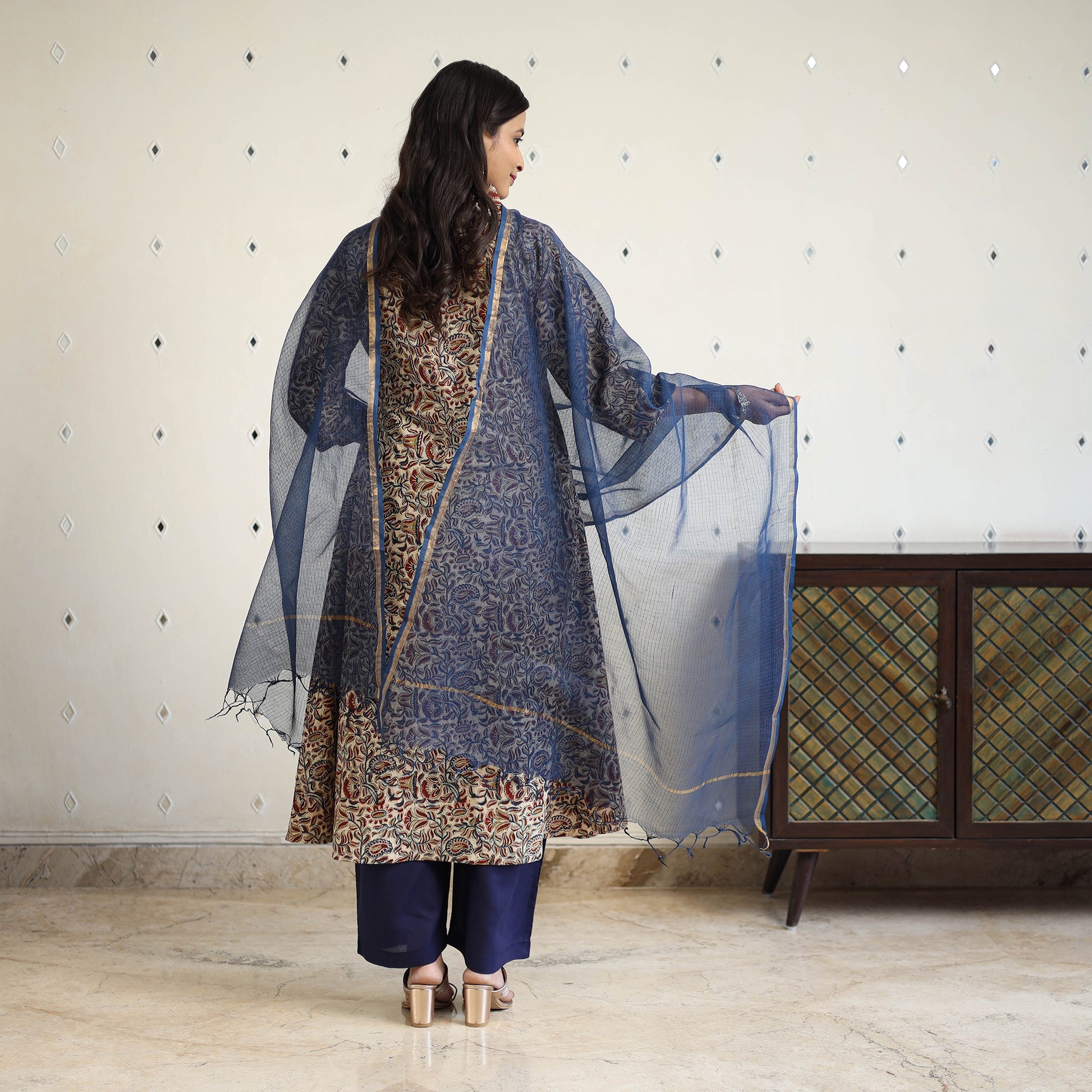 This cotton kalamkari kurta set is hand block-printed in Pedana using natural dyes and traditional techniques. The kurta features a handy side pocket and is paired with a plain elasticated cotton palazzo that includes two side pockets and a plain kota doria dupatta completes the look with elegance. Ideal for office wear, casual outings, or intimate festive gatherings.