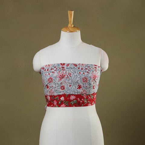 This blue cotton blouse piece features traditional sanganeri block printing, done by skilled artisans. The fabric showcases detailed patterns created using hand-carved wooden blocks. It combines intricate design with everyday comfort, and can be tailored into your preferred blouse to pair beautifully with sarees.