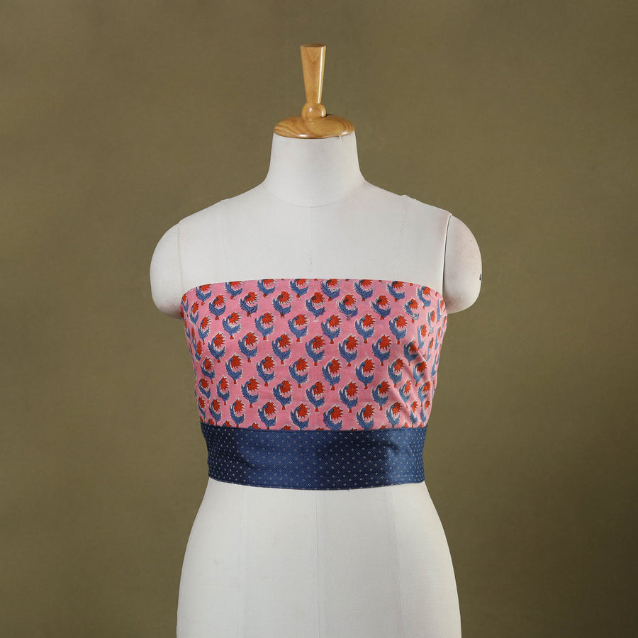 This pink cotton blouse piece features traditional sanganeri block printing, done by skilled artisans. The fabric showcases detailed patterns created using hand-carved wooden blocks. It combines intricate design with everyday comfort, and can be tailored into your preferred blouse to pair beautifully with sarees.
