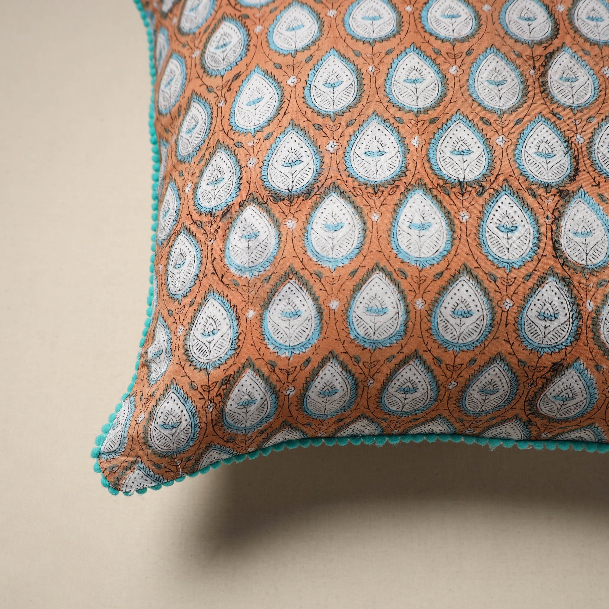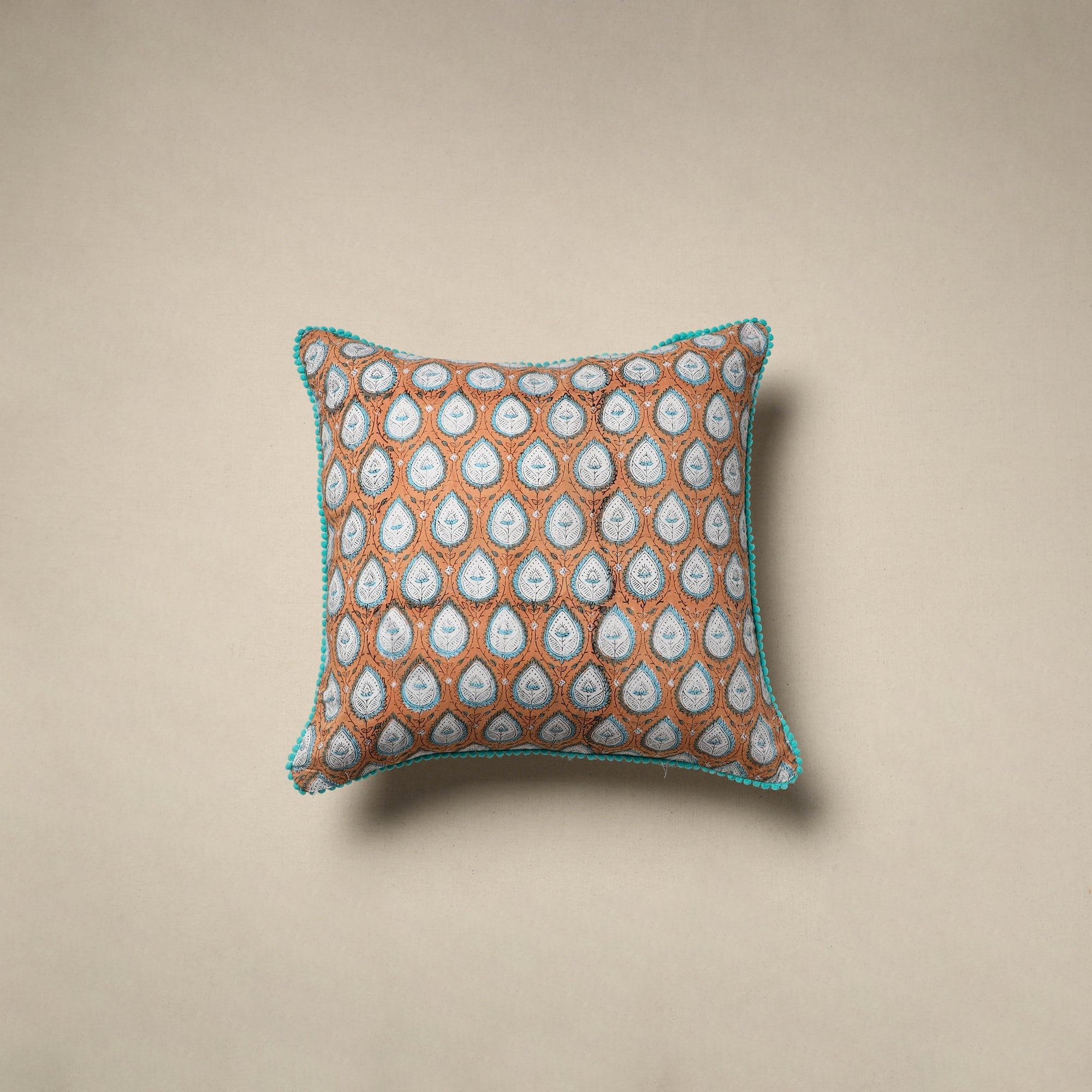 Style up your space with this beautiful brown sanganeri cushion cover. Hand block printed by artisans in Rajasthan, it features delicate floral motifs and pom-pom edges. Made from soft cotton, it’s perfect for your sofa, bed or that cozy corner you love to unwind in.