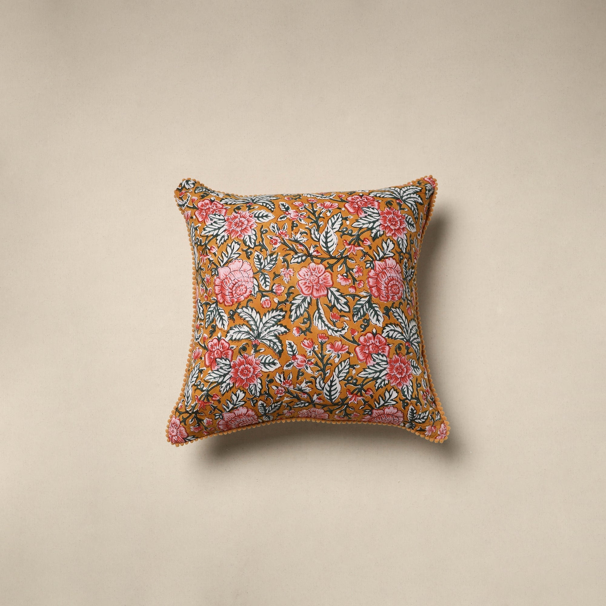 Style up your space with this beautiful yellow sanganeri cushion cover. Hand block printed by artisans in Rajasthan, it features delicate floral motifs and pom-pom edges. Made from soft cotton, it’s perfect for your sofa, bed or that cozy corner you love to unwind in.