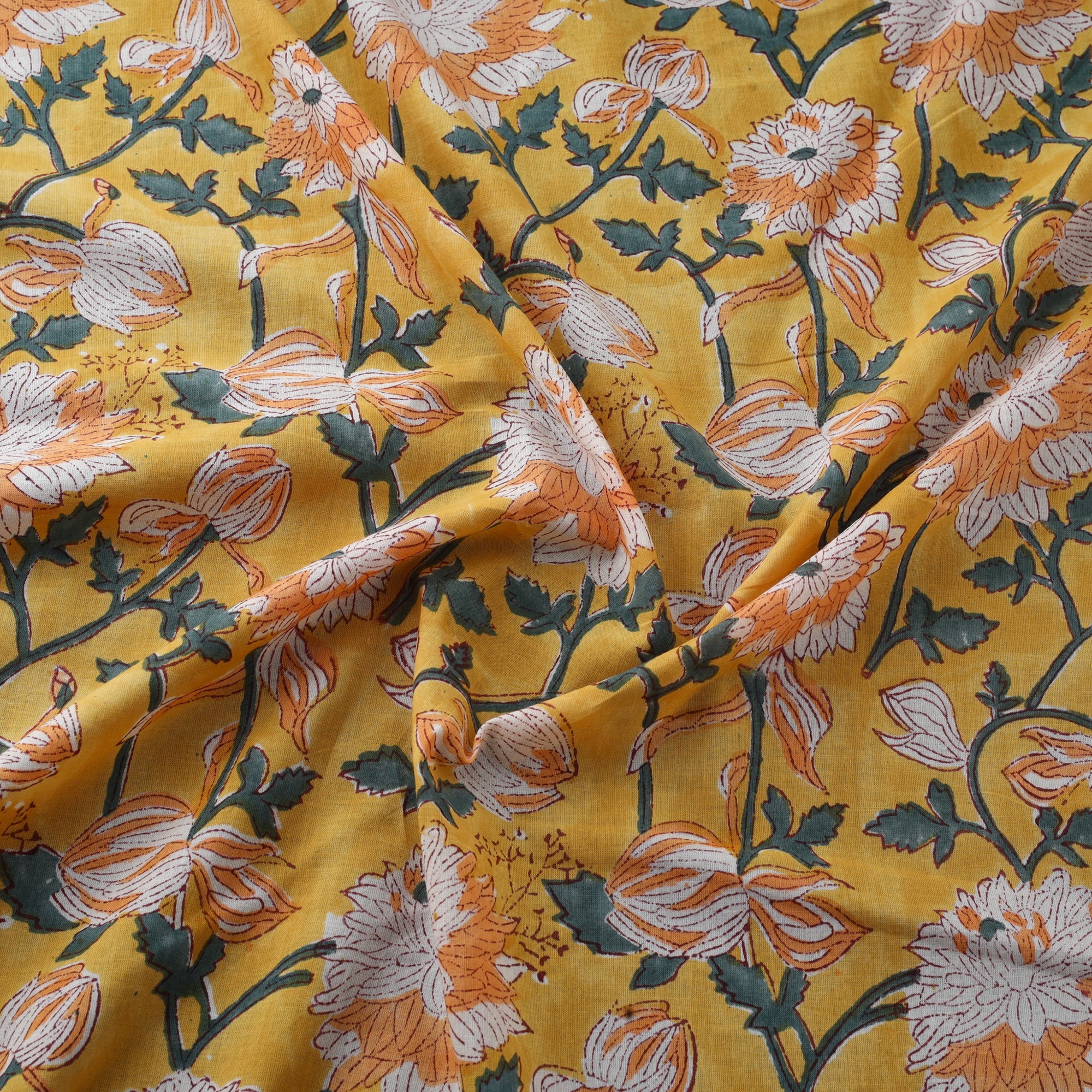 Fine quality yellow sanganeri hand block printed cotton fabric, crafted using traditional techniques from Sanganer, a historic town near Jaipur, Rajasthan. Renowned for its delicate floral motifs and intricate design work, this fabric is printed using vat dyes that ensure lasting color and wash durability. Suitable for both apparel and home decor projects.