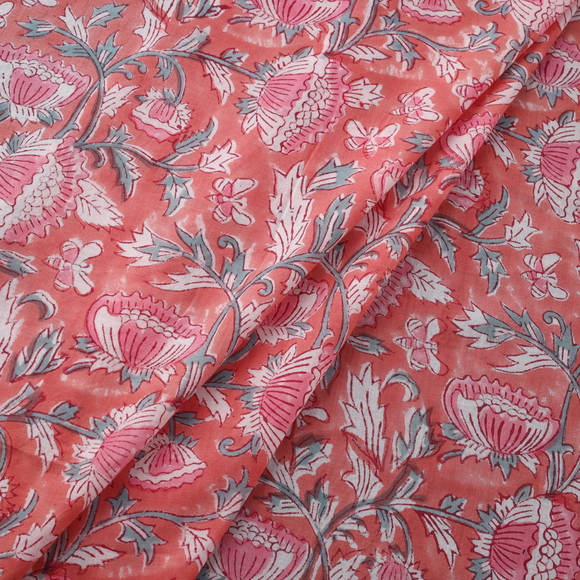 Fine quality pink sanganeri hand block printed cotton fabric, crafted using traditional techniques from Sanganer, a historic town near Jaipur, Rajasthan. Renowned for its delicate floral motifs and intricate design work, this fabric is printed using vat dyes that ensure lasting color and wash durability. Suitable for both apparel and home decor projects.
