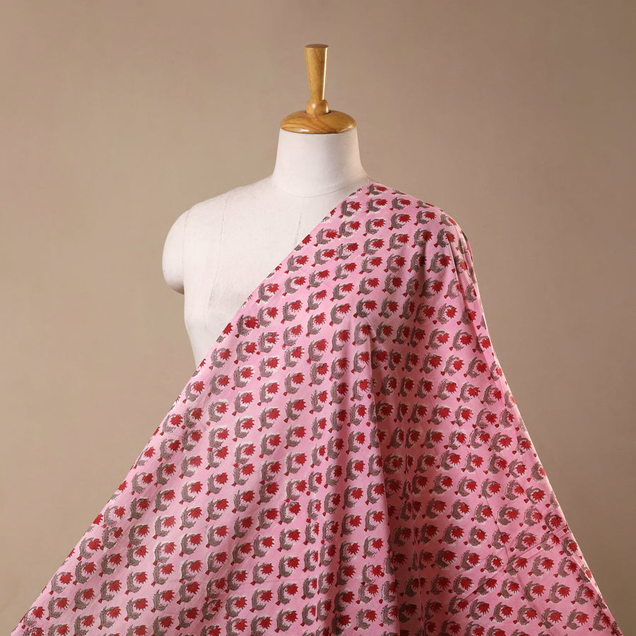 This pink sanganeri fabric from Rajasthan is crafted using the traditional block-printing techniques of Sanganer. The soft cotton base showcases intricate hand-printed floral motifs, offering both comfort and durability. Ideal for garments, home decor, and creative projects, it adds a timeless Rajasthani charm to your designs.