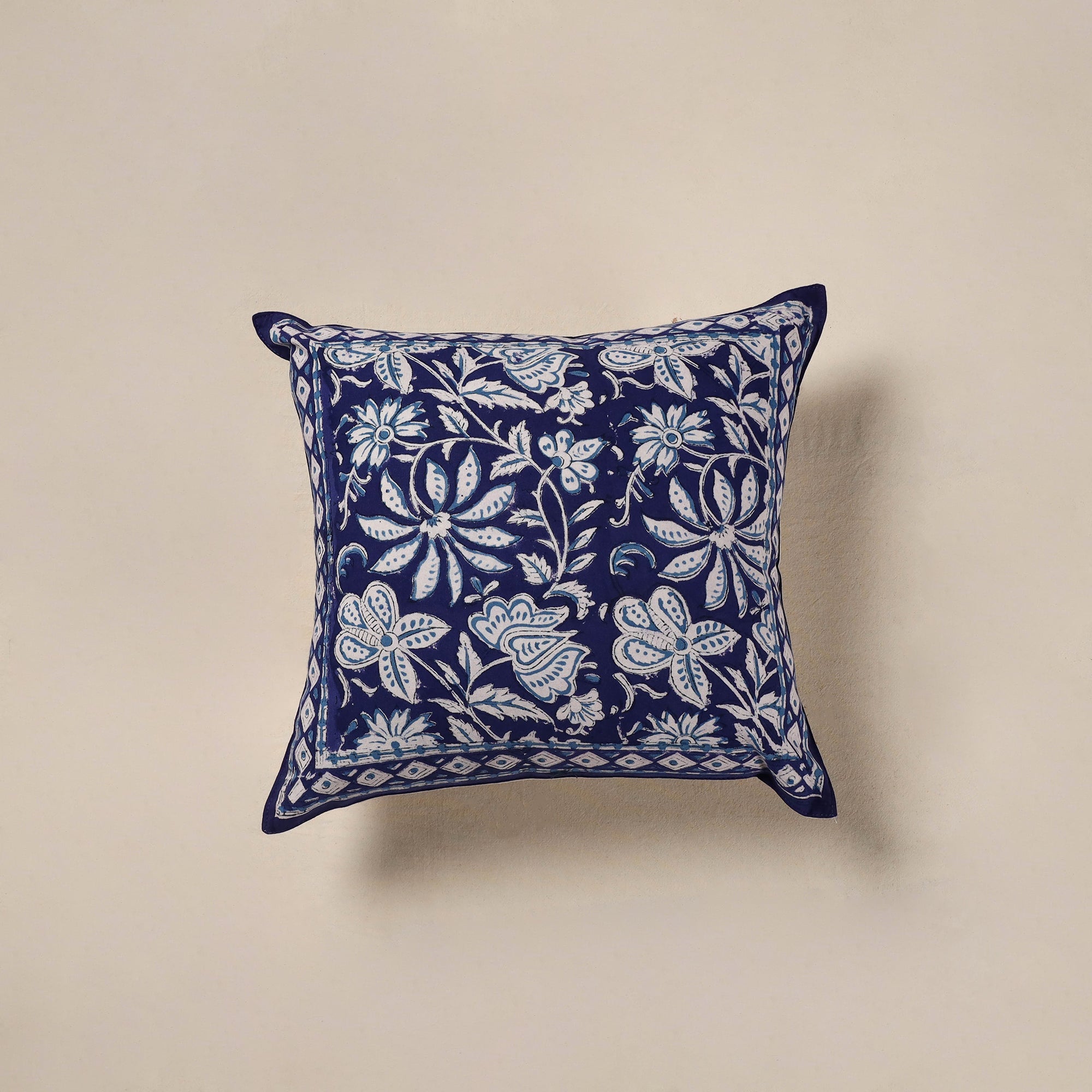 Bring home a piece of Rajasthan with this blue sanganeri floral cushion cover, hand block printed by artisans in Jaipur. Made from cotton, the cover features traditional floral patterns created using bleed-free VAT dyes. sanganeri printing is a centuries-old craft, celebrated for its delicate motifs and pastel hues. A perfect accent for your sofa, bed, or reading nook.