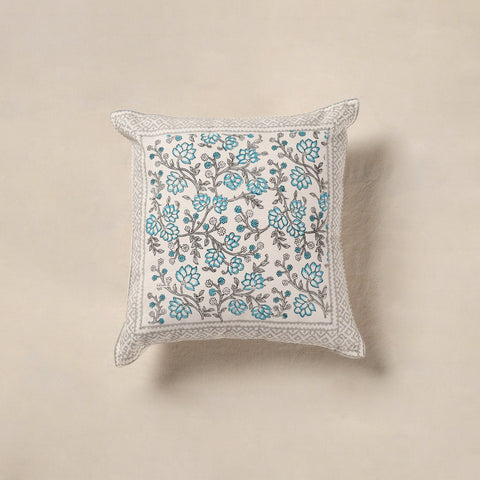White - Block Print Cotton Sanganeri Floral Cushion Cover (16 x 16 in) 06