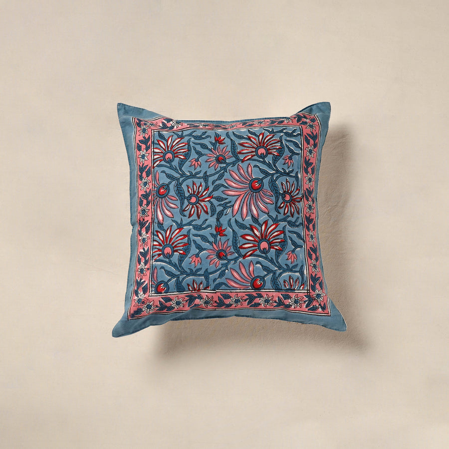 Bring home a piece of Rajasthan with this blue sanganeri floral cushion cover, hand block printed by artisans in Jaipur. Made from cotton, the cover features traditional floral patterns created using bleed-free VAT dyes. sanganeri printing is a centuries-old craft, celebrated for its delicate motifs and pastel hues. A perfect accent for your sofa, bed, or reading nook.