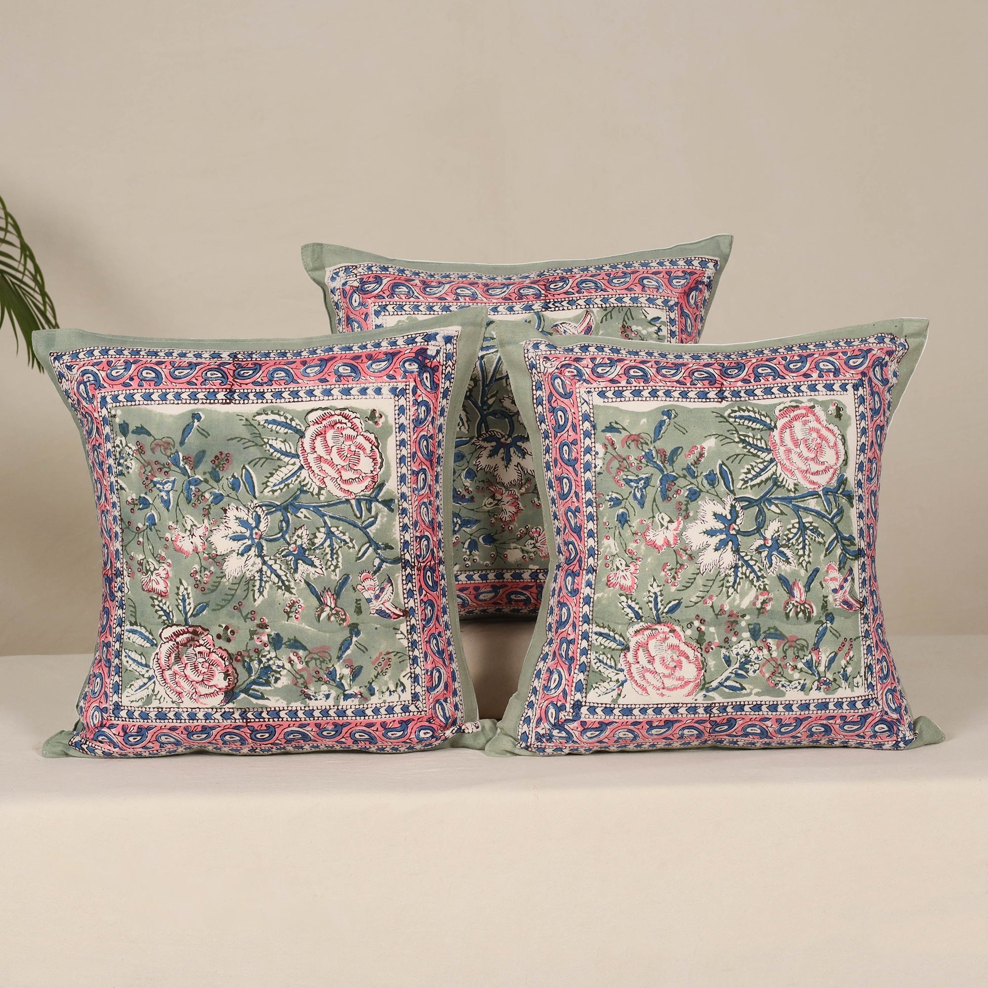 Bring home the charm of Rajasthan with this set of 5 green sanganeri floral cushion covers, block printed by artisans in Jaipur. Made from cotton, each piece features intricate motifs crafted using bleed-free VAT dyes. Sanganeri printing is a centuries-old art known for its delicate detailing and soft pastel tones. Perfect to elevate the look of your sofa, bed, or reading nook.