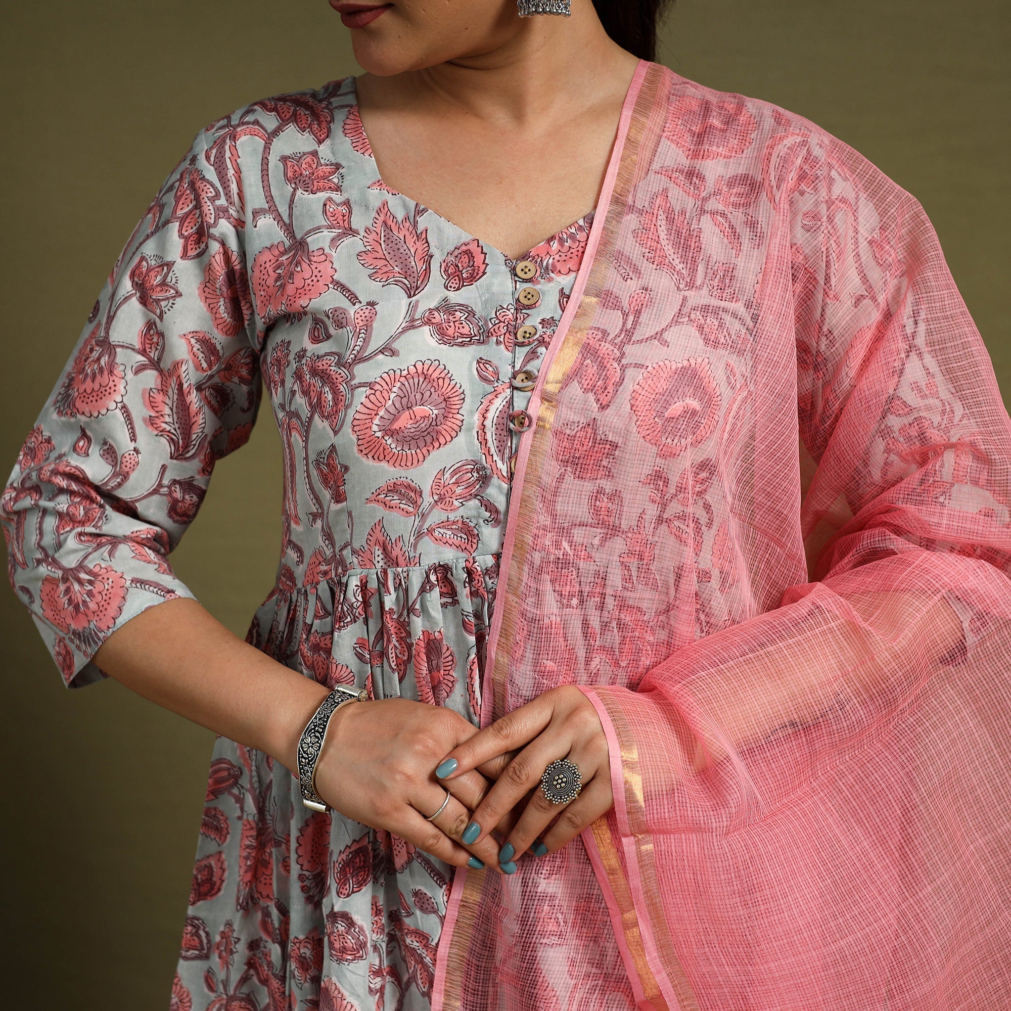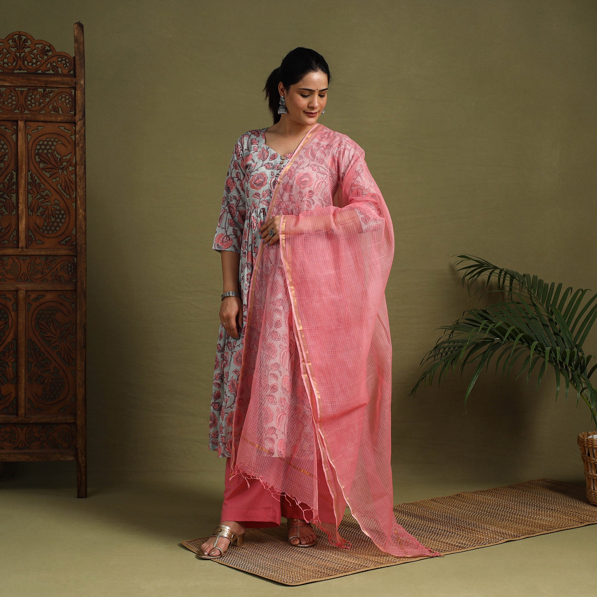 This pink sanganeri kurta set showcases traditional block printing from Rajasthan, renowned for its delicate floral motifs. The ensemble features a cotton flared kurta, a plain palazzo with an elasticated waistband and two pockets, and a lightweight kota doria plain dupatta. Designed for everyday ease and festive elegance, it captures the charm of regional textile heritage.
