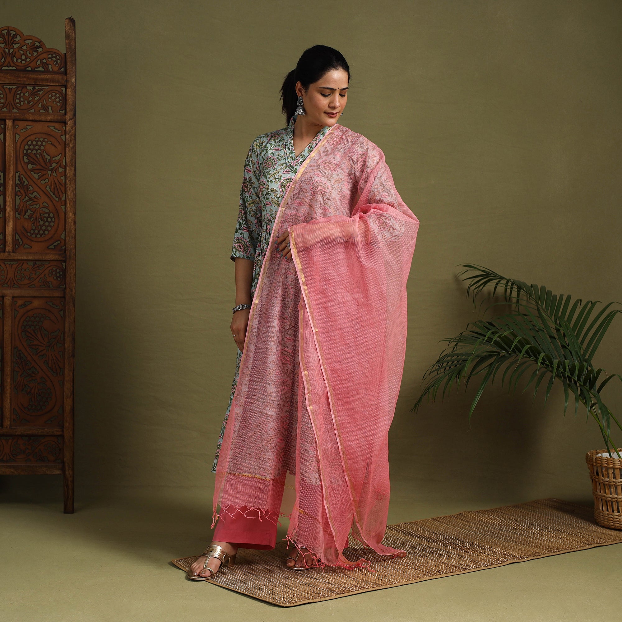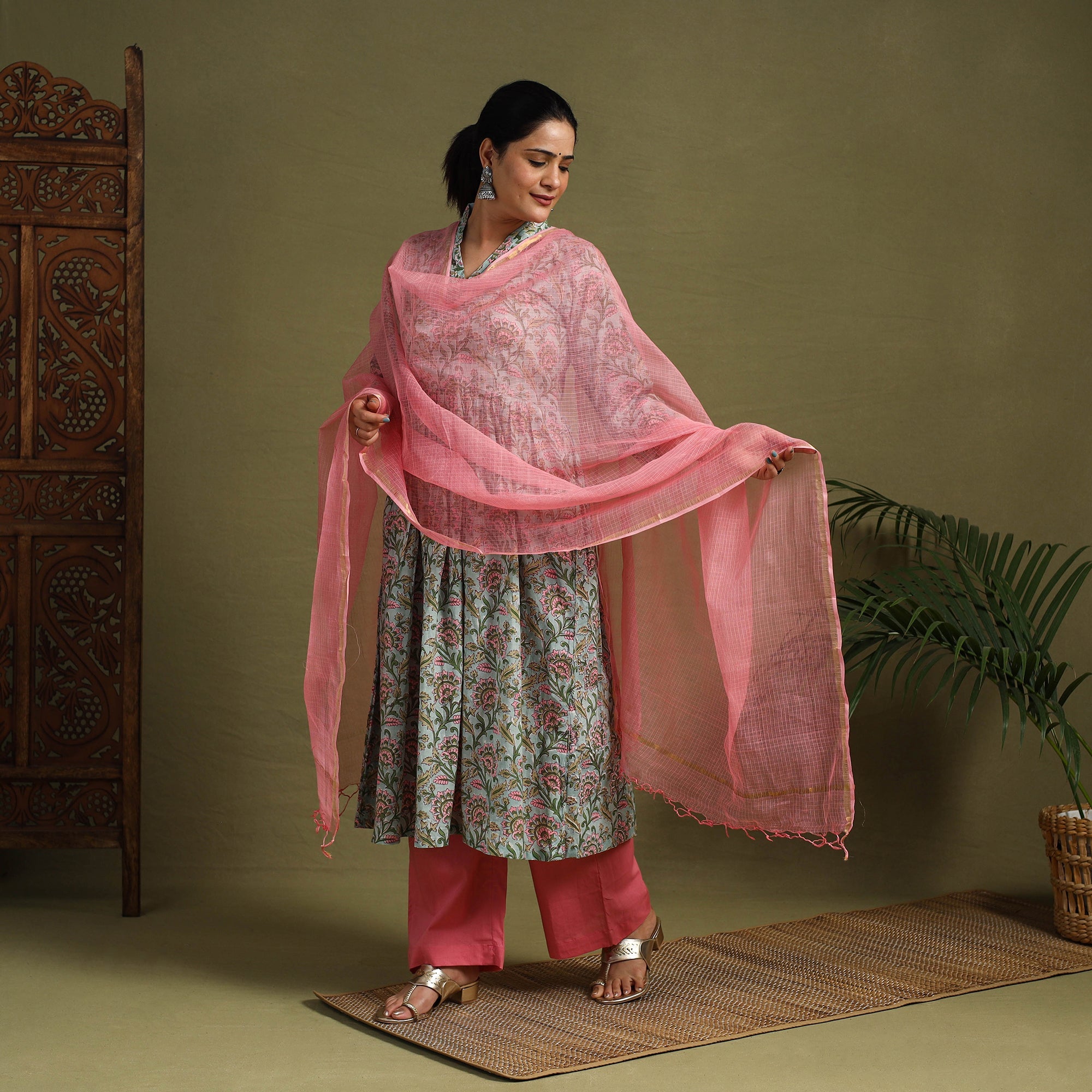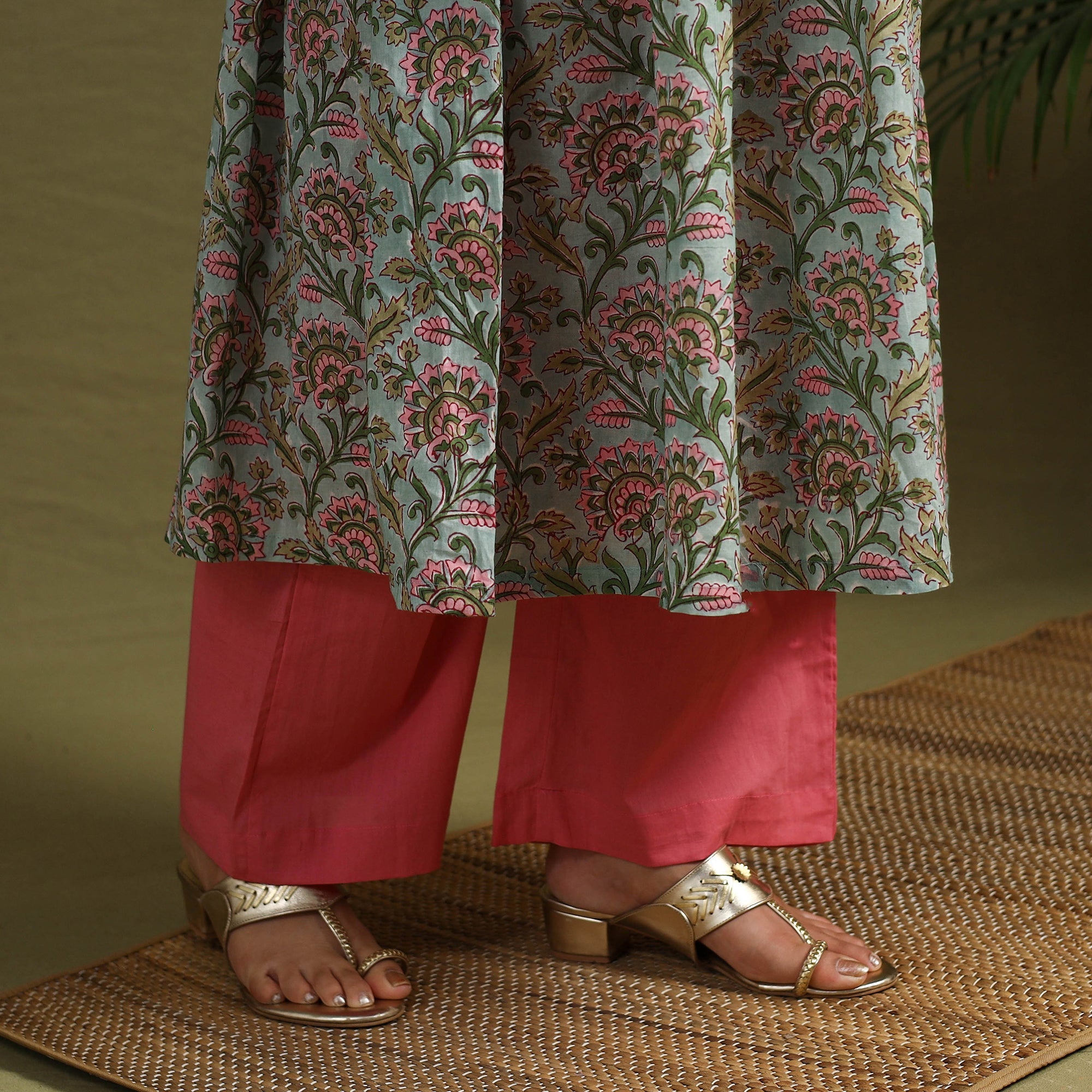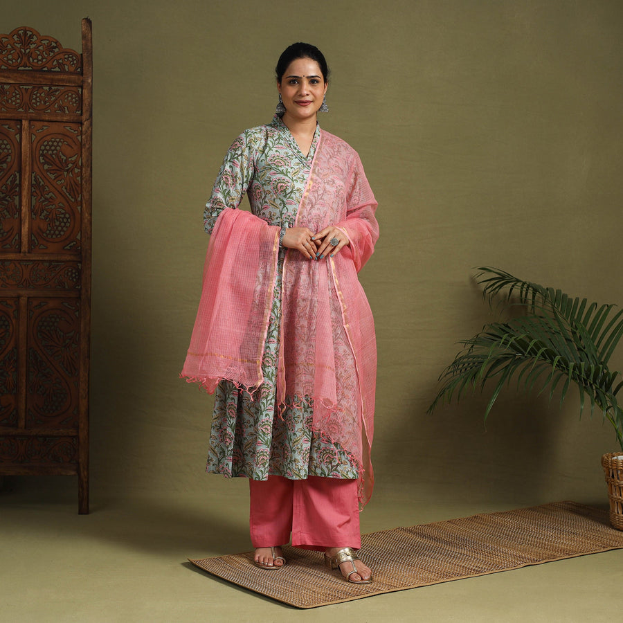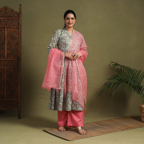 This green sanganeri kurta set showcases traditional block printing from Rajasthan, renowned for its delicate floral motifs. The ensemble features a cotton flared kurta, a plain palazzo with an elasticated waistband and two pockets, and a lightweight kota doria plain dupatta. Designed for everyday ease and festive elegance, it captures the charm of regional textile heritage.