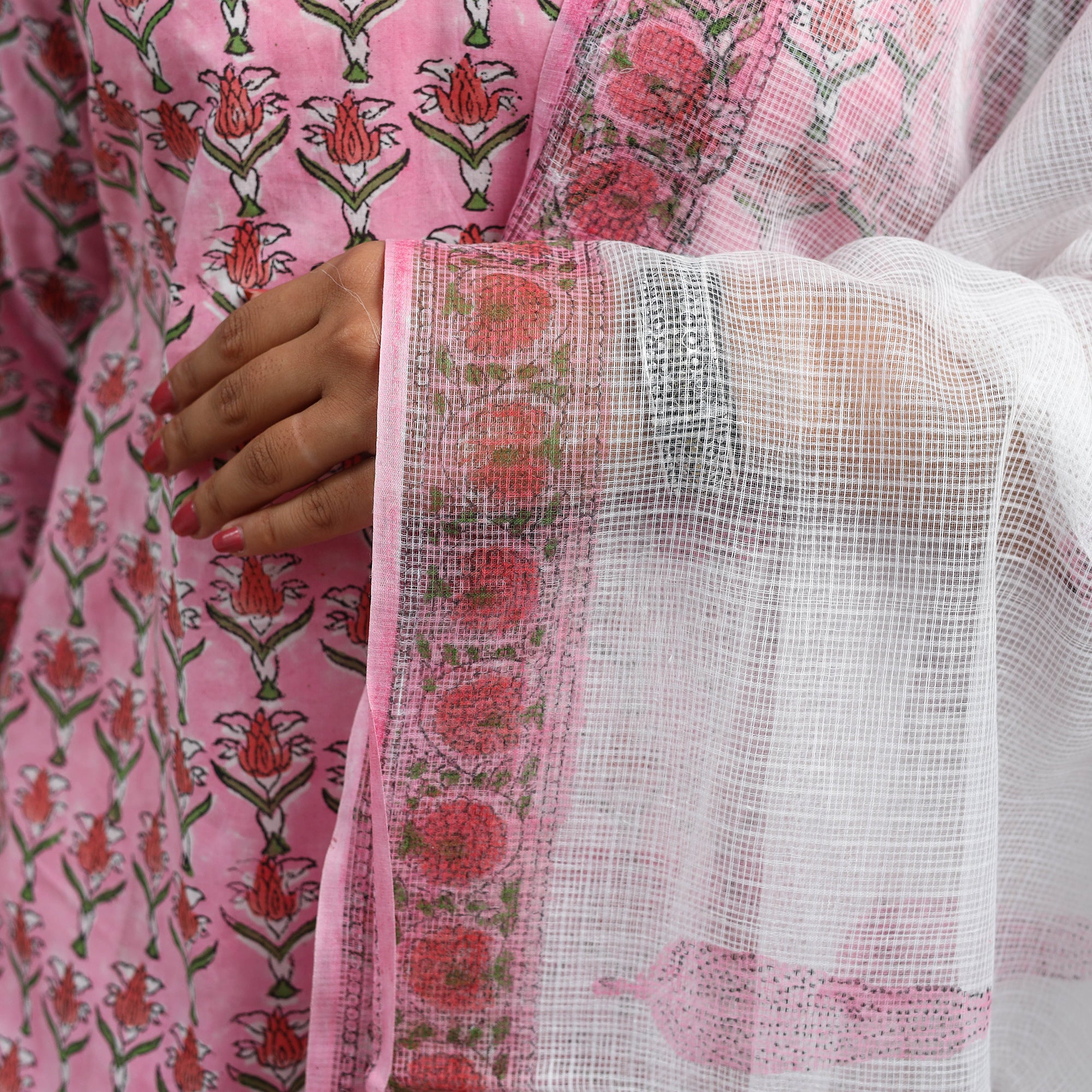 This pink block-printed cotton sanganeri kurta set includes a comfortable kurta with a side pocket, matching pants with two pockets, and a lightweight kota doria dupatta. Designed for ease and everyday style, it's a great pick for casual outings or festive wear. The sanganeri print and kota doria weave originate from Rajasthan, a region known for its rich textile traditions.