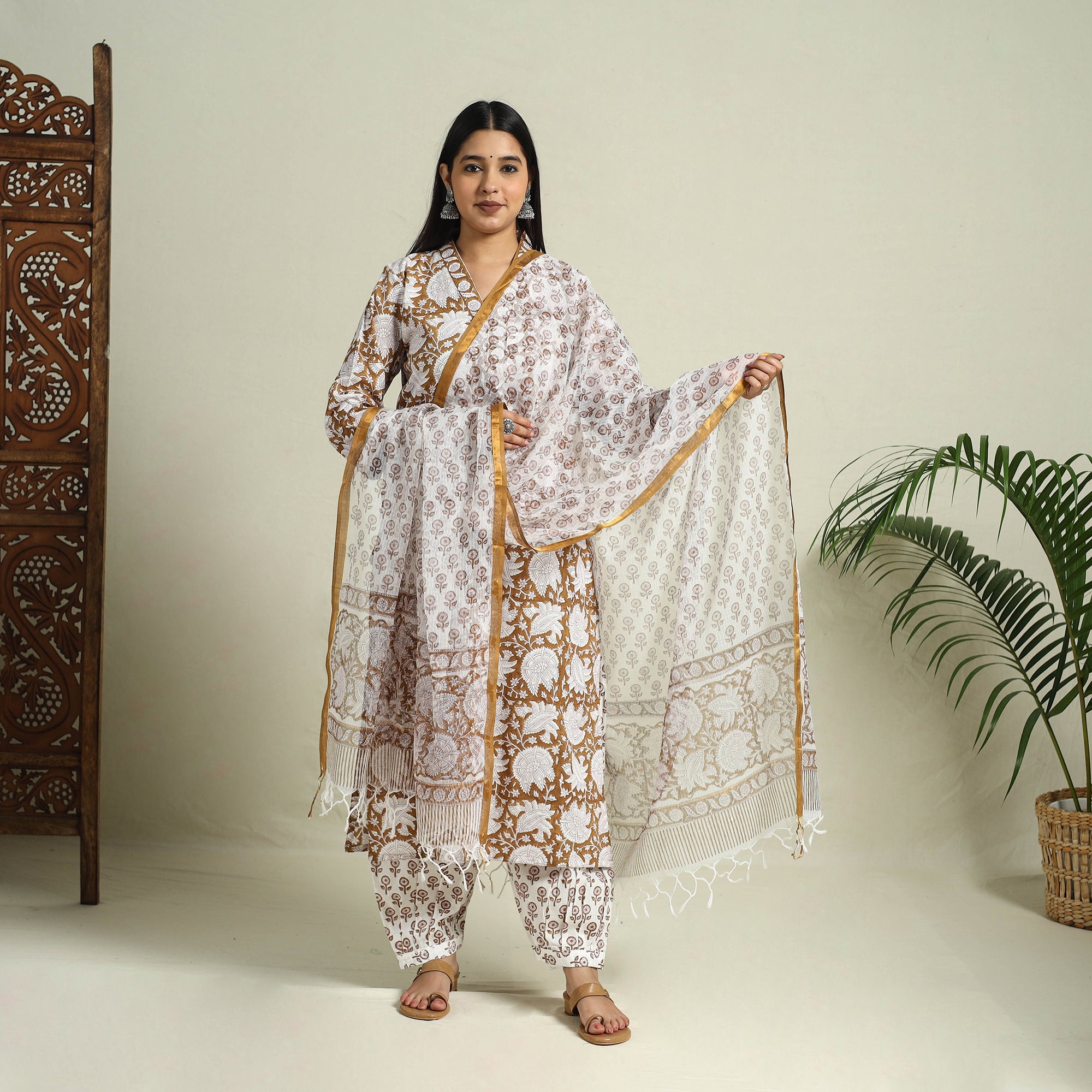 Celebrate the vibrant artistry of Rajasthan with this cotton brown sanganeri kurta set. Sanganeri block printing, known for its delicate floral motifs, adds charm to the ensemble. The set features a comfortable kurta with a side pocket, a matching elasticated waist salwar, and a kota doria cotton dupatta. Ideal for festive gatherings or casual outings, it beautifully blends tradition with everyday comfort.