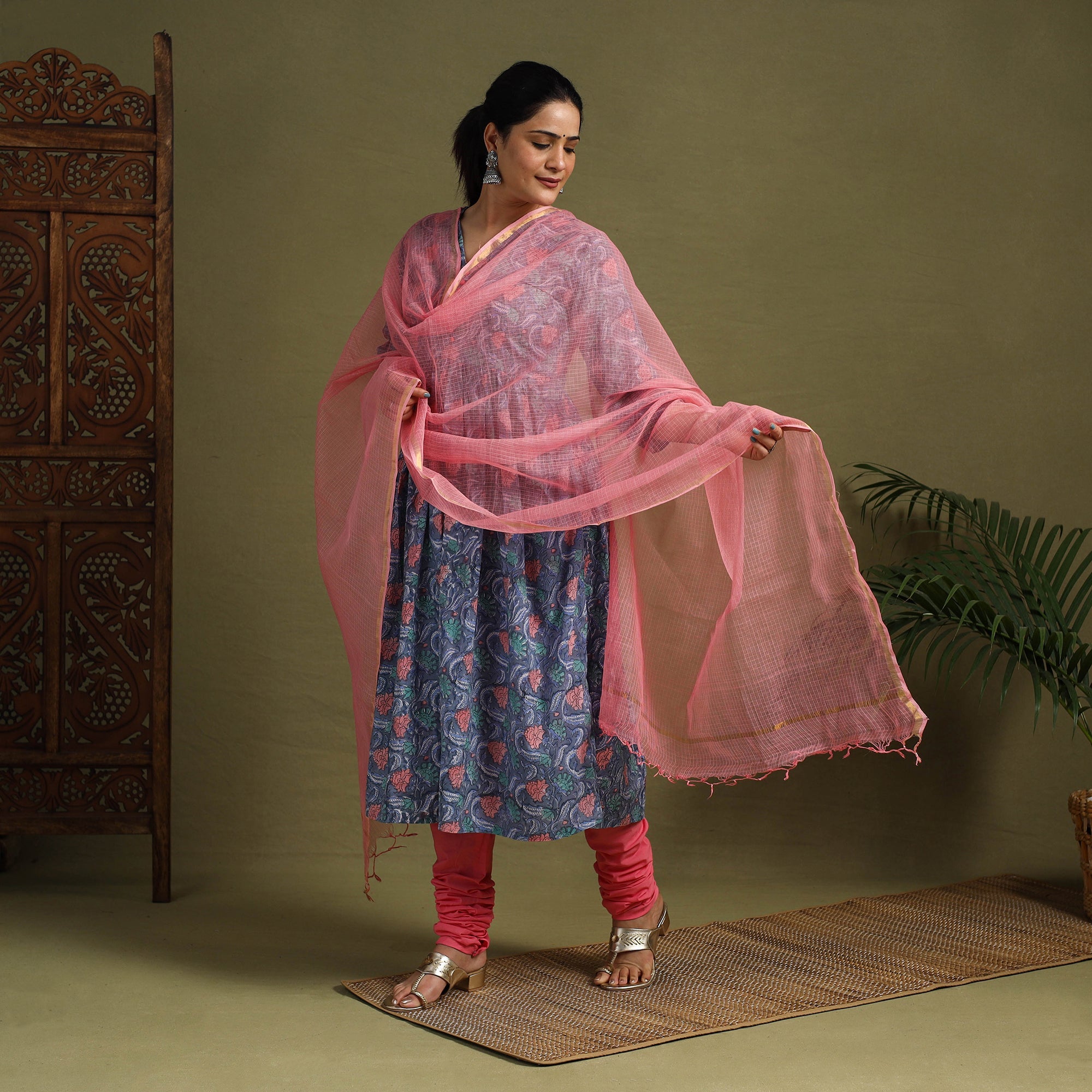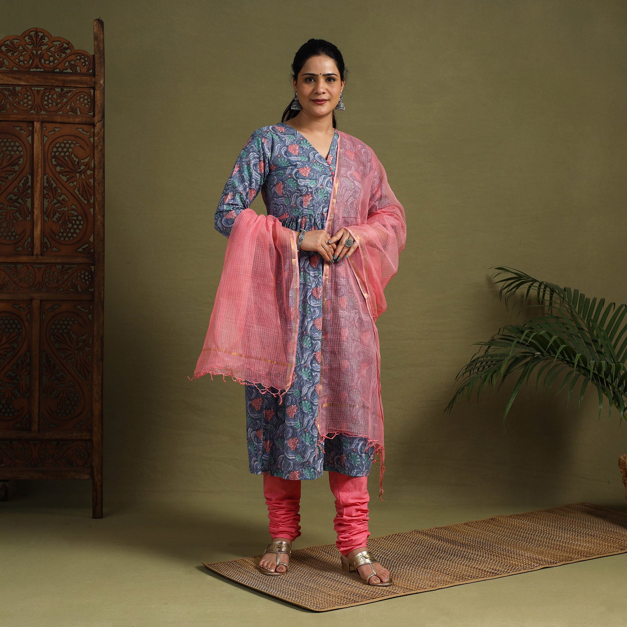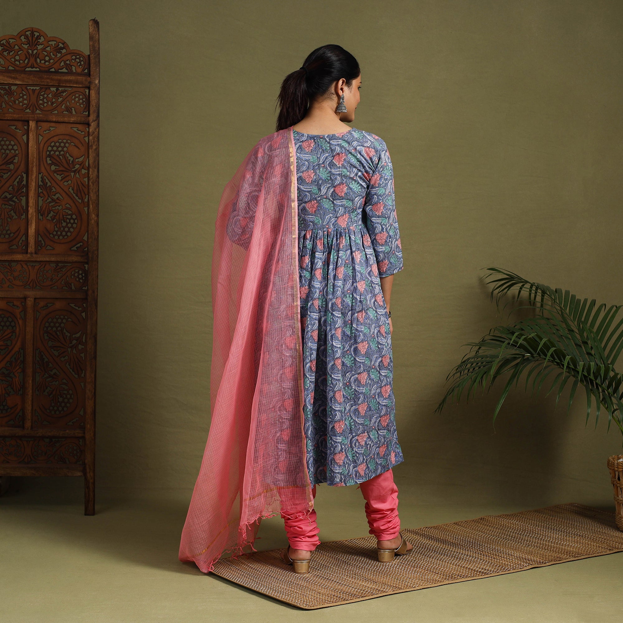 This blue sanganeri kurta set features traditional block printing from Rajasthan, celebrated for its intricate floral motifs. The set includes a flared cotton kurta, an ankle-length churidar with an adjustable drawstring, and a lightweight kota doria dupatta. Designed for everyday comfort and festive charm, it beautifully reflects the essence of regional textile art.