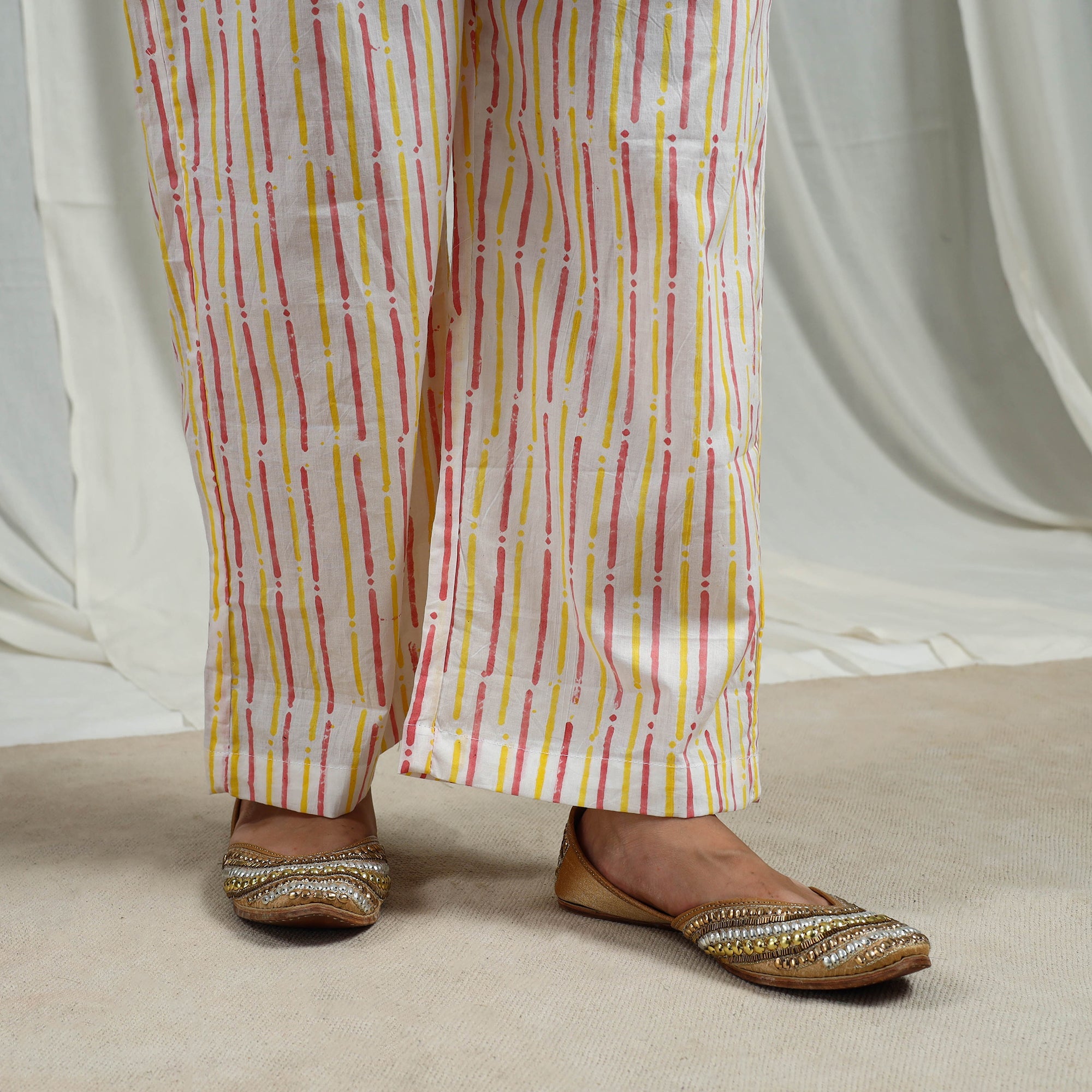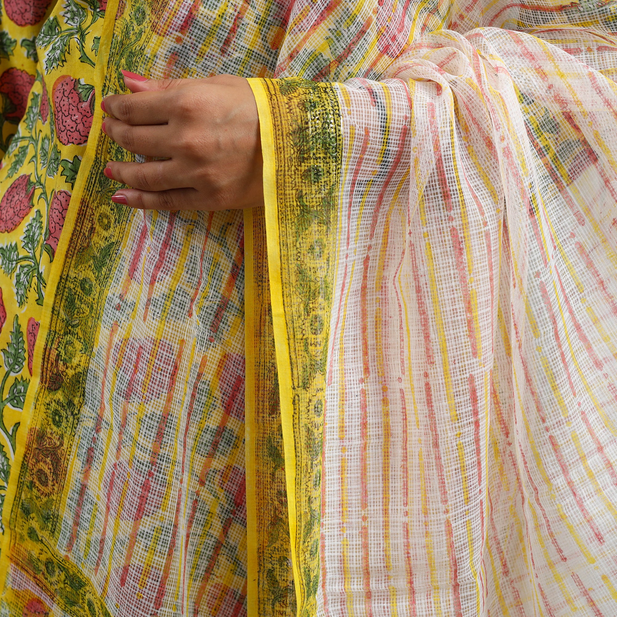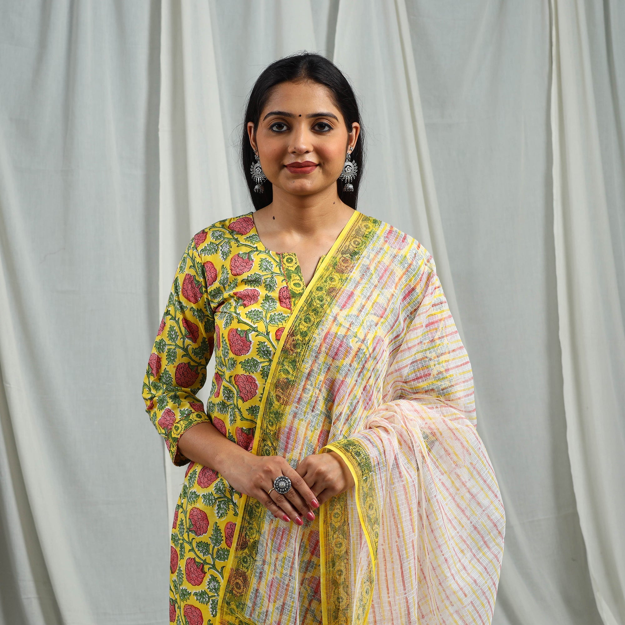 This yellow sanganeri block print cotton kurta set includes a comfortable kurta with a side pocket, matching palazzo pants with two pockets, and a lightweight kota doria dupatta. Designed for ease and everyday style, it’s a great pick for casual outings or festive wear. The sanganeri print and kota doria weave come from Rajasthan, celebrated for its rich textile traditions.