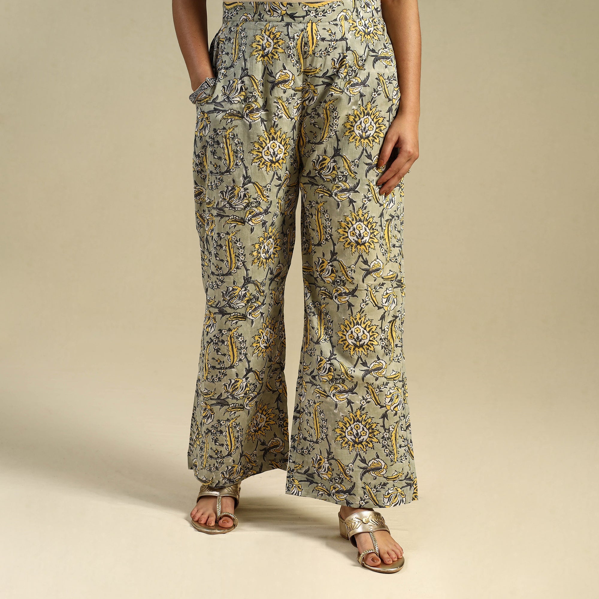 Crafted using traditional sanganeri hand block printing from Rajasthan, this green cotton palazzo offers breathable comfort and everyday elegance. Designed with soft cotton fabric, it features an elasticated waistband and two side pockets for ease. Ideal for daily wear or relaxed festive styling, it brings a touch of cultural charm to your wardrobe.